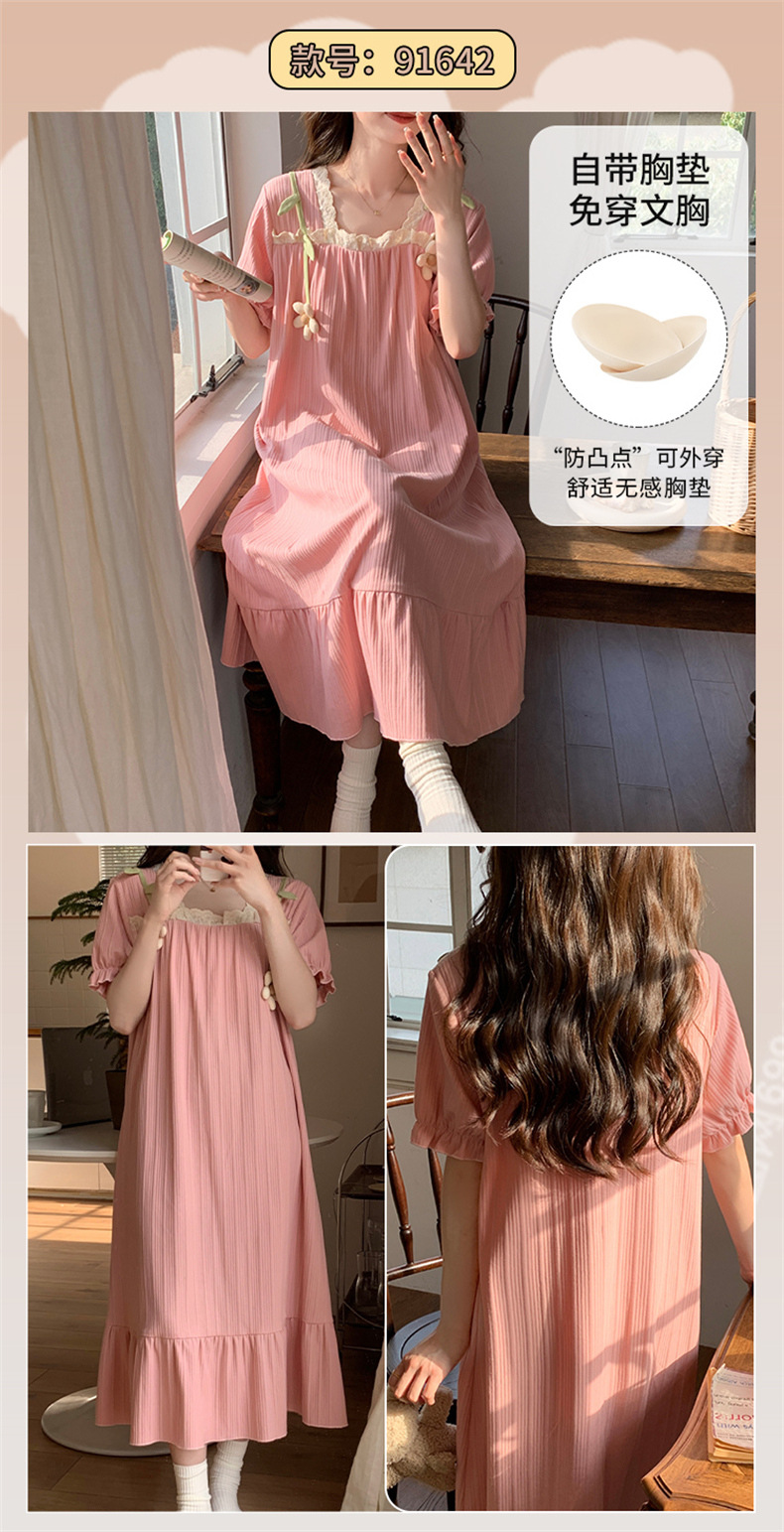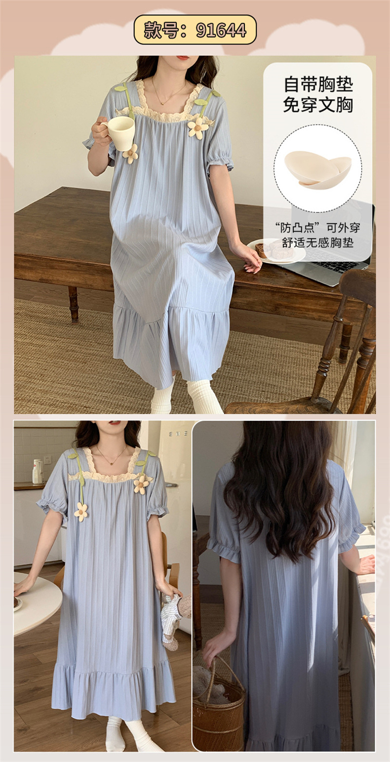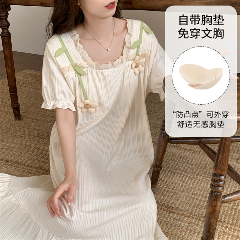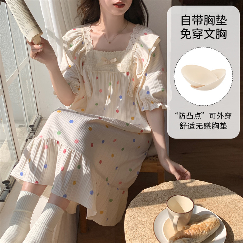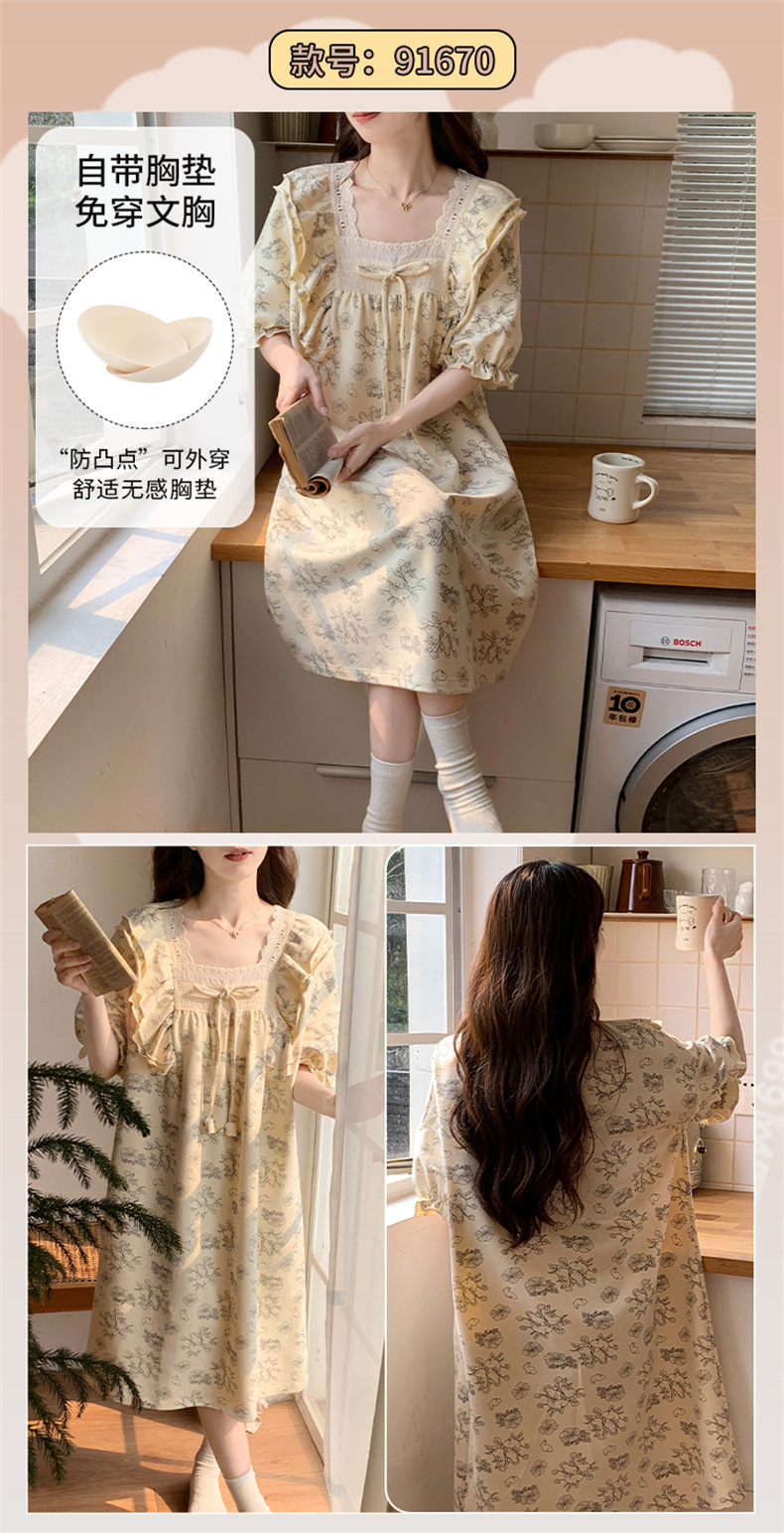 궁전 스타일 잠옷 여성 여름 반팔 모조 코튼 벨트 가슴 패드 나이트 드레스 중간 길이의 만화 캐주얼 플러스 사이즈 홈 옷스토어 가기