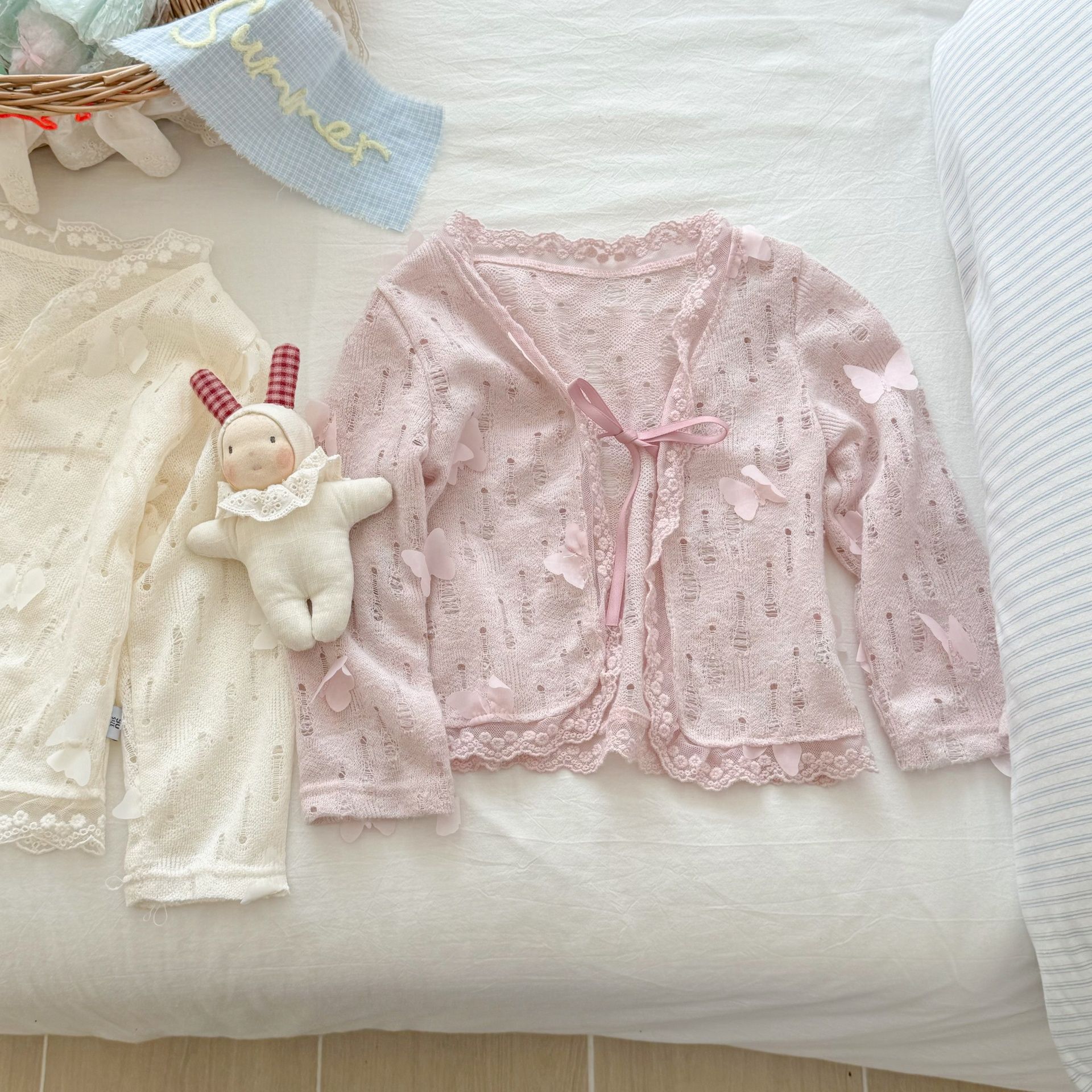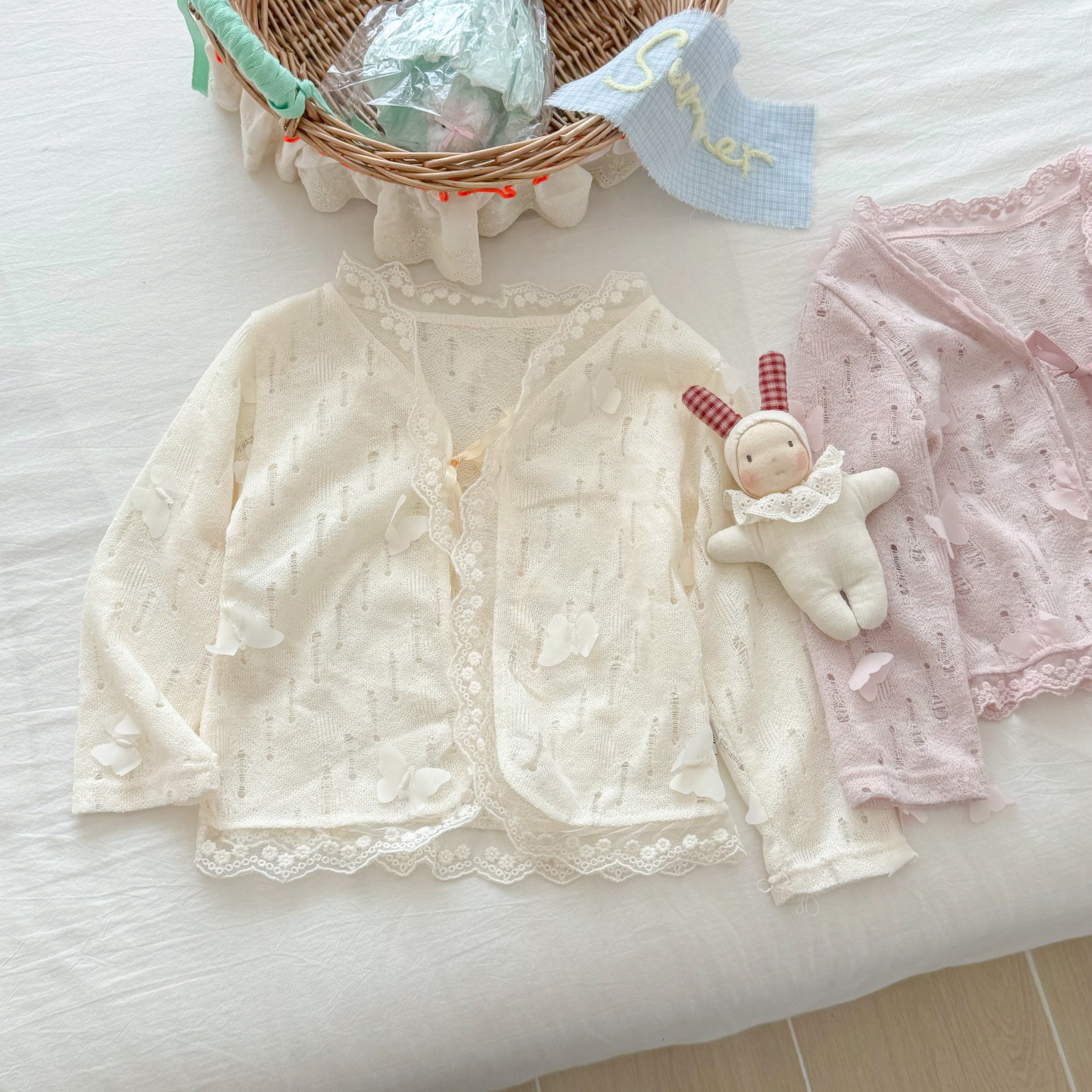 라임 아동복 여름 아기 소녀 아기 할로우 메쉬 레이스 카디건 긴팔 경량 올매치 스몰 재킷
