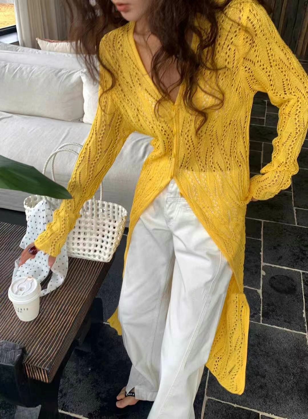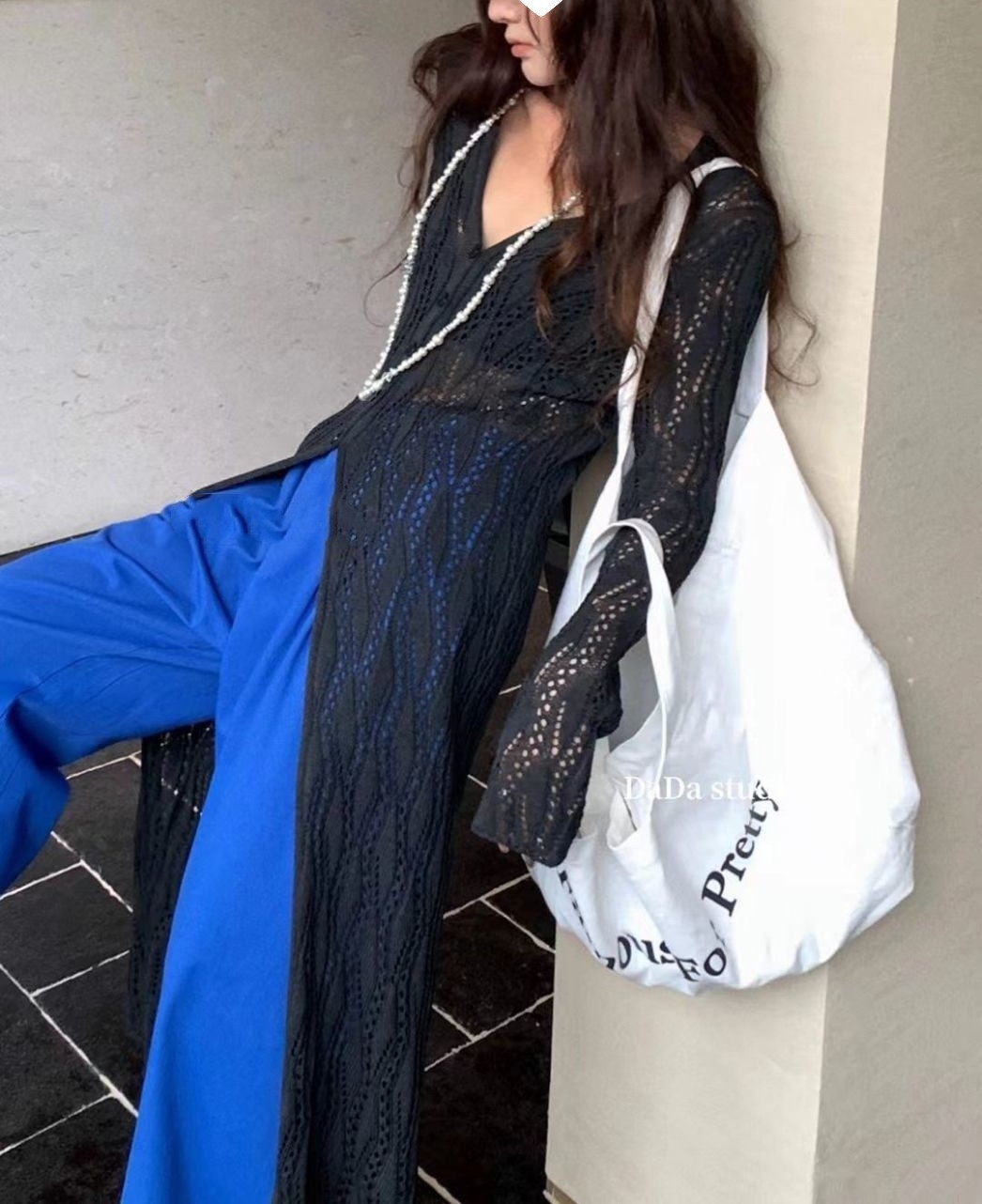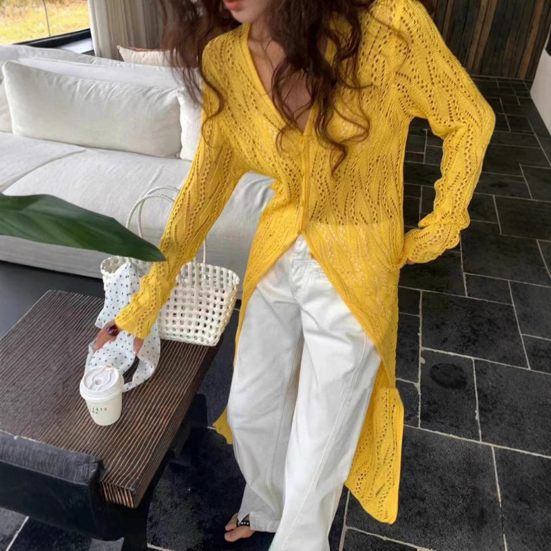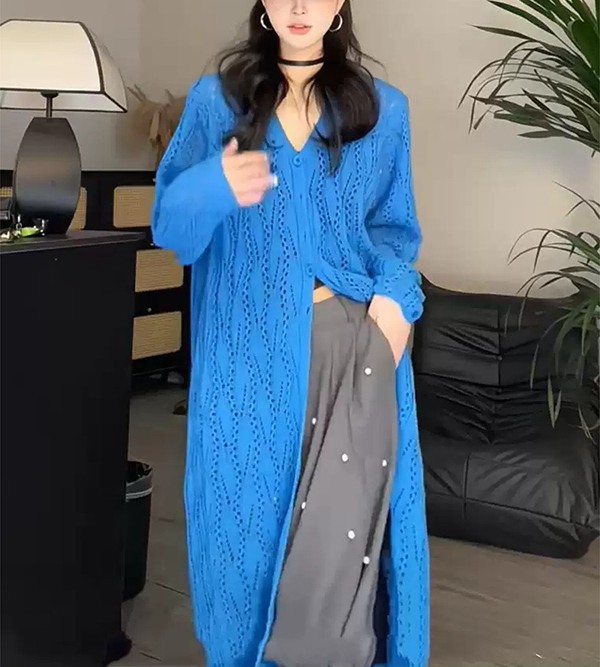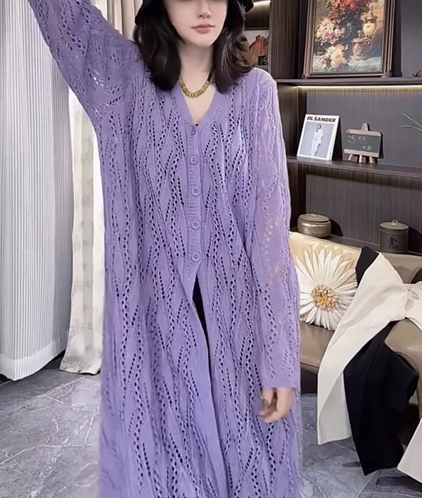 국경 간 여성 의류 2025 봄 여름 새로운 디자인 외부 니트 블라우스 루즈한 뚱뚱한 소녀의 긴 중공 가디건스토어 가기
