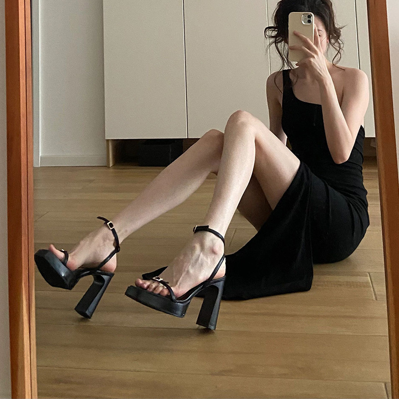 桃二桃2023朴彩英rose同款厚底防水台高跟鞋女一字带粗跟水钻凉鞋