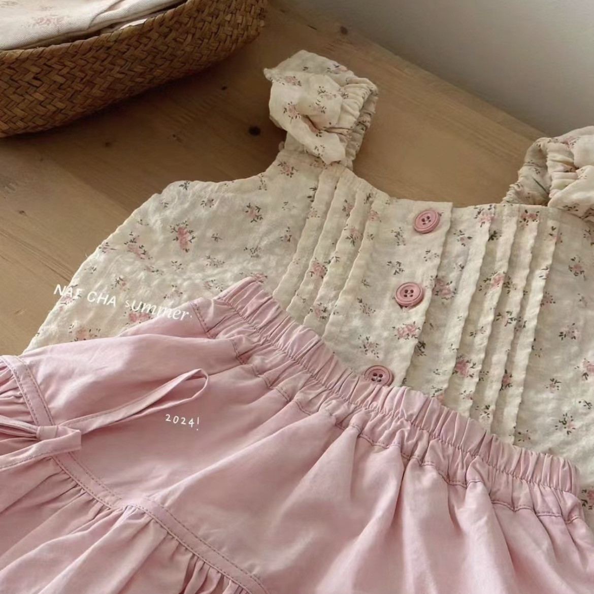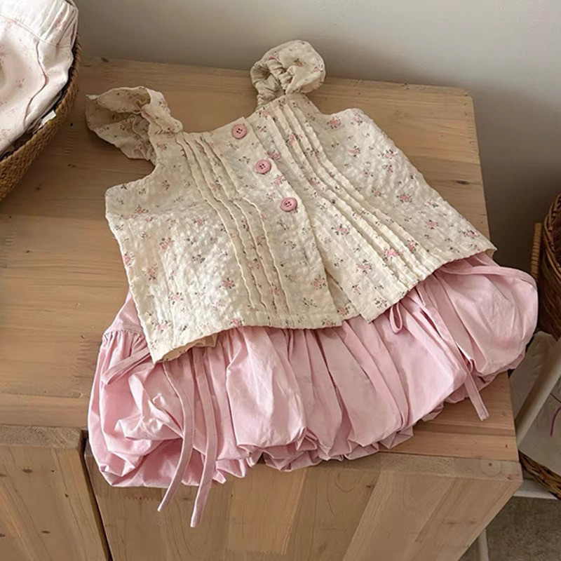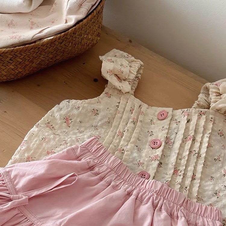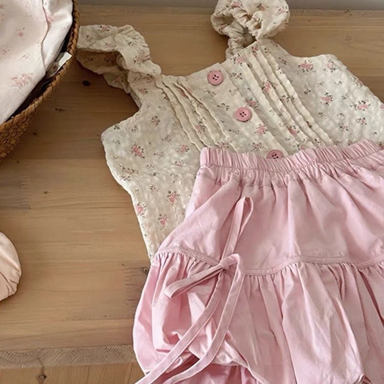 아기 소녀 투피스 소녀 정장 새로운 꽃 조끼 한국 스타일 달콤한 민소매 탑 꽃 버드 반바지스토어 가기