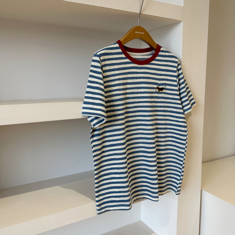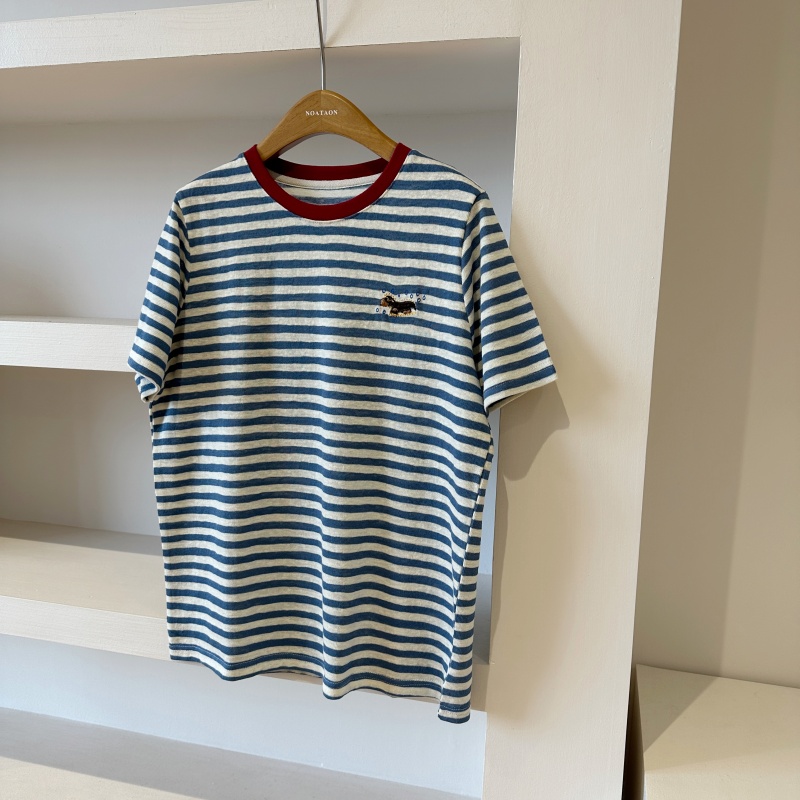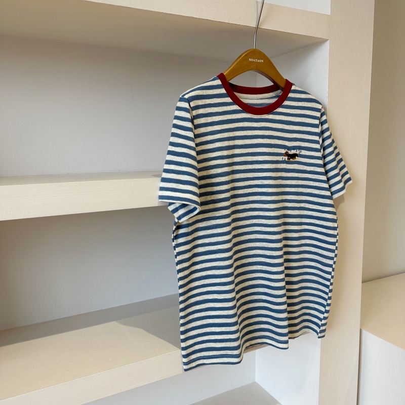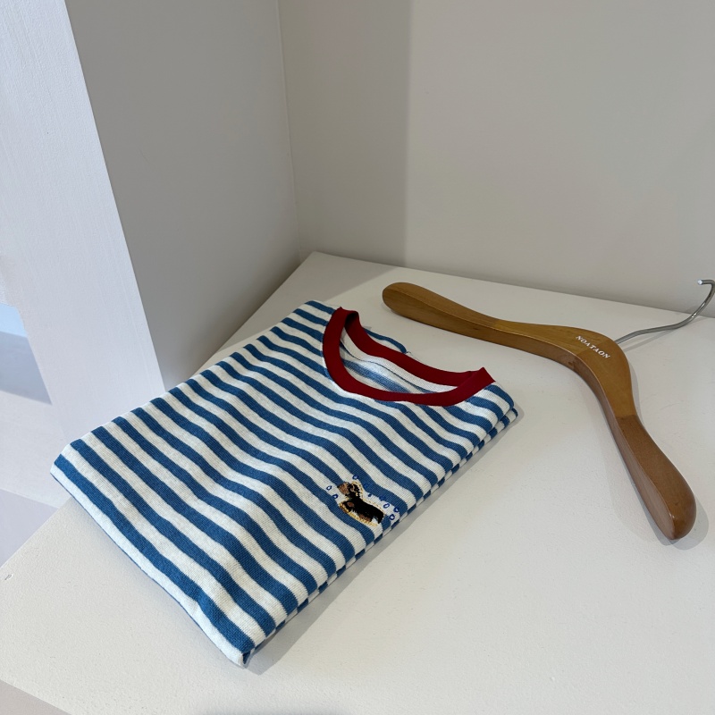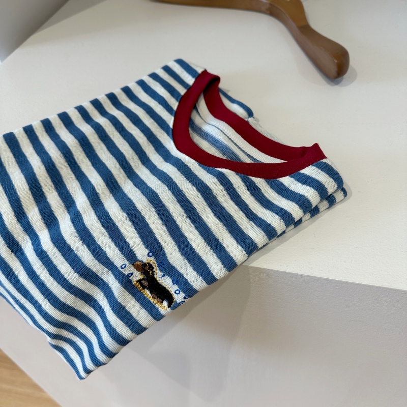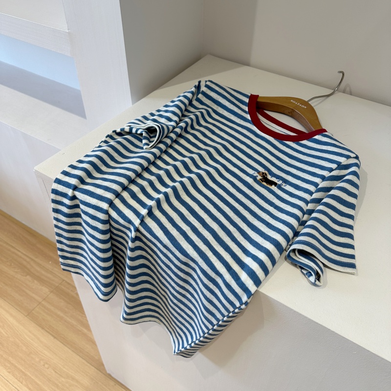 2025 년 여름 얇은 신선한 대비 색상 연령 감소 자수 느슨한 둥근 목 반팔 티셔츠 여성베이스 티셔츠스토어 가기