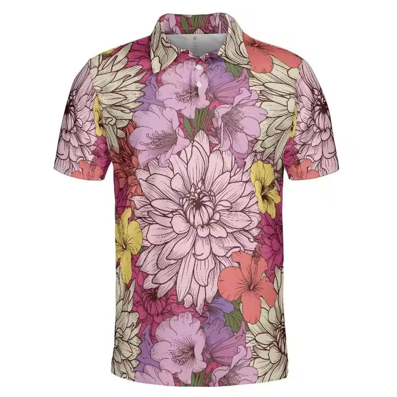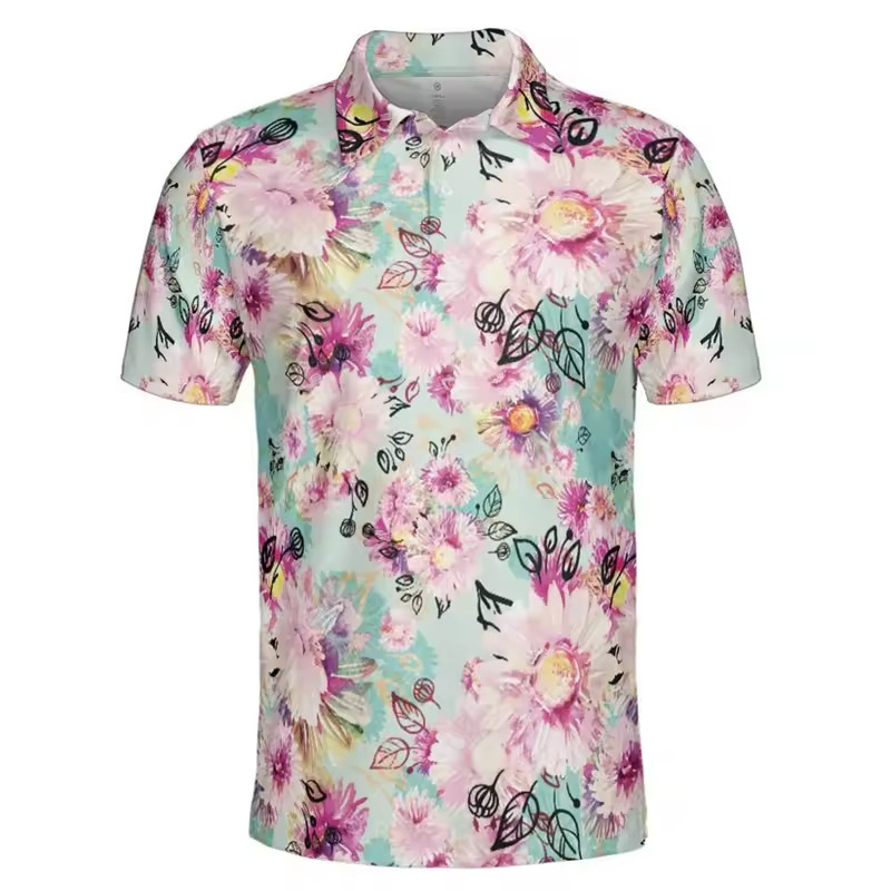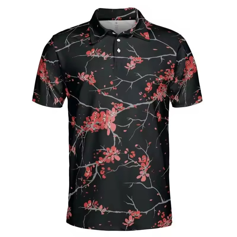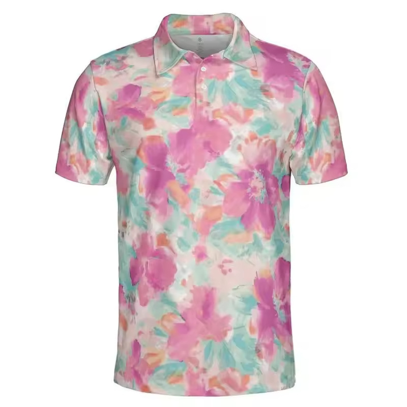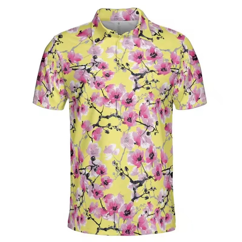핑크 벚꽃 폴로 셔츠 남자의 야외 캐주얼 꽃 공장 인쇄 통기성 골프 셔츠 하라주쿠 유행 여름