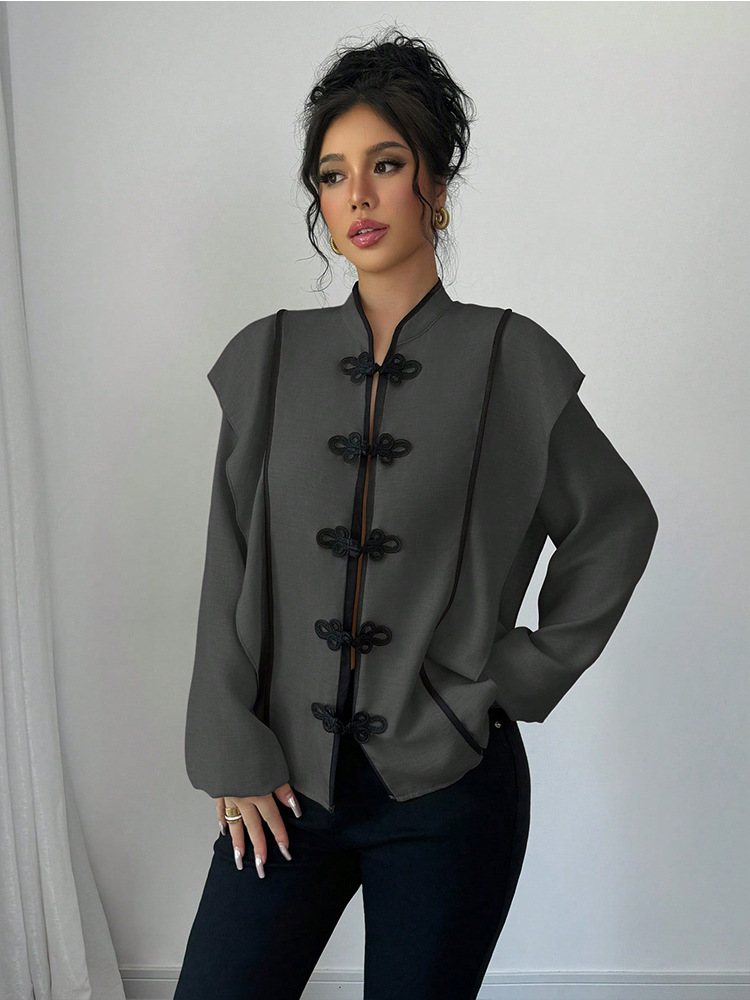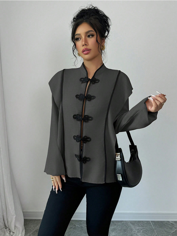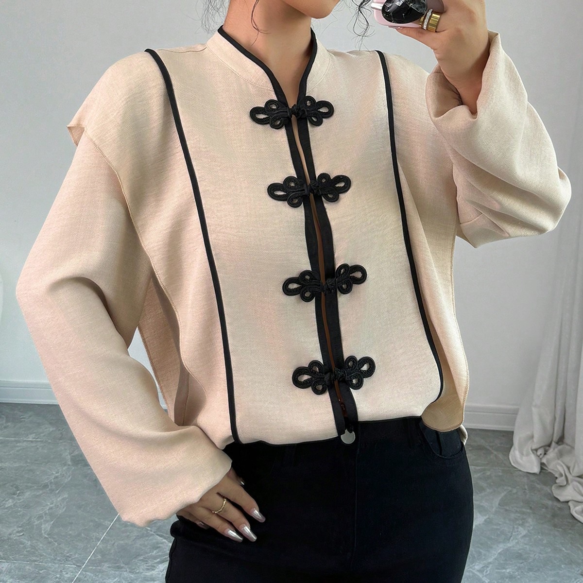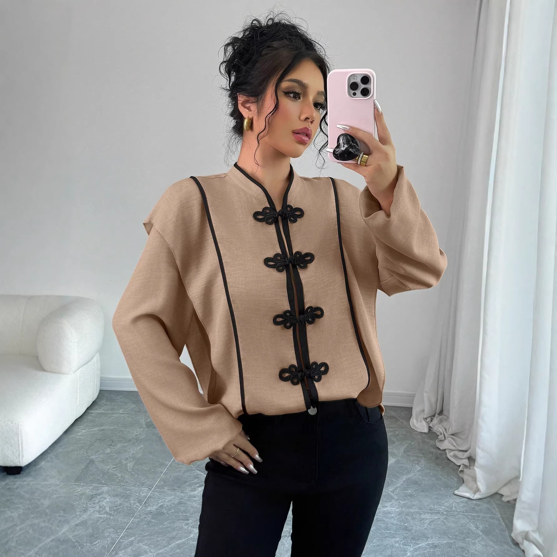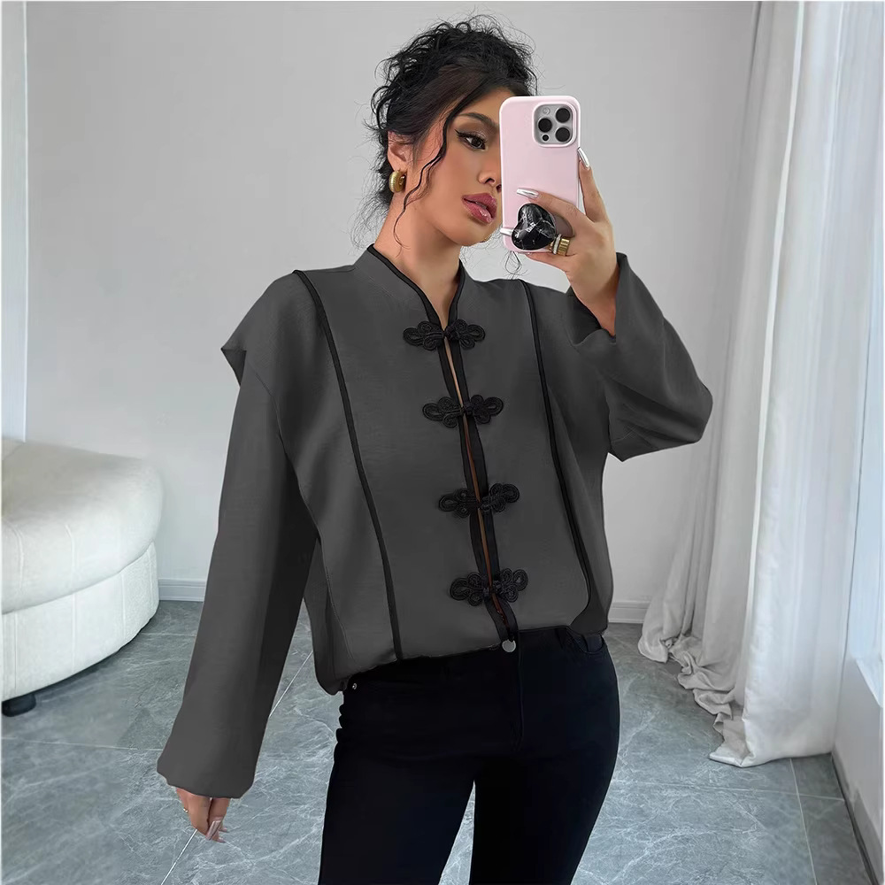 아마존 유럽 및 미국 해외배송 신상 여성 셔츠 중국식 매듭 디자인 민족풍 긴팔 상의