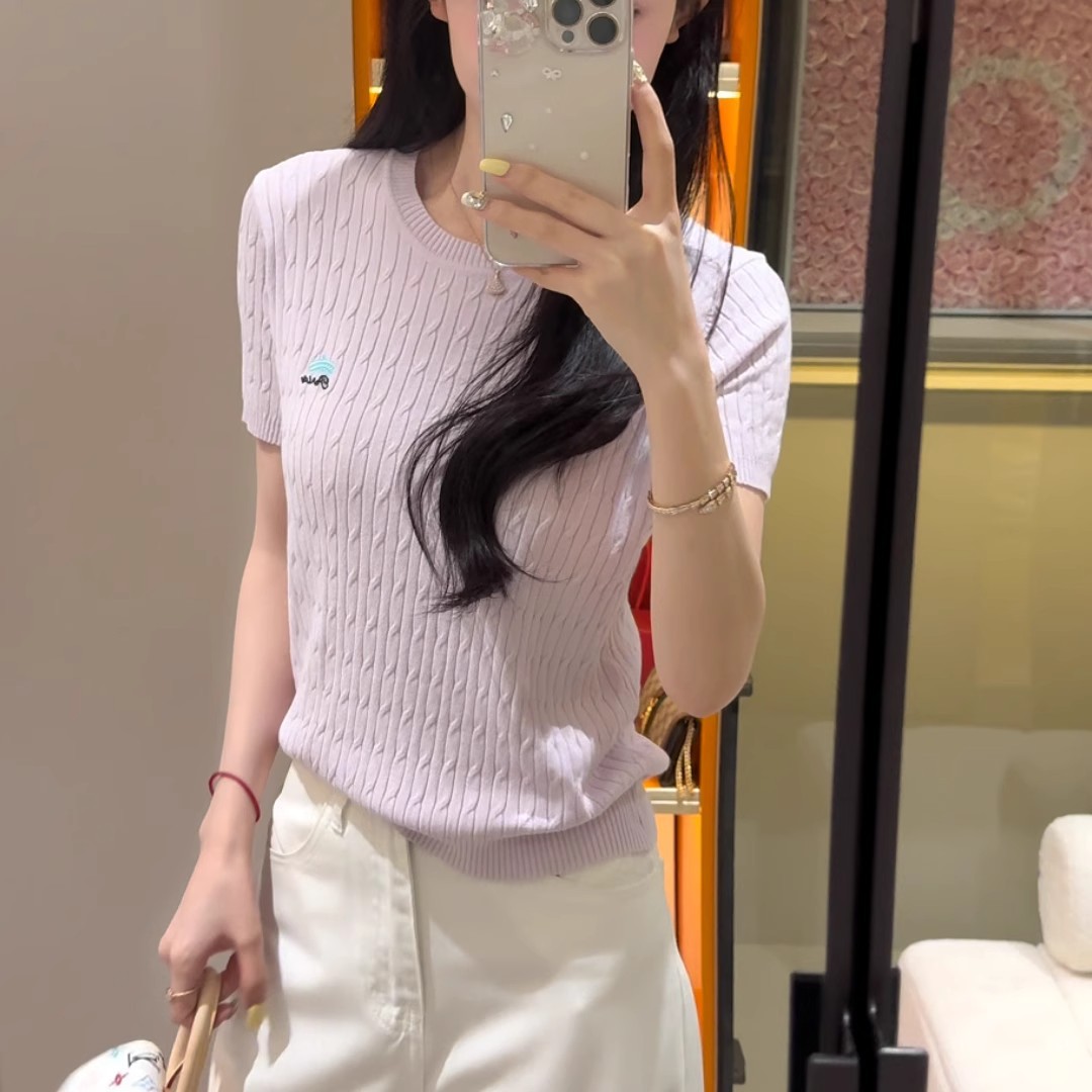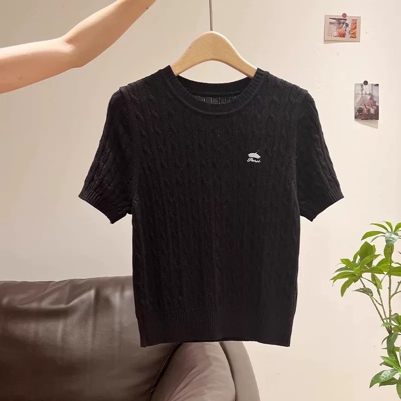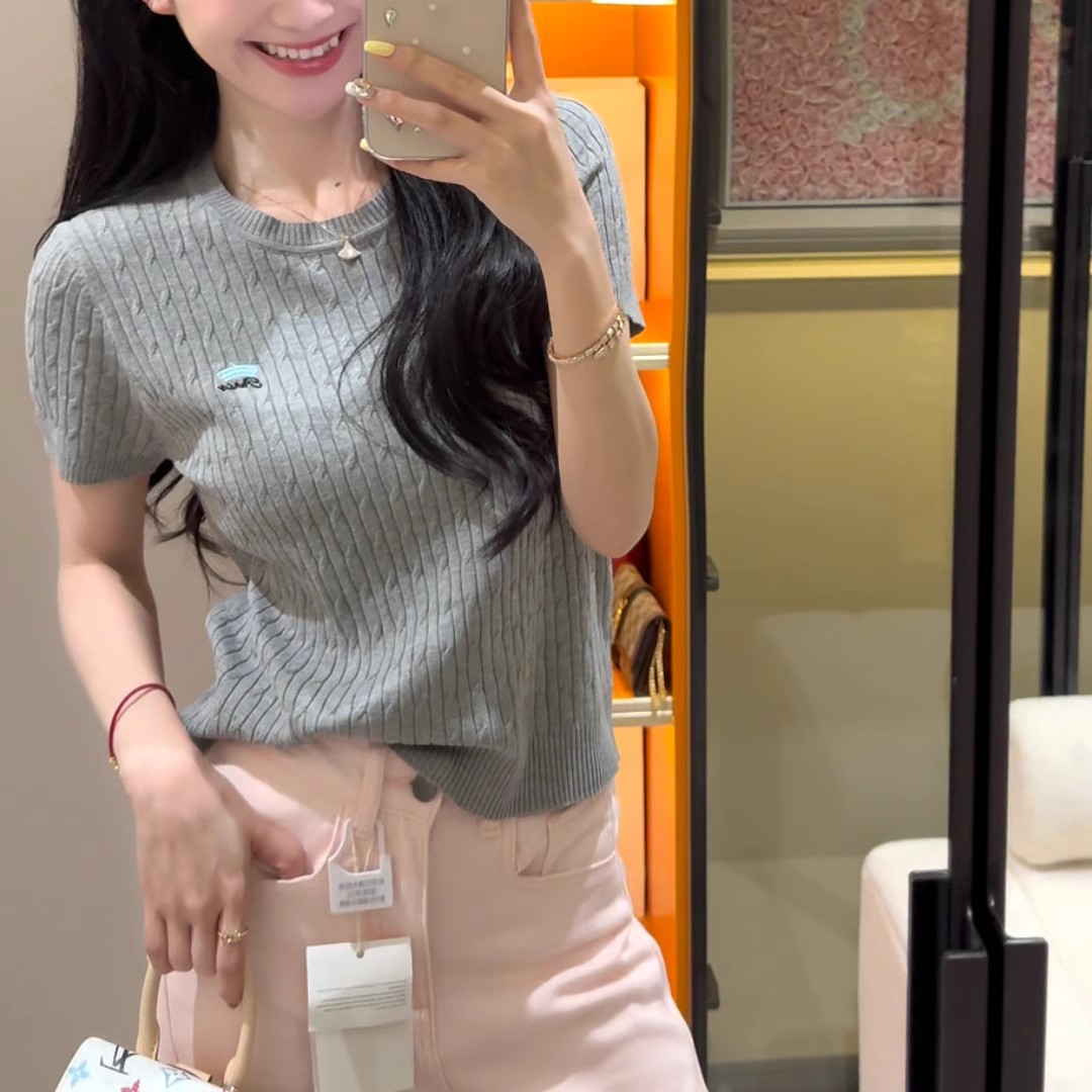 여름 뉴 앤디 벨벳 트위스트 자수 라운드 넥 반팔 티셔츠 니트 셔츠 올 매치 심플 패션 풀오버 탑 여성스토어 가기