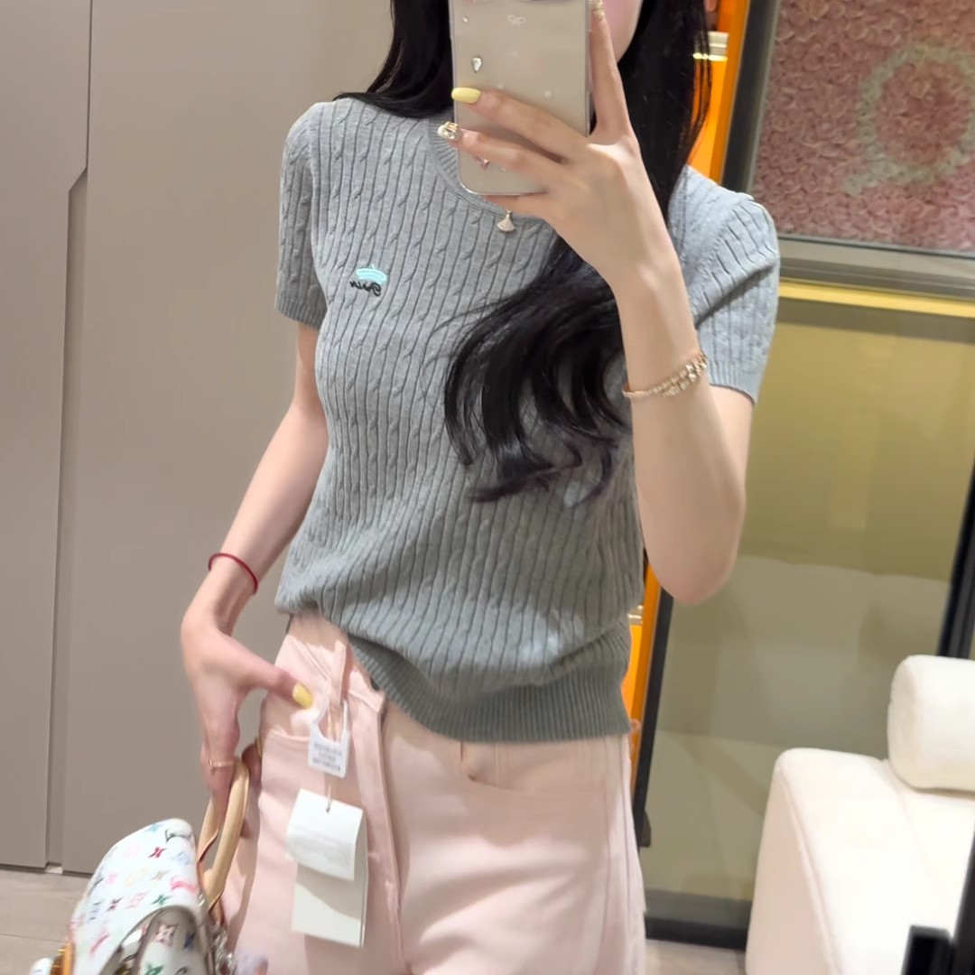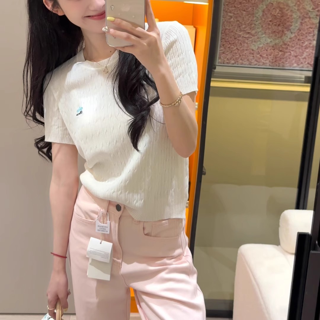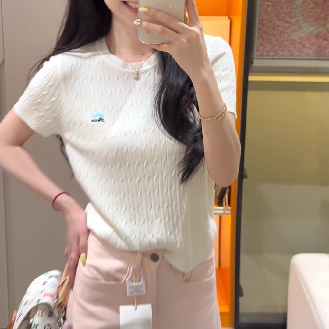 여름 뉴 앤디 벨벳 트위스트 자수 라운드 넥 반팔 티셔츠 니트 셔츠 올 매치 심플 패션 풀오버 탑 여성스토어 가기