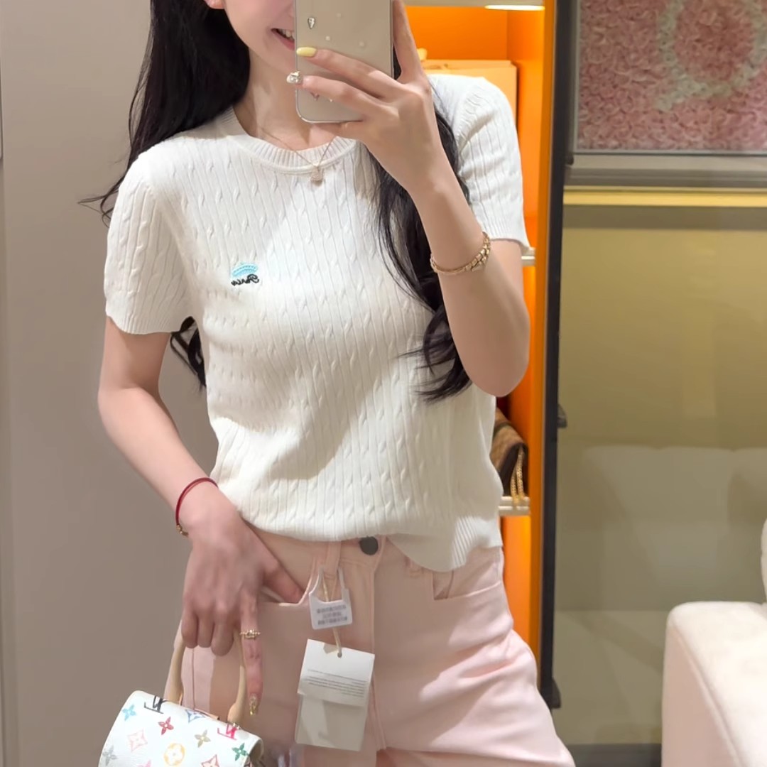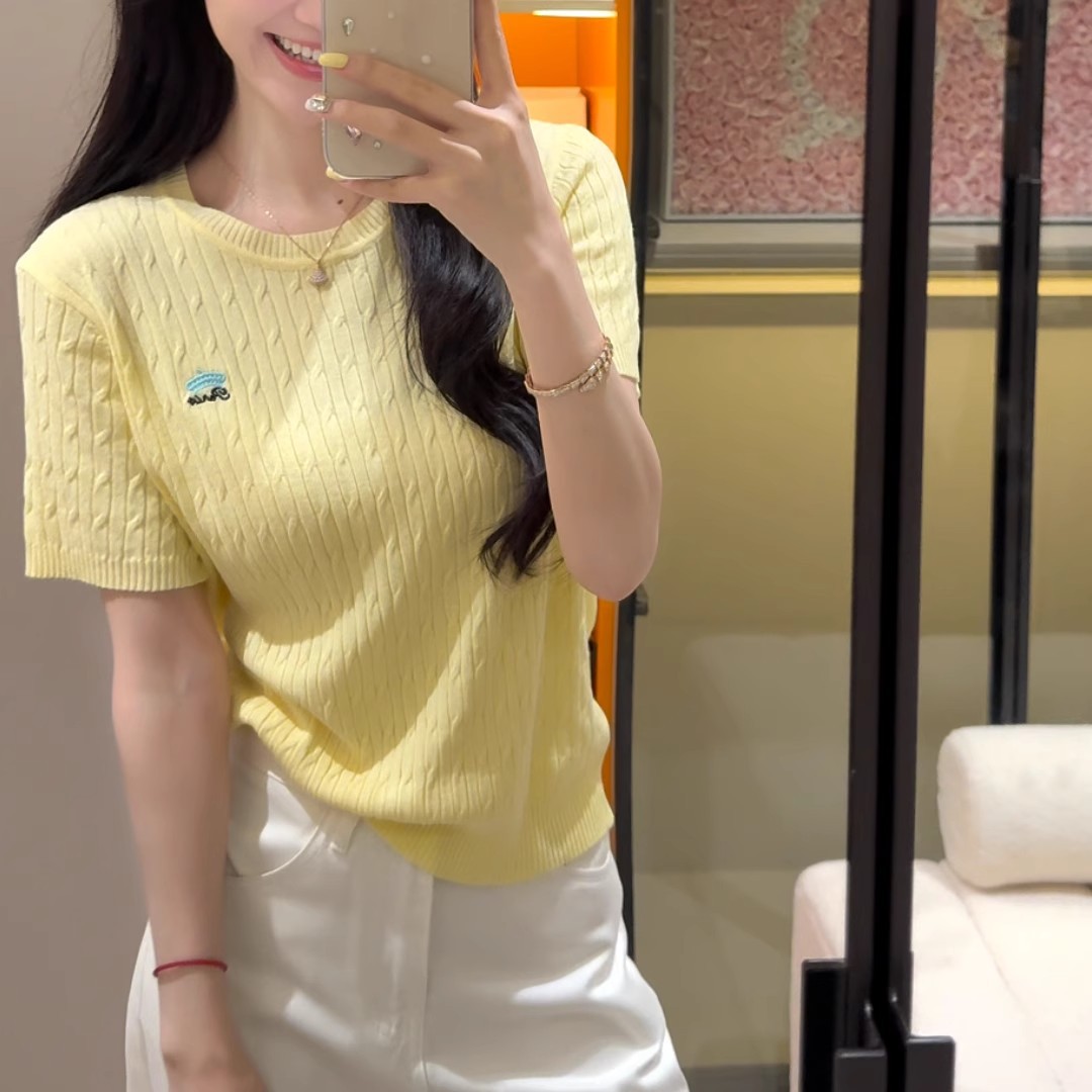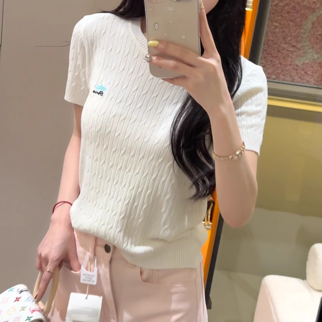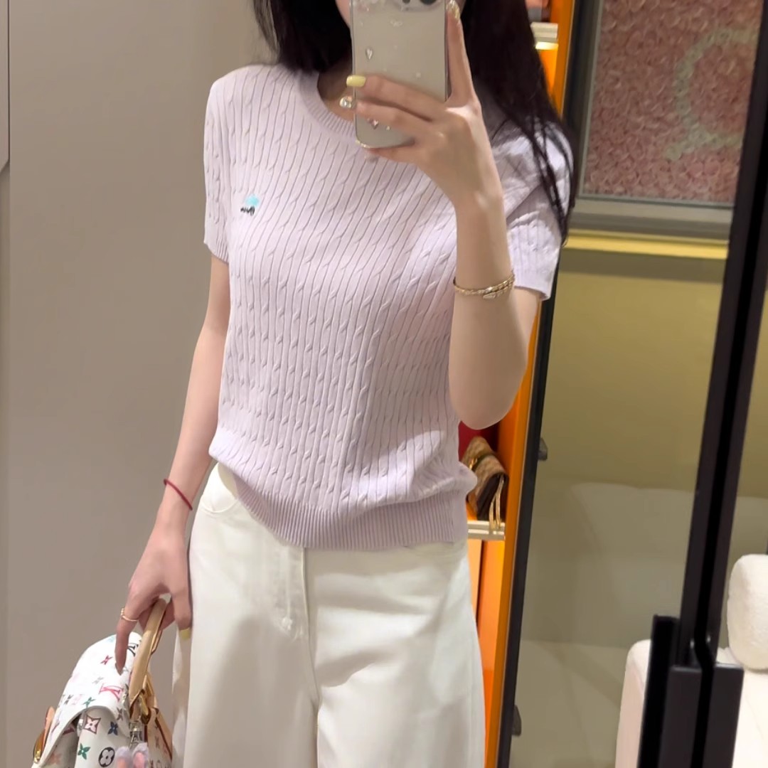 여름 뉴 앤디 벨벳 트위스트 자수 라운드 넥 반팔 티셔츠 니트 셔츠 올 매치 심플 패션 풀오버 탑 여성