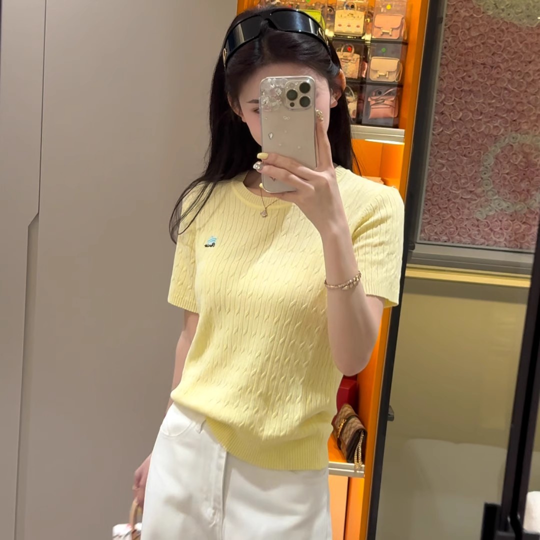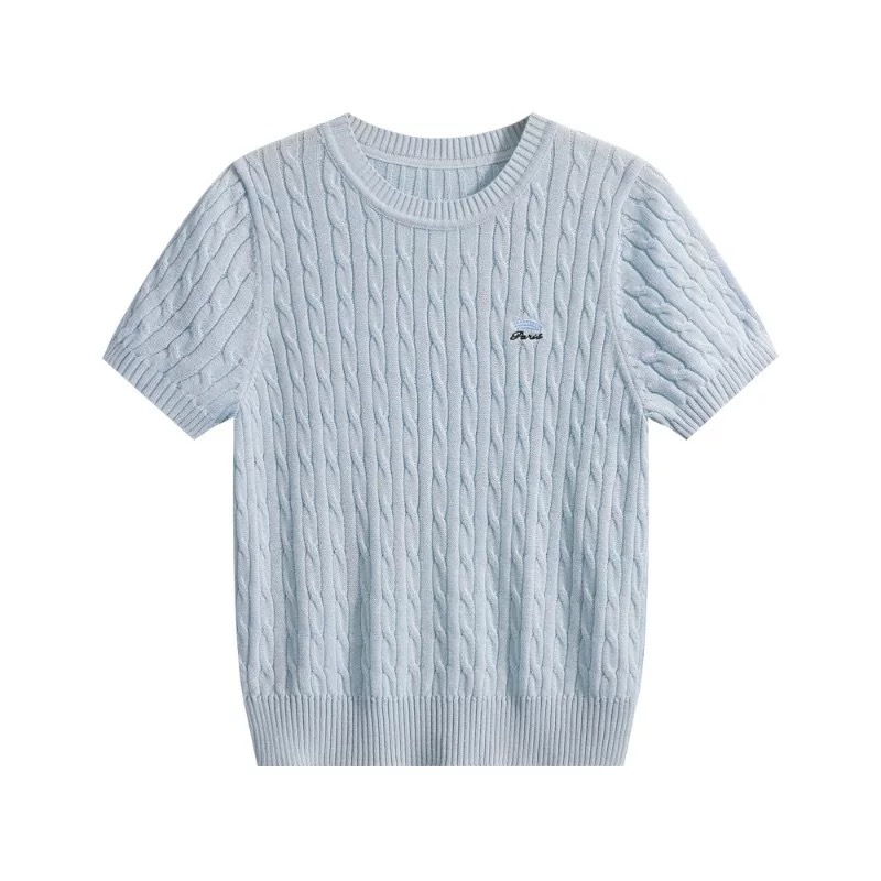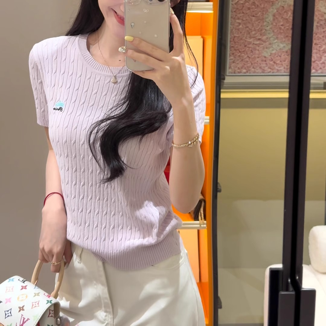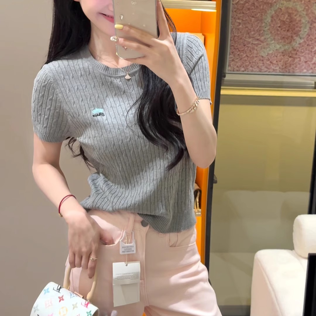 여름 뉴 앤디 벨벳 트위스트 자수 라운드 넥 반팔 티셔츠 니트 셔츠 올 매치 심플 패션 풀오버 탑 여성