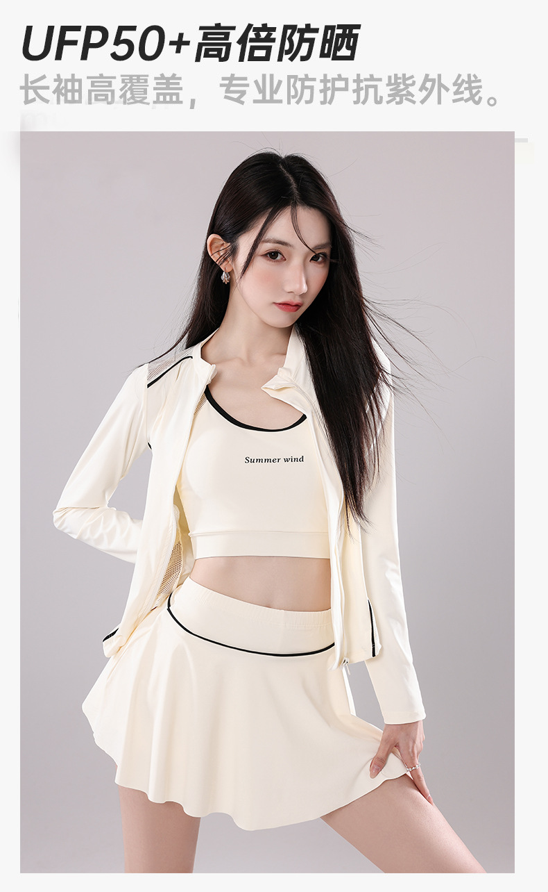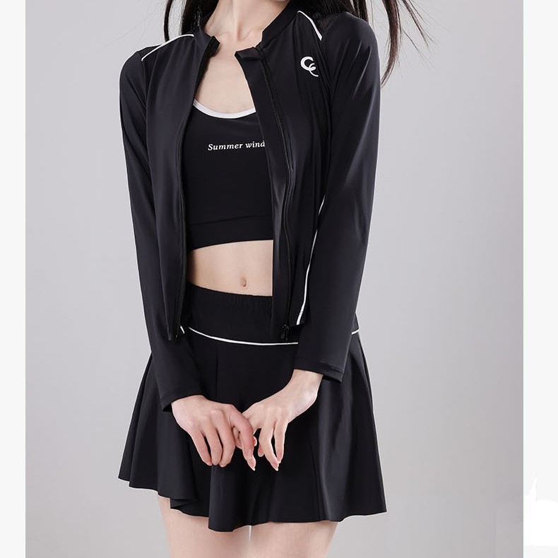 여성용 잠수복 지퍼 수영복, 긴팔 바지, 스커트가 있는 자외선 차단, 보수적이고 슬림하며 배를 덮는 3피스 서핑 해파리 슈트스토어 가기