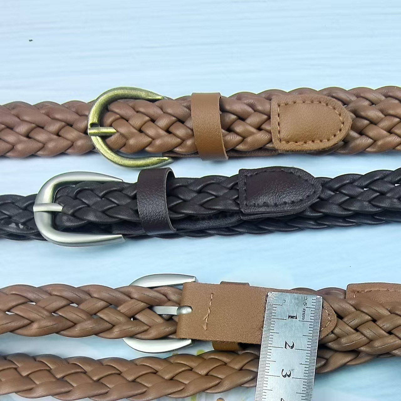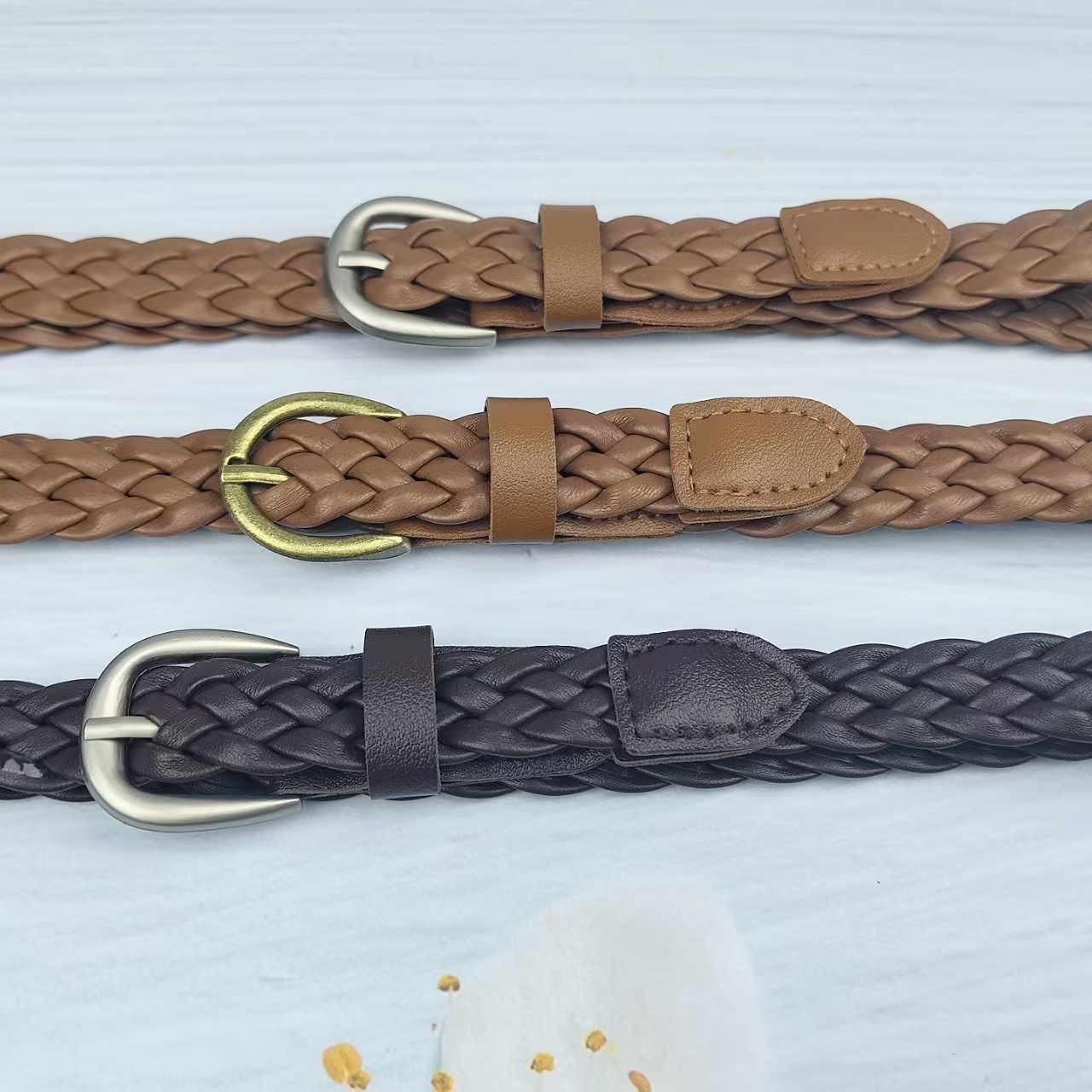 여성을 위한 새로운 스타일의 브라운 우븐 벨트, 다재다능한 복고풍 핸드 우븐 실버 핀 버클 벨트, 청바지 및 캐주얼 바지 벨트스토어 가기