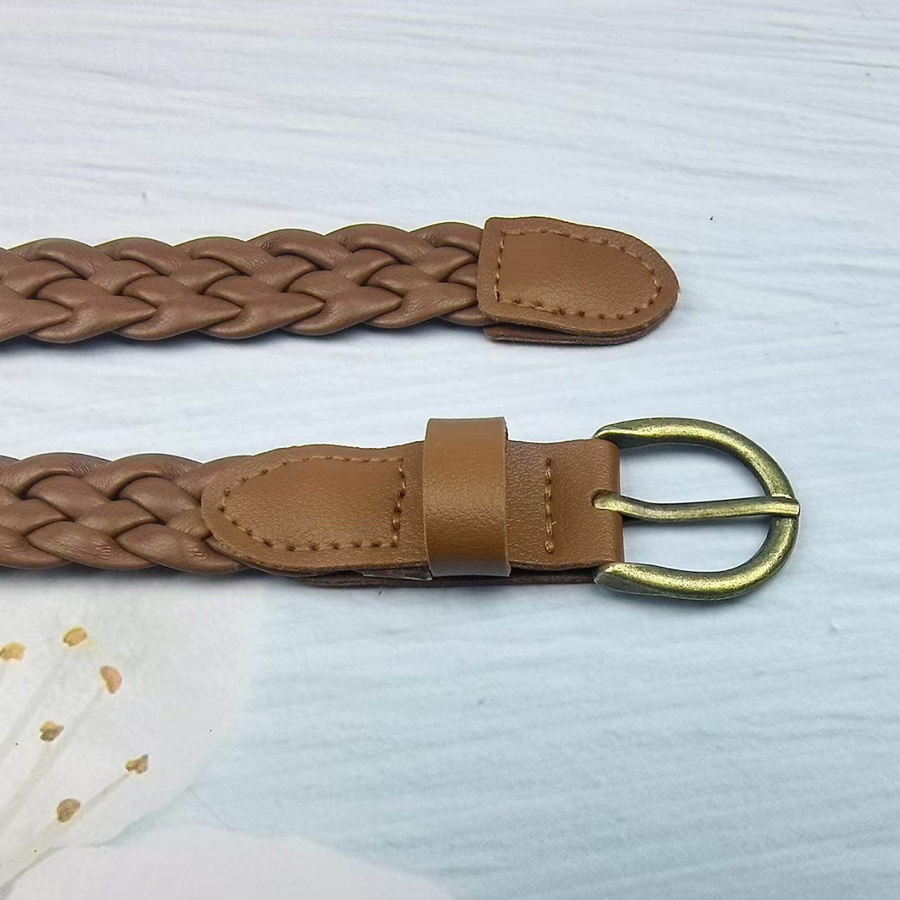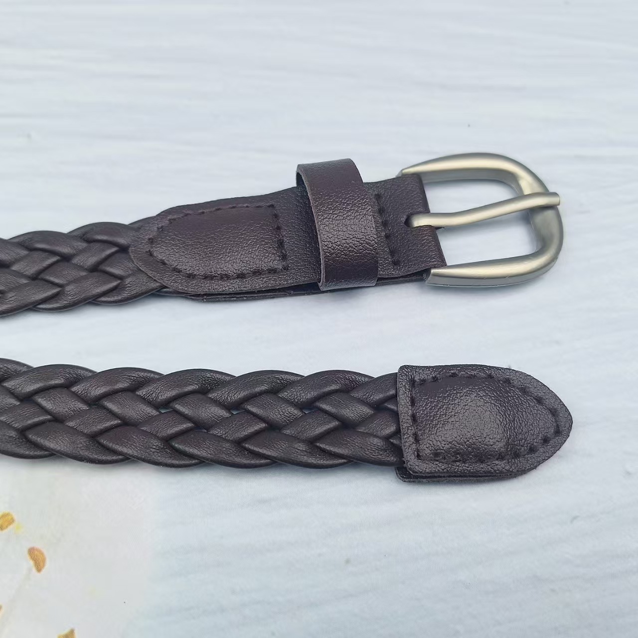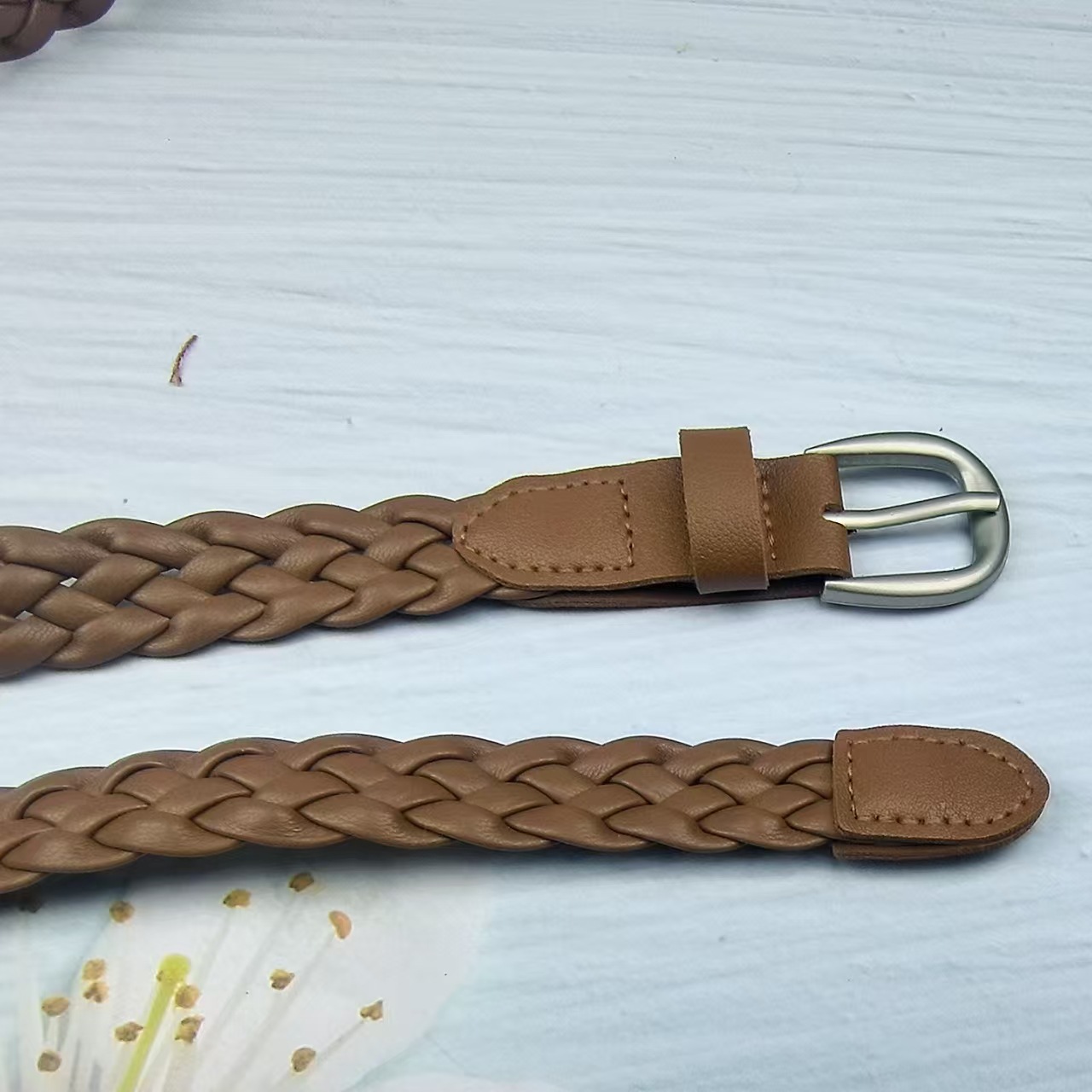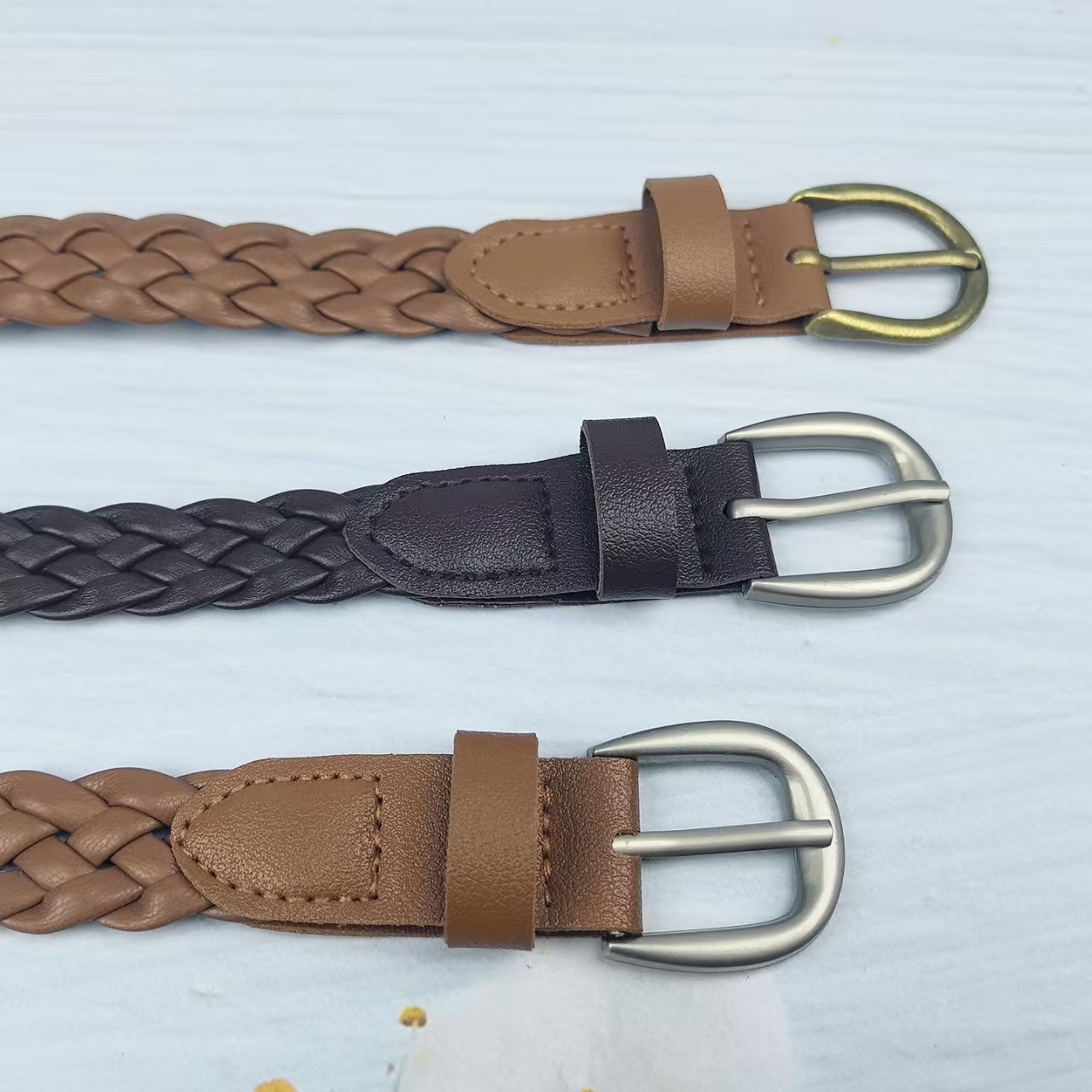 여성을 위한 새로운 스타일의 브라운 우븐 벨트, 다재다능한 복고풍 핸드 우븐 실버 핀 버클 벨트, 청바지 및 캐주얼 바지 벨트