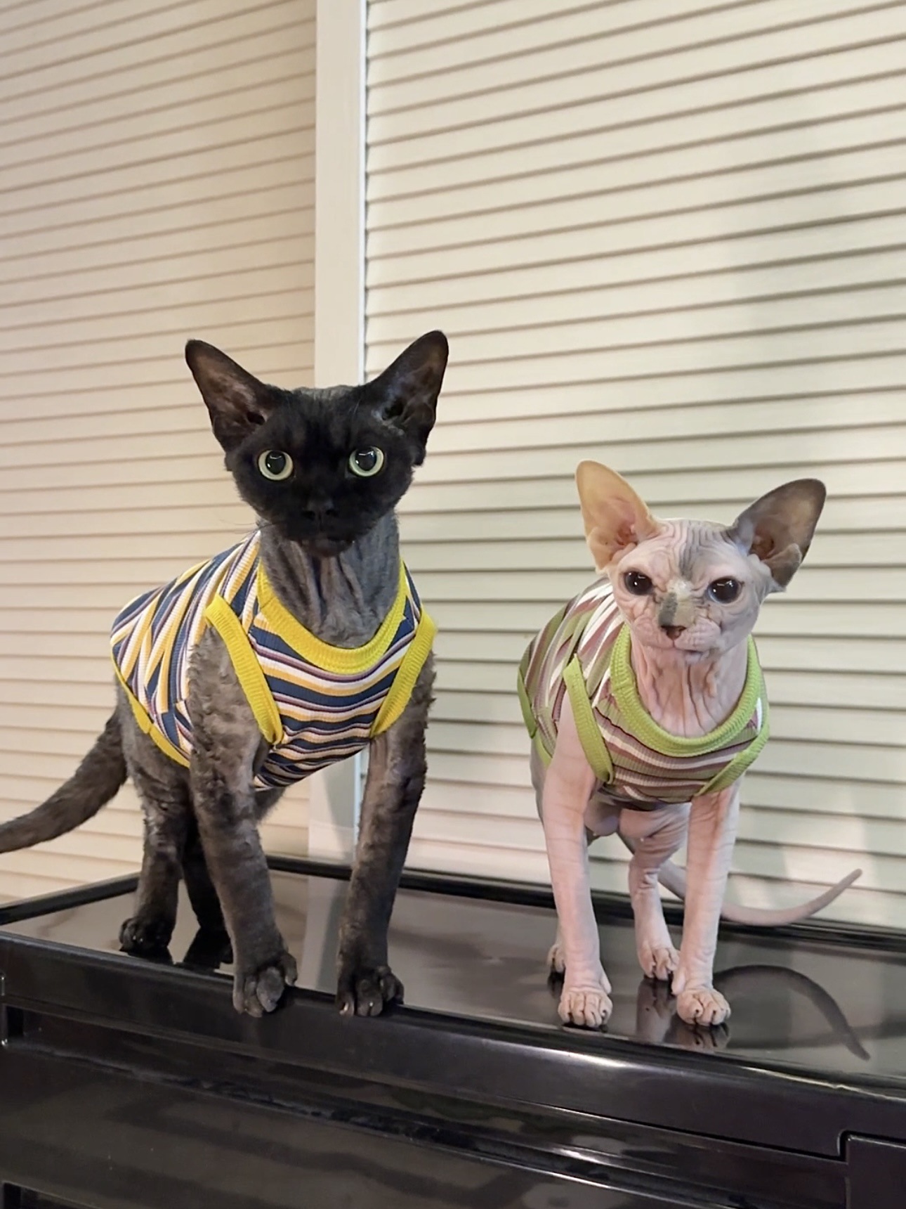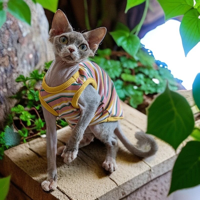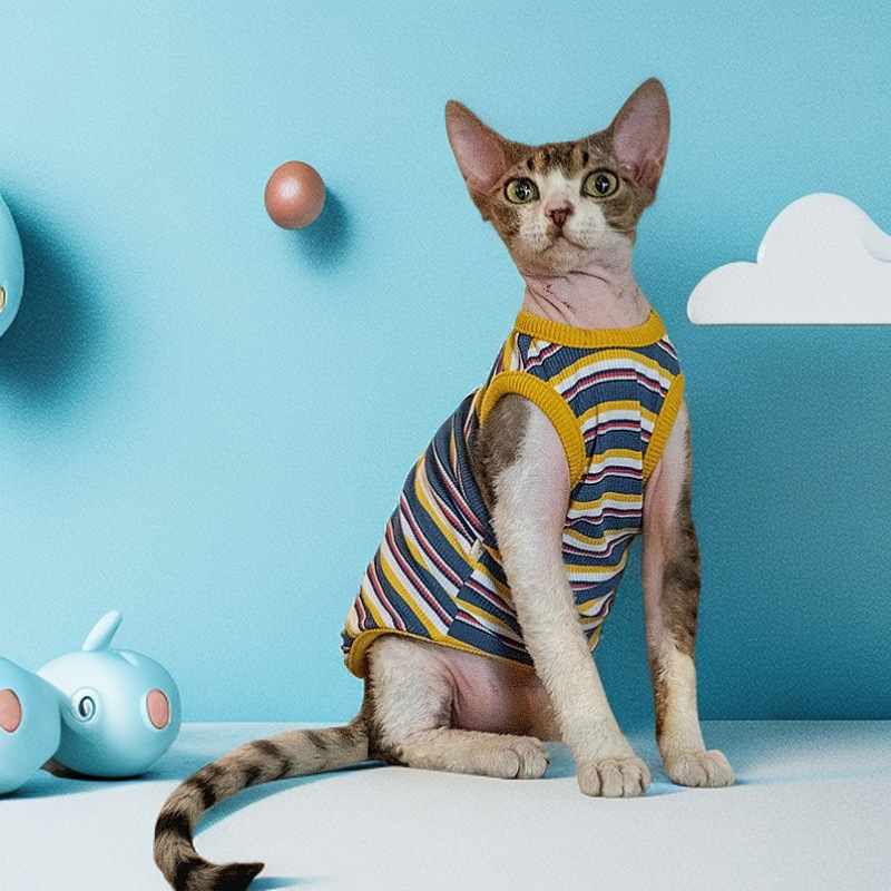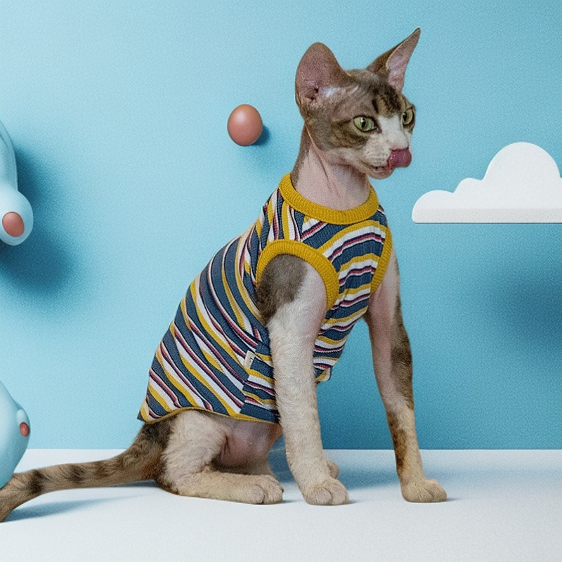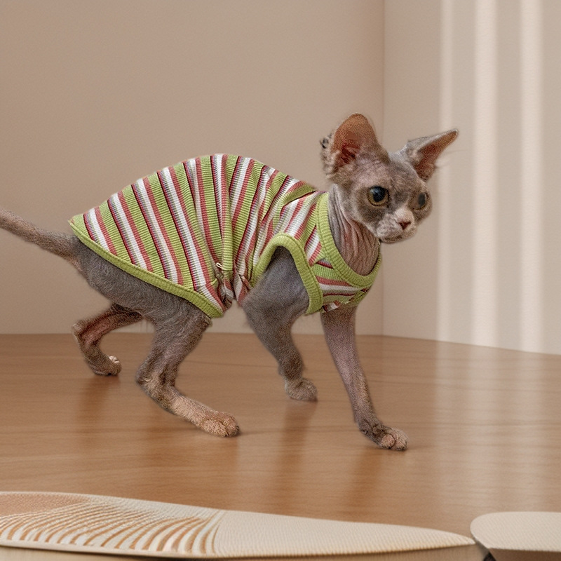 털이 없는 고양이용 독일산 애완동물 옷, 핑크스 고양이용 세련된 스트라이프 탄성 조끼, 세 가지 색상, 털빠짐 방지 스트라이프 조끼스토어 가기