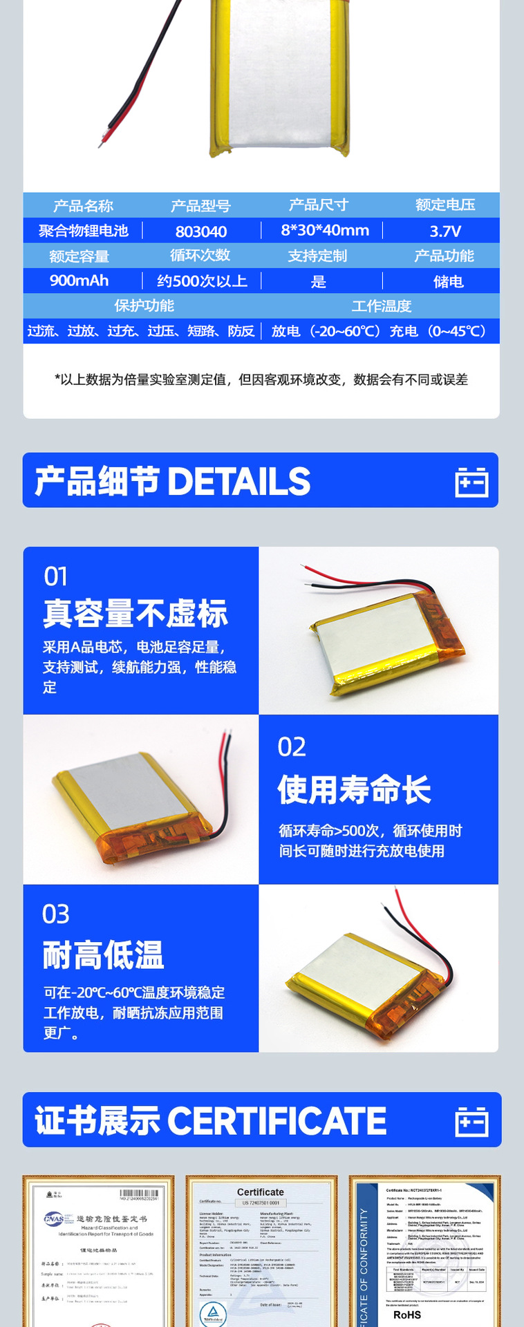 도매 803040 폴리머 리튬 배터리 3.7V900mAh 다중 용량 디지털 장난감 스피커 미용 기기 배터리스토어 가기
