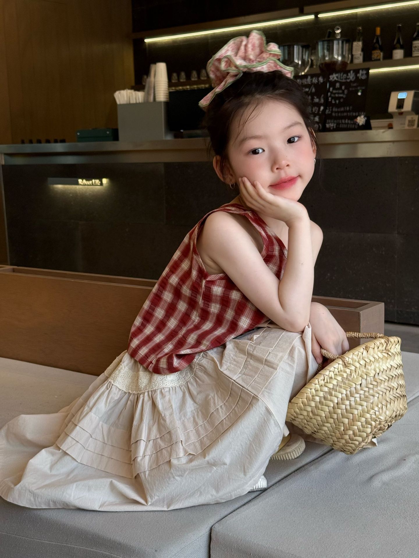 2025 여름 신작 한국 스타일 아동복 소녀 민소매 격자 무늬 조끼 아기 유행 격자 무늬 탑