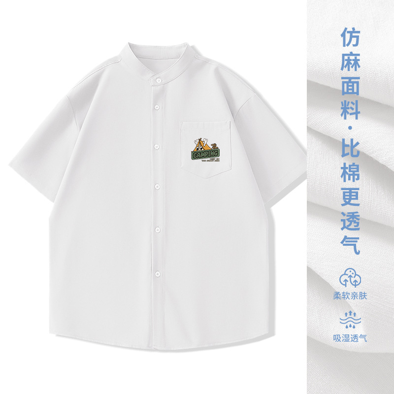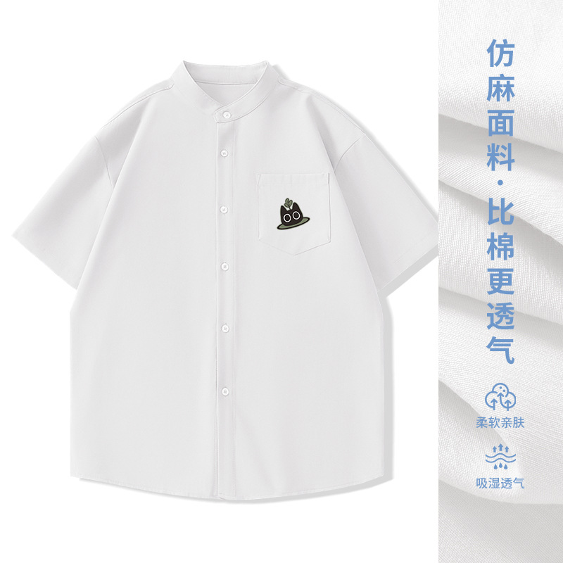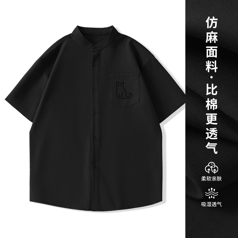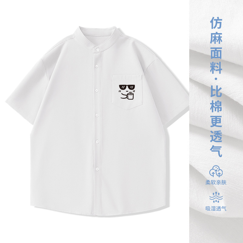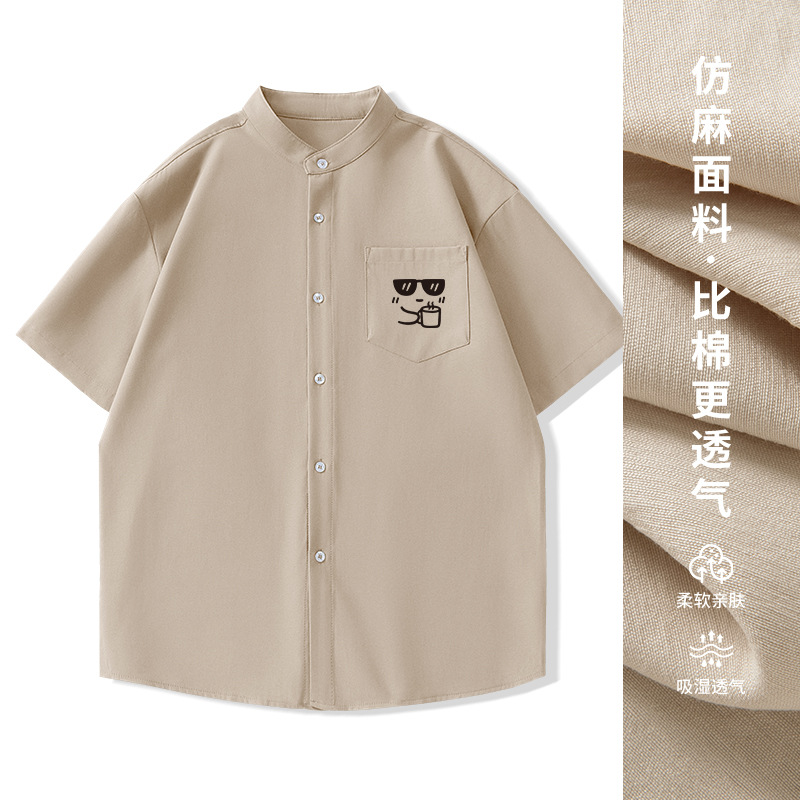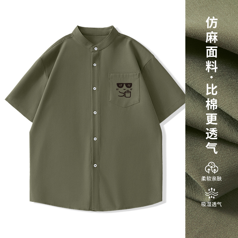 일본 복고풍 스탠드 칼라 반팔 셔츠 모조 린넨 캐주얼 재미 프린트 탑 여름 얇은 느슨한 남성 셔츠