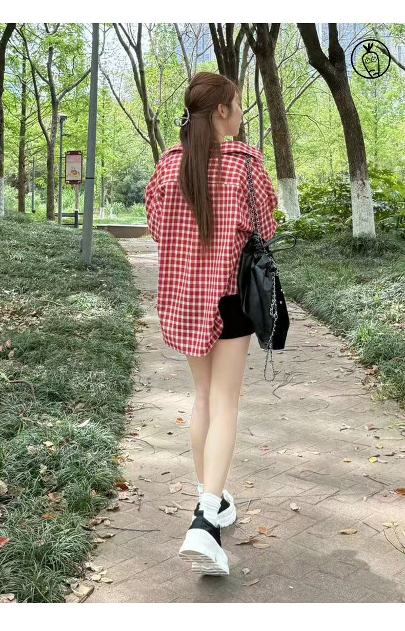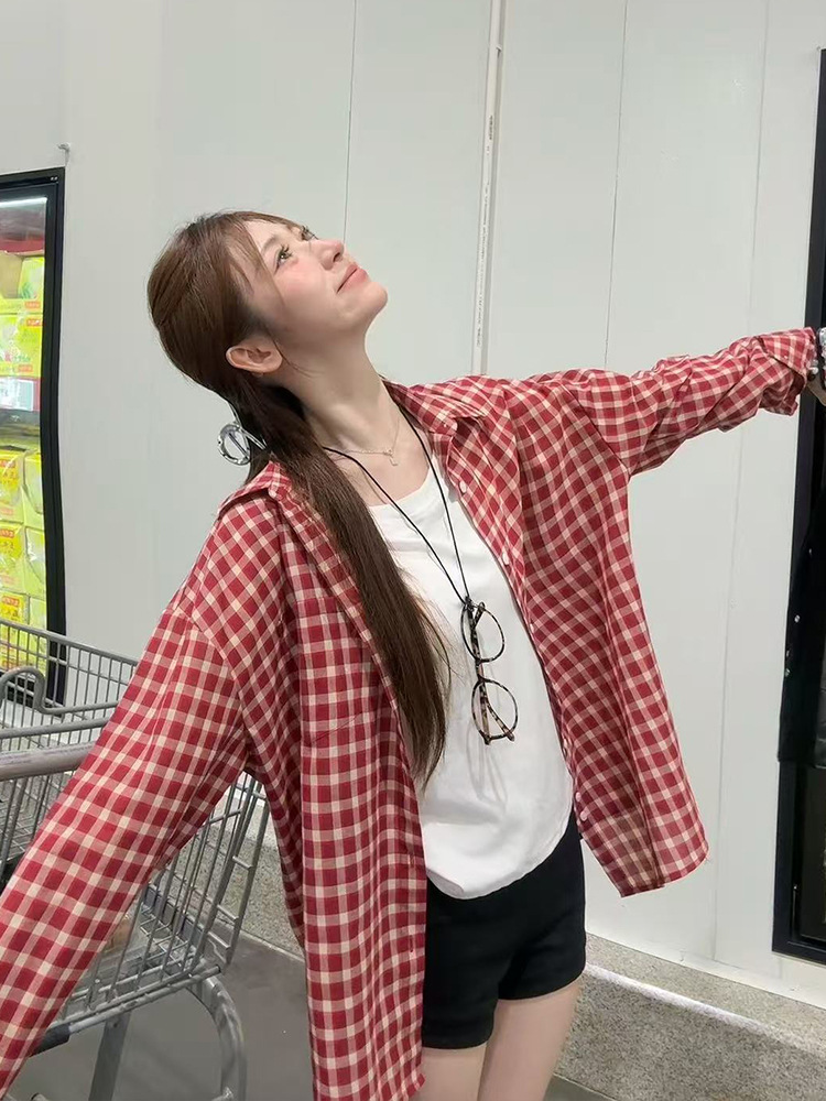 무 아저씨 빨간 격자 무늬 긴팔 셔츠 탑 여성의 여름 얇은 레트로 게으른 스타일 느슨한 태양 보호 재킷