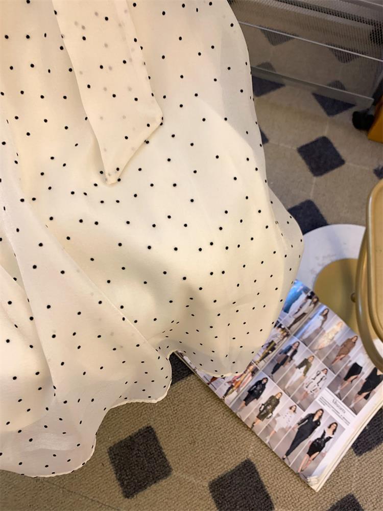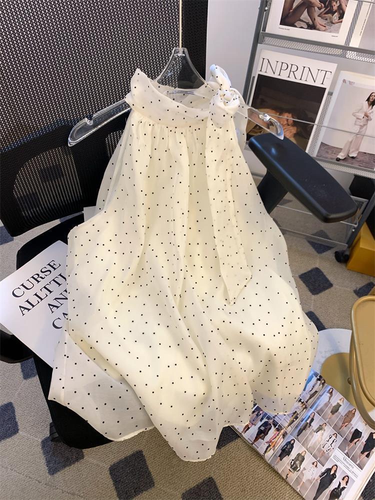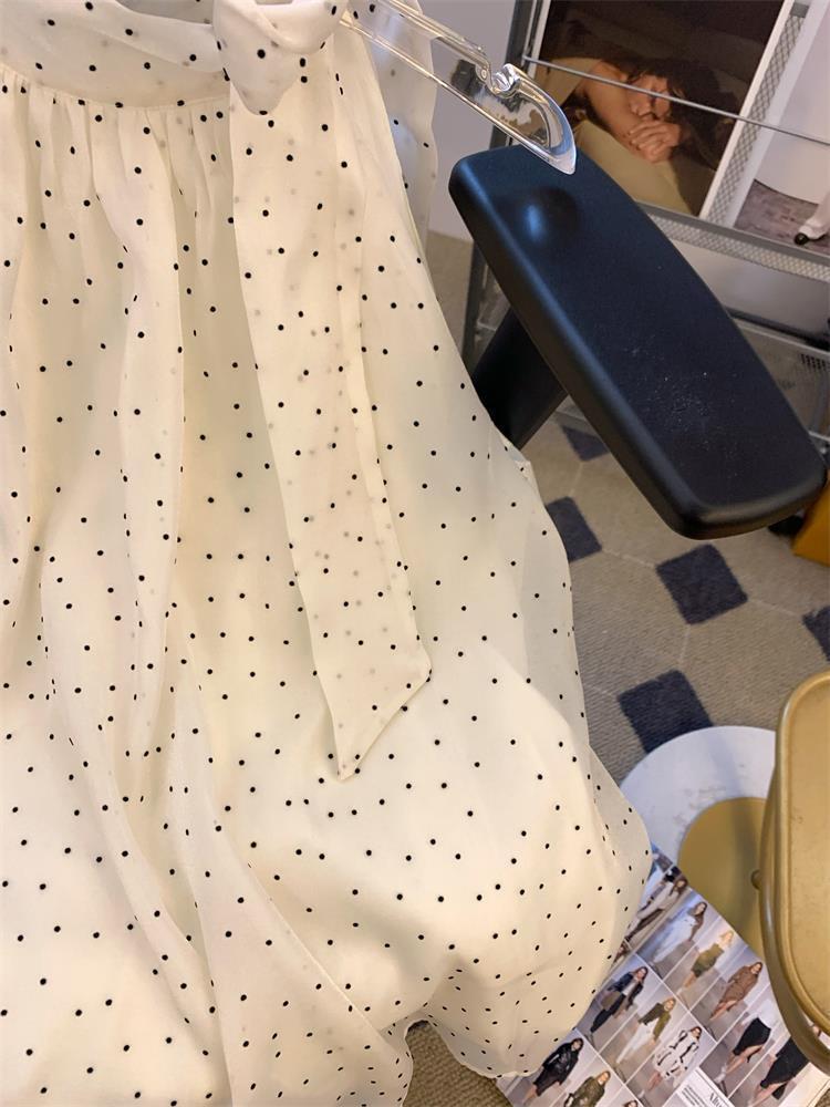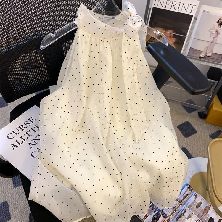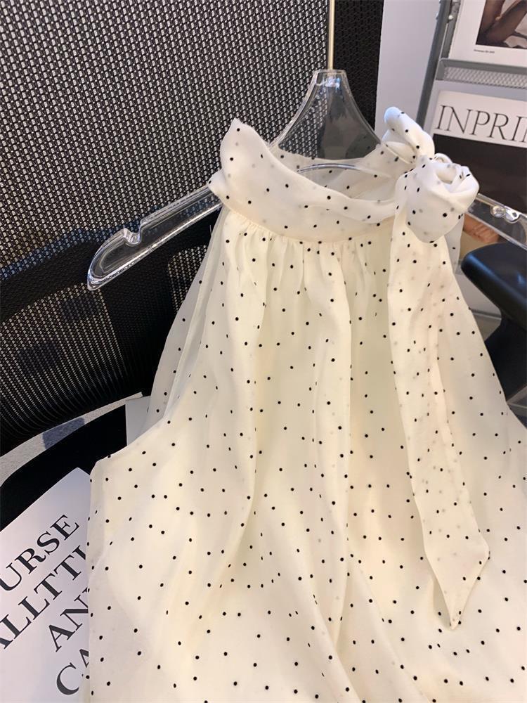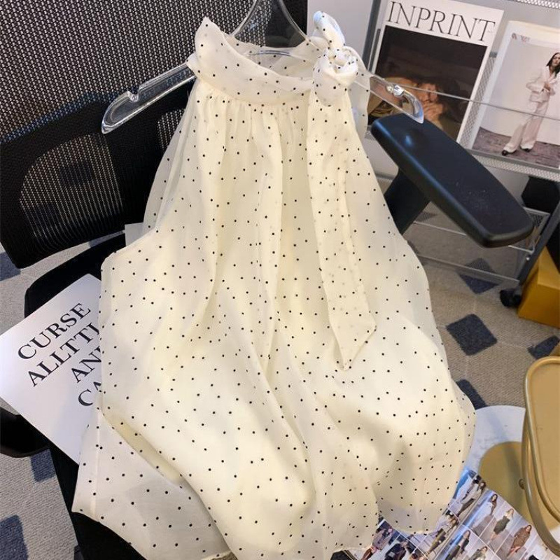miu 스타일 도트 레이스 업 홀터넥 쉬폰 셔츠 여성 여름 루즈 배 커버 인형스토어 가기