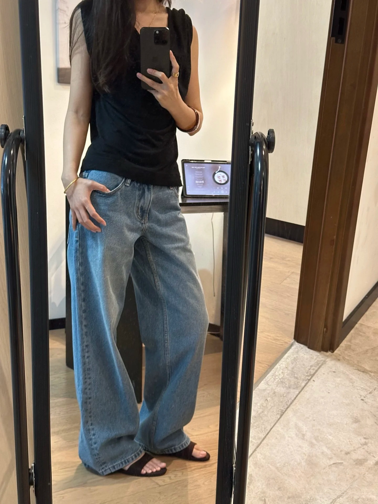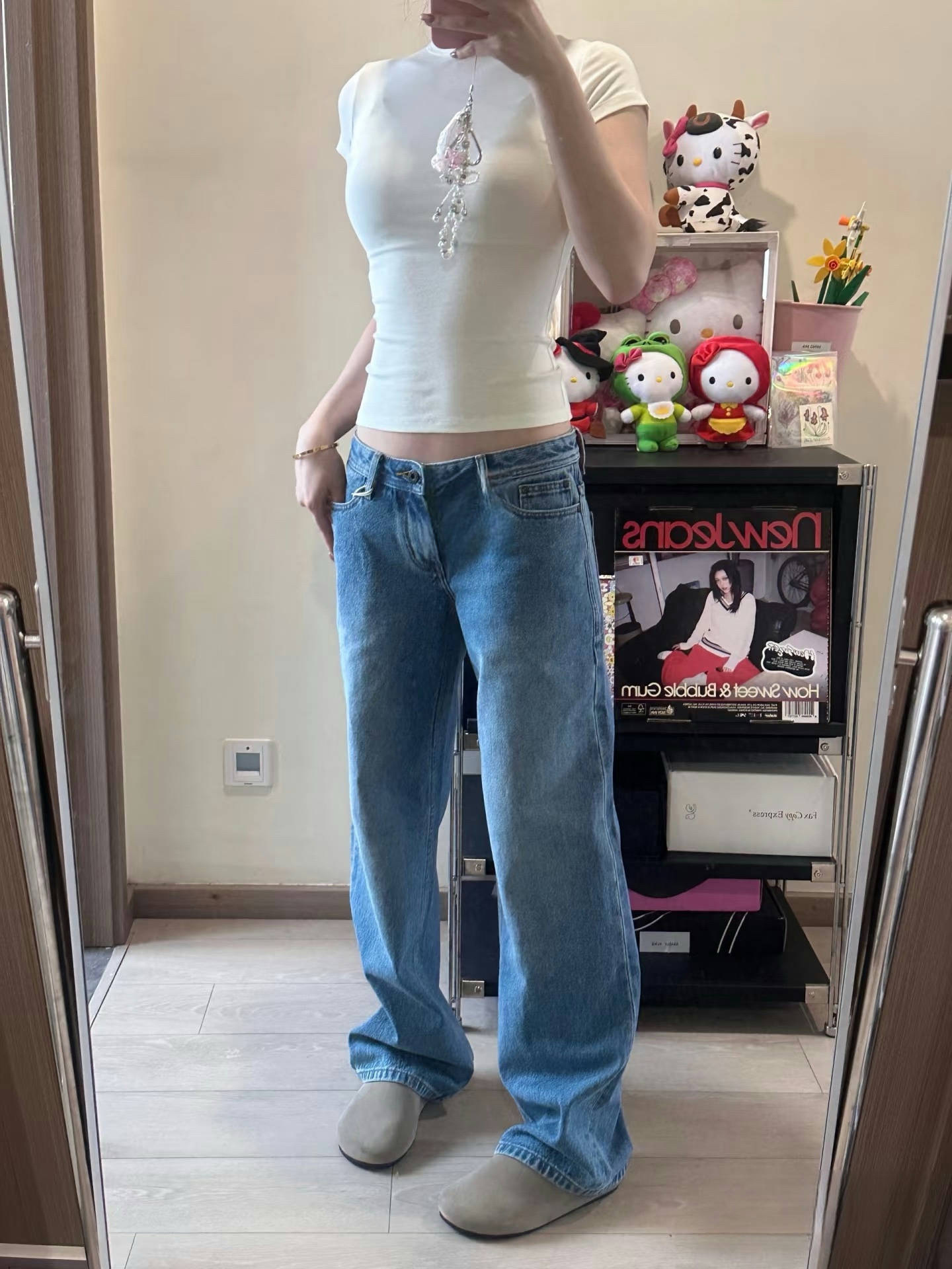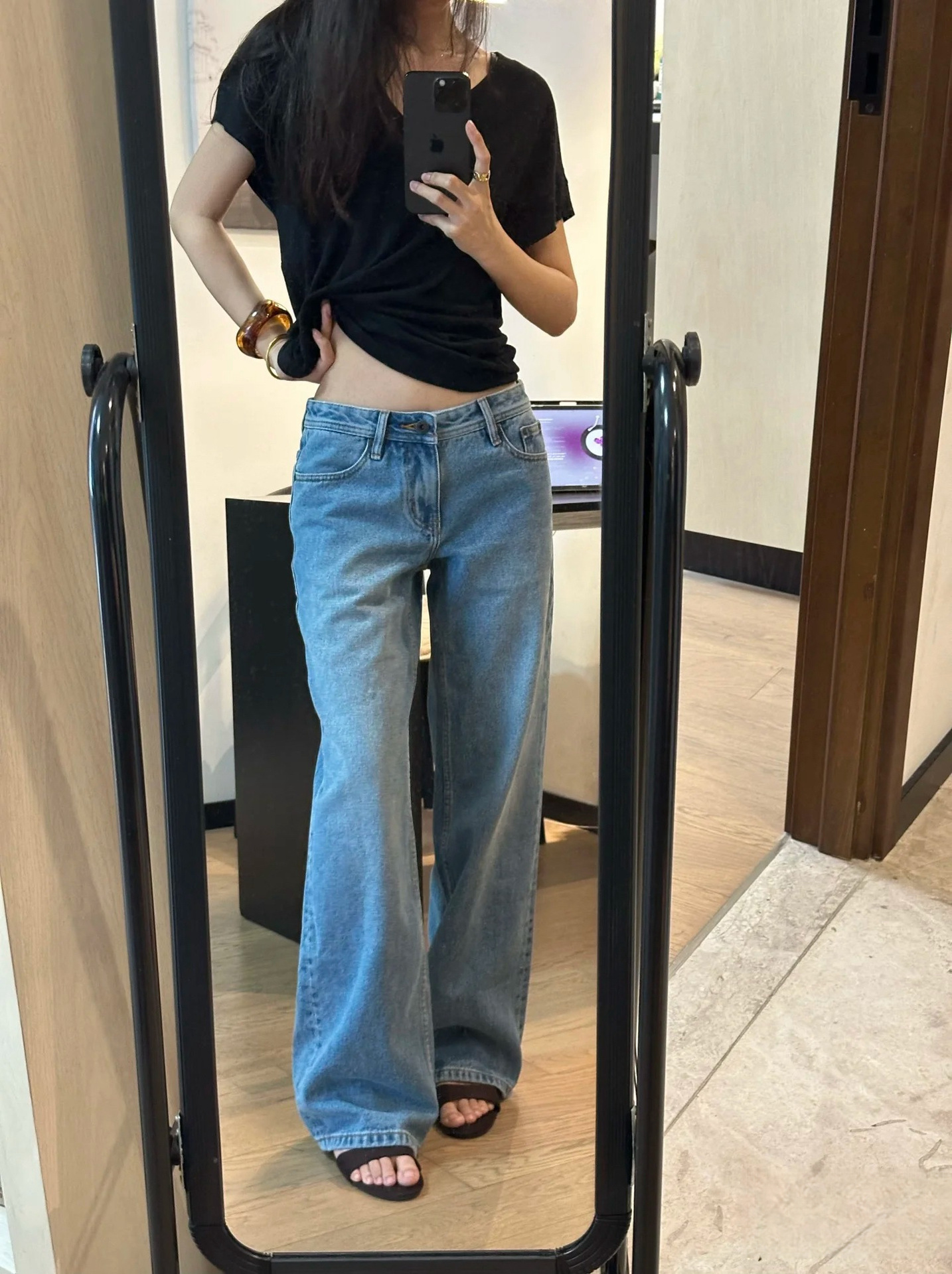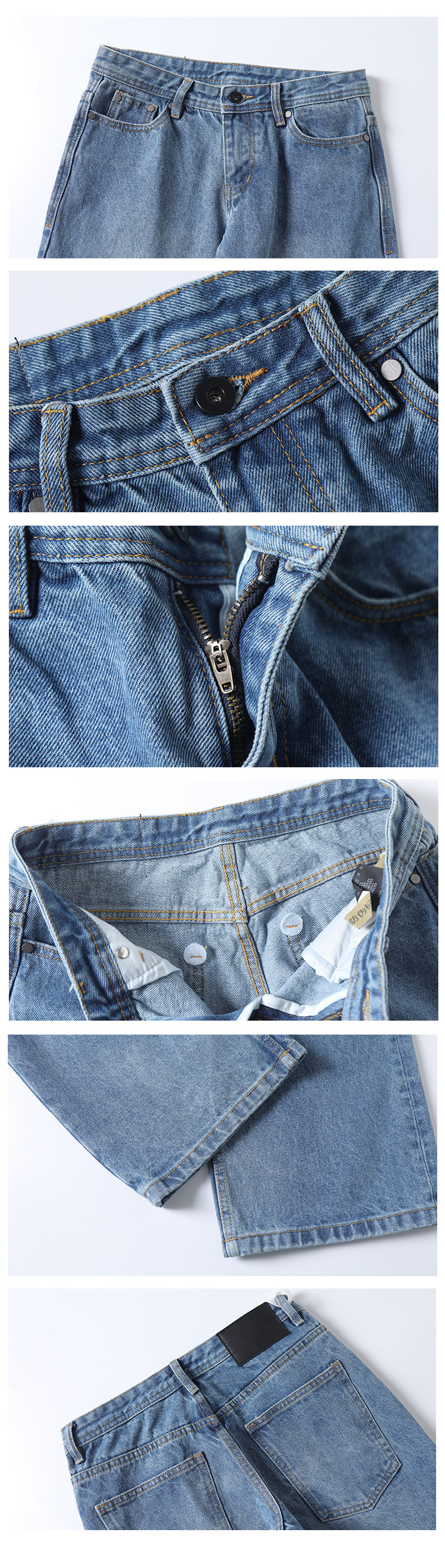 여성용 워싱 및 디스트레스드 미드 로우 웨이스트 청바지 새로운 슬리밍 080L 레트로 라이트 블루 퓨어 코튼 루즈 스트레이트 소 5010스토어 가기