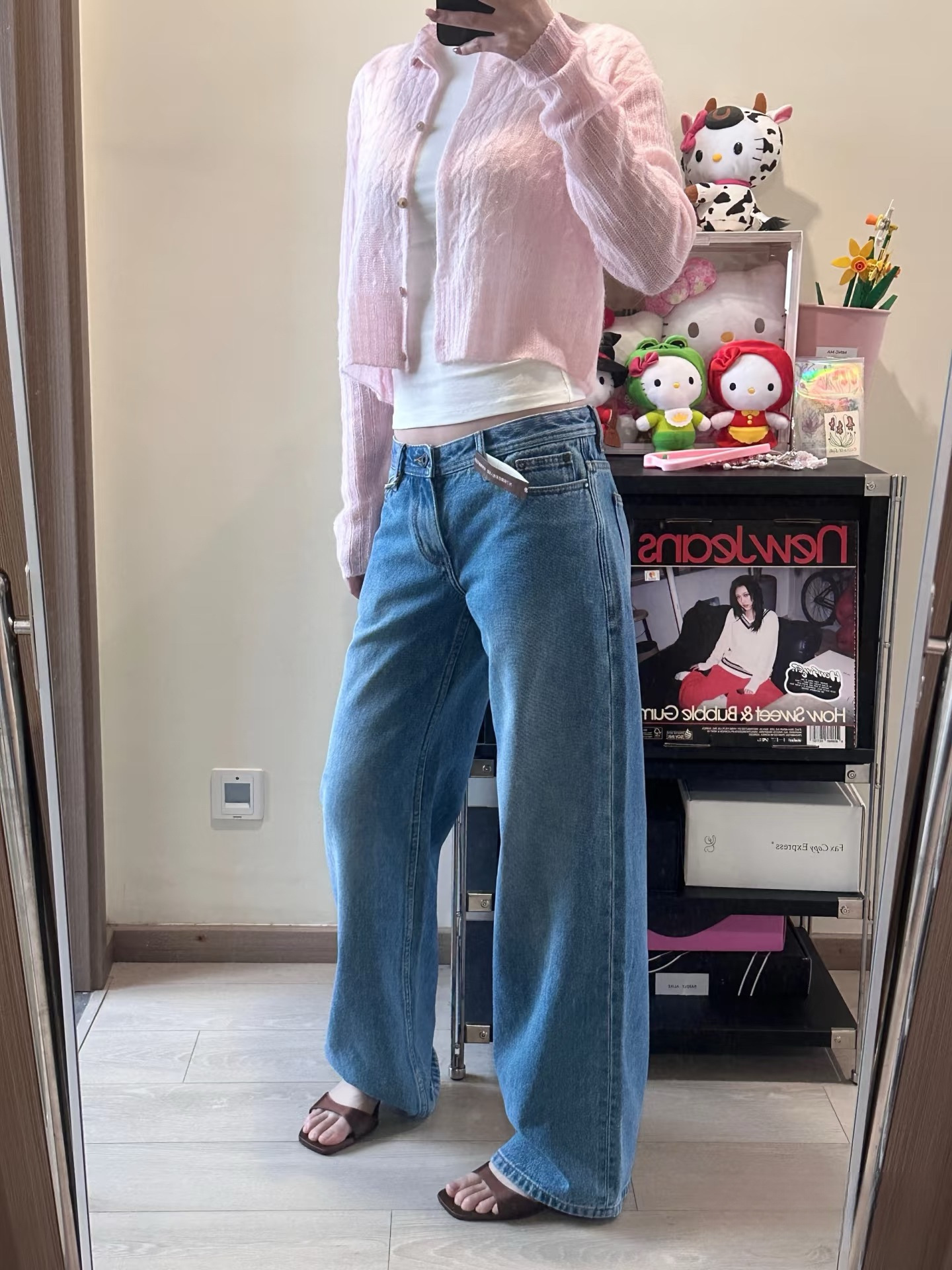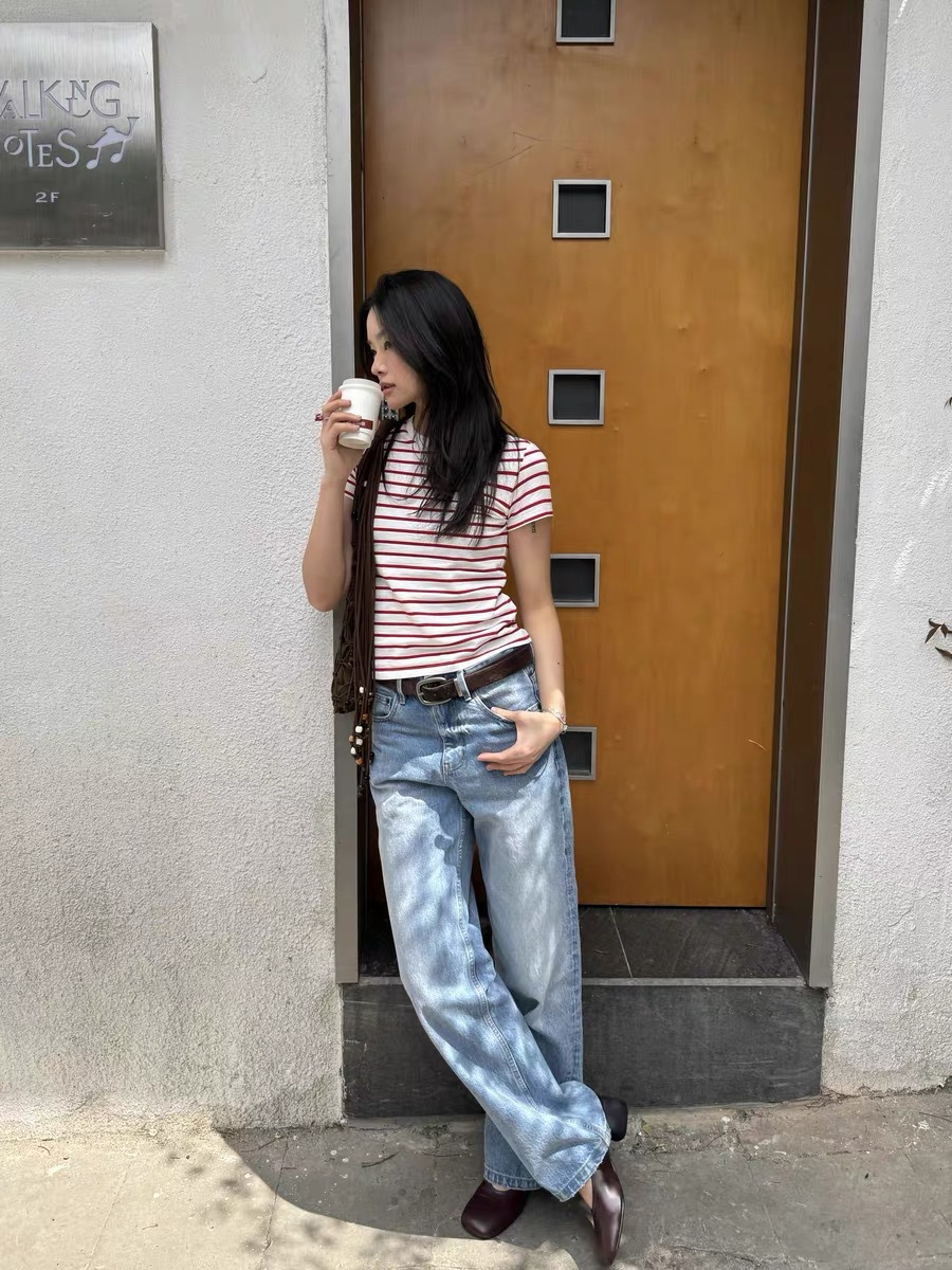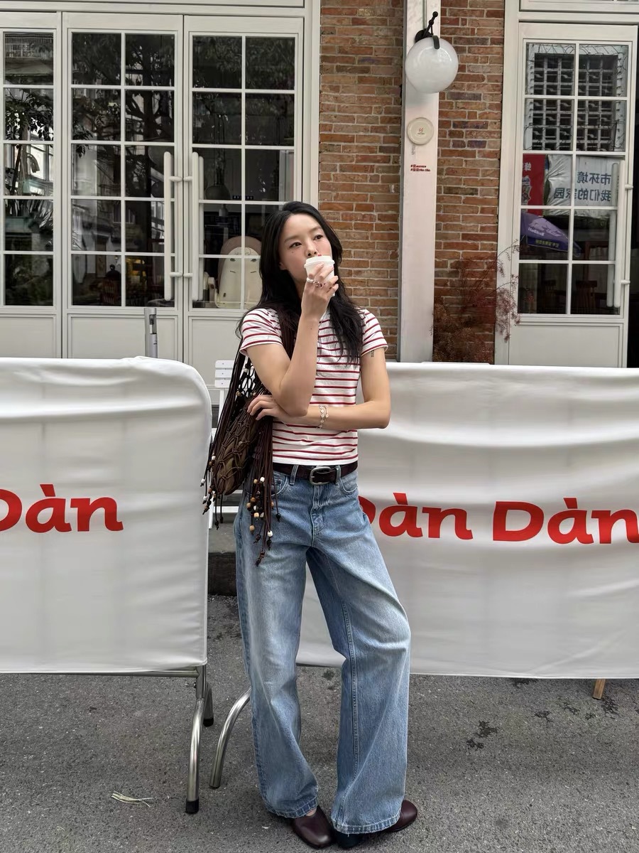 여성용 워싱 및 디스트레스드 미드 로우 웨이스트 청바지 새로운 슬리밍 080L 레트로 라이트 블루 퓨어 코튼 루즈 스트레이트 소 5010스토어 가기