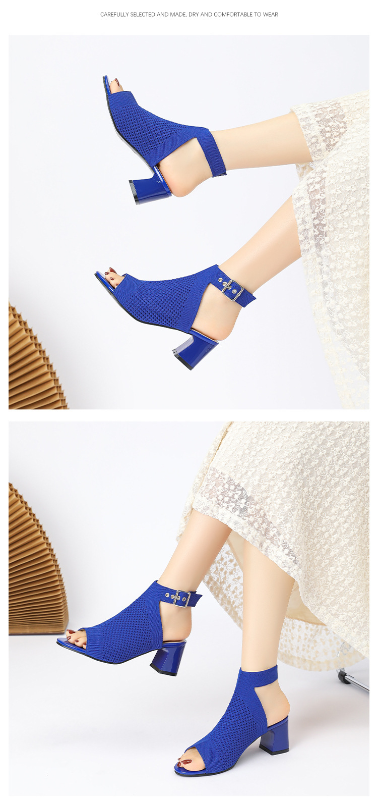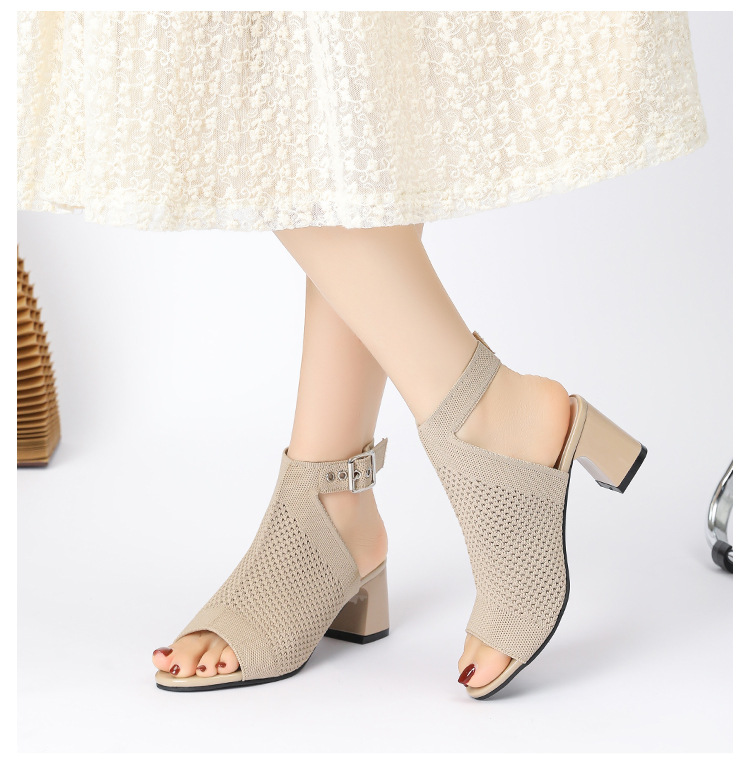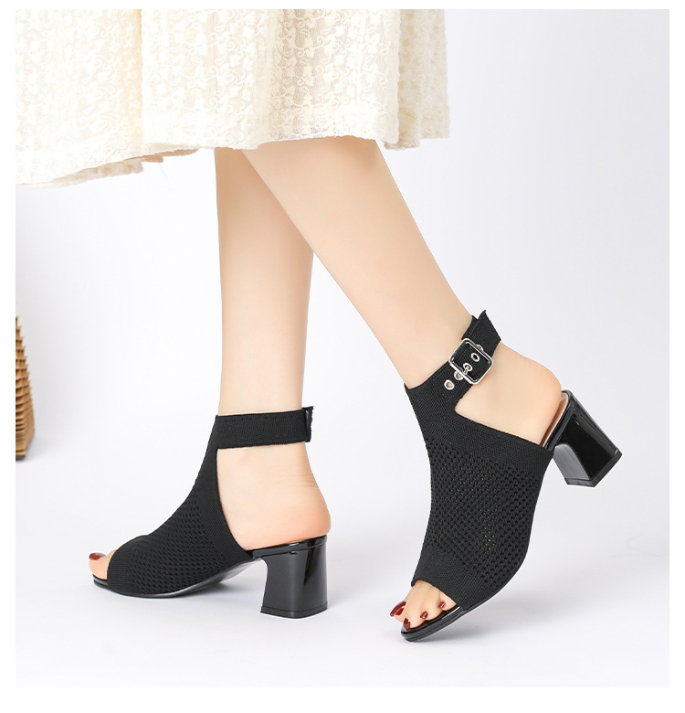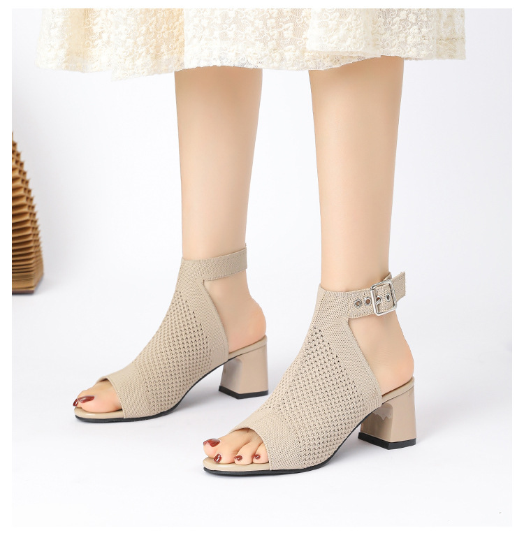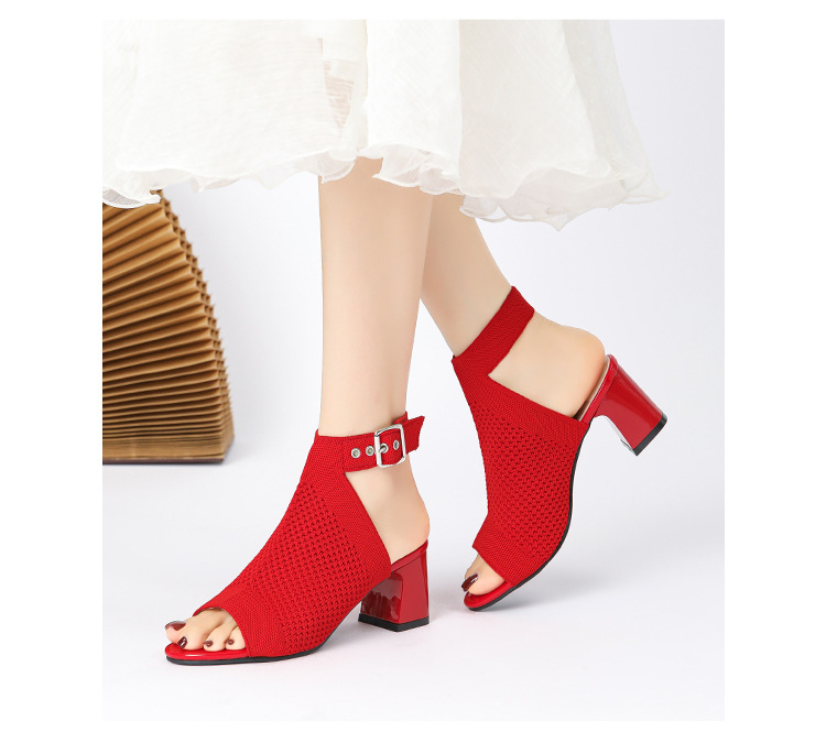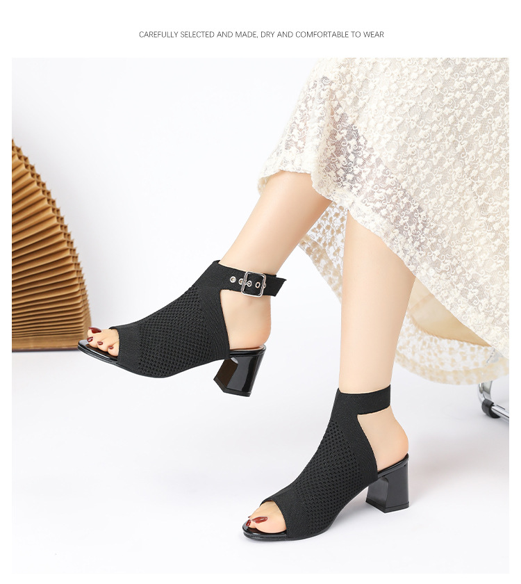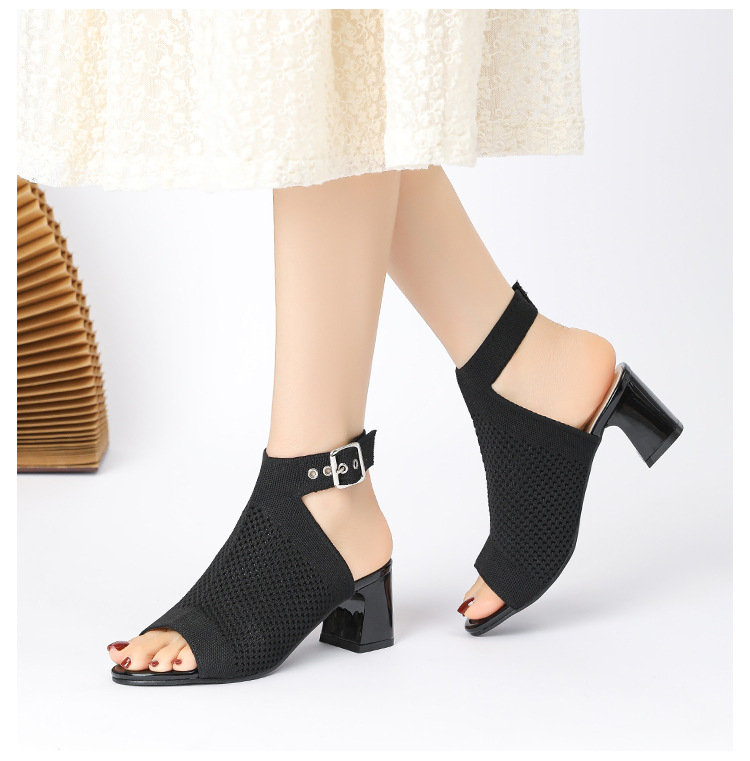 여름 새로운 패션 샌들 여성 일본식 니트 두꺼운 굽 물고기 입 부츠 버클 하이힐 샌들 슬리밍