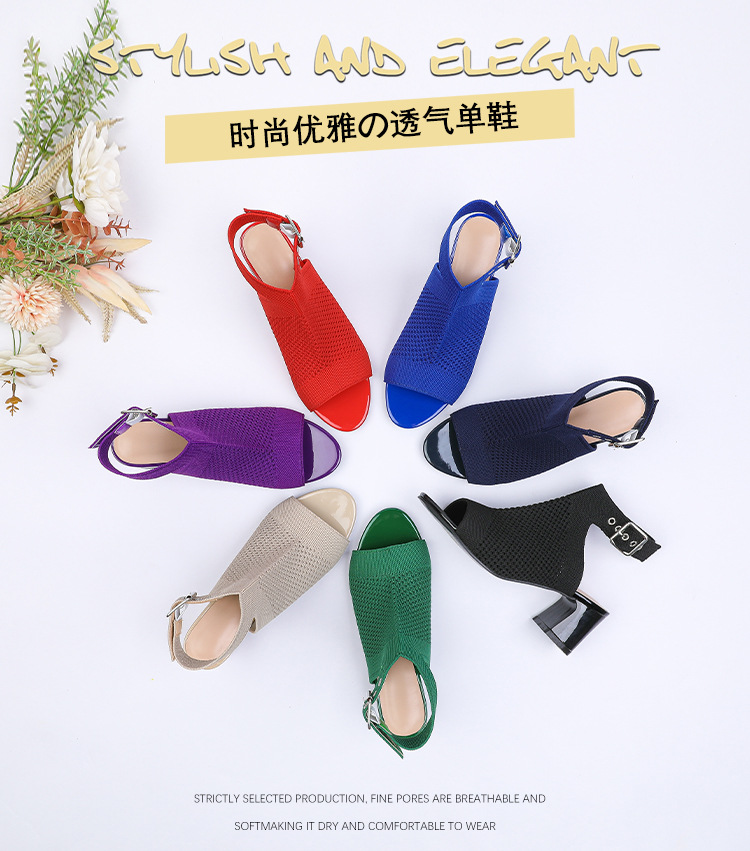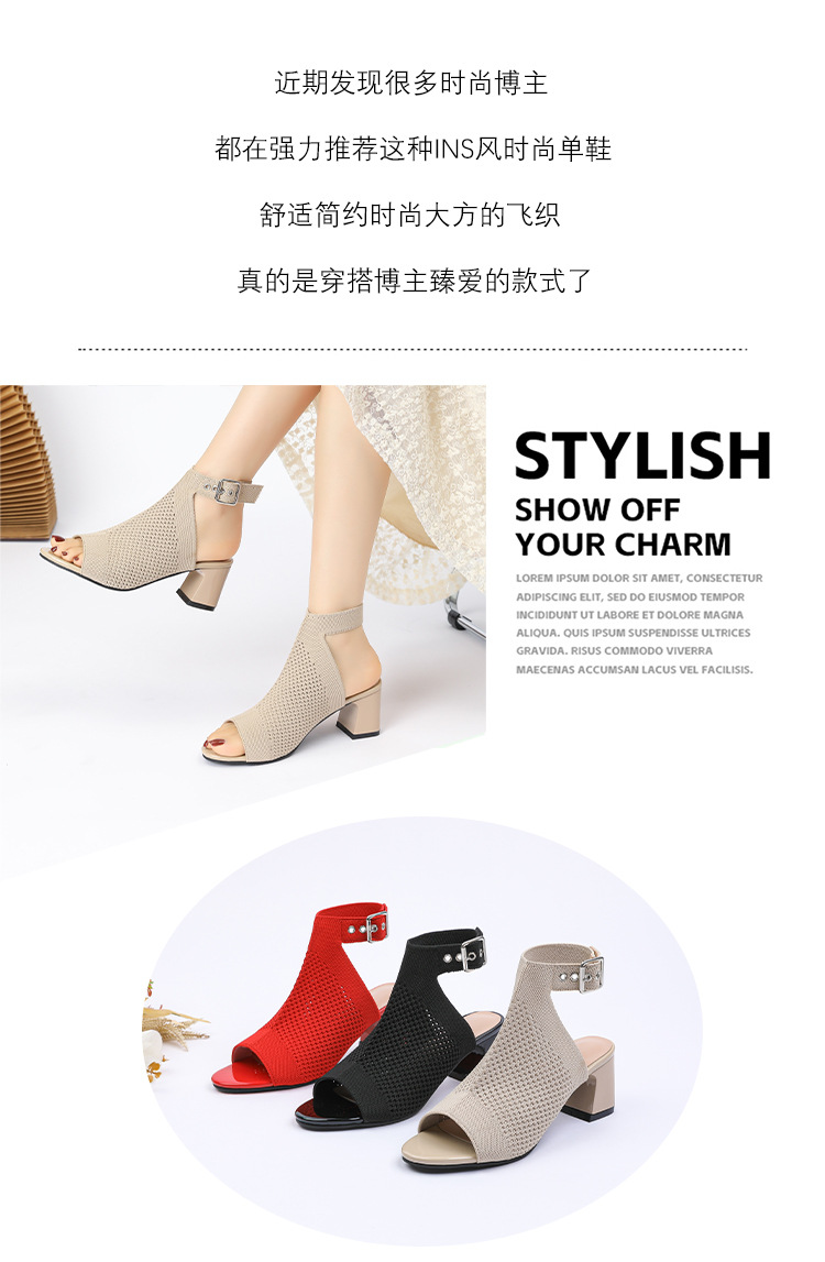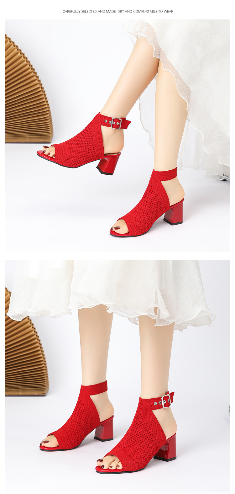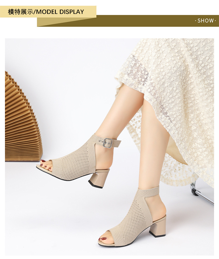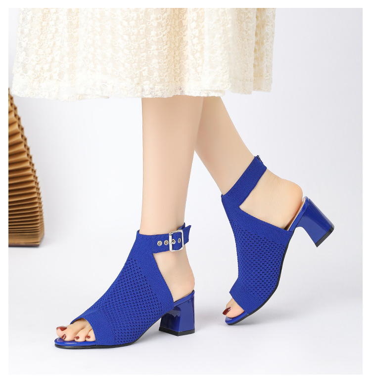 여름 새로운 패션 샌들 여성 일본식 니트 두꺼운 굽 물고기 입 부츠 버클 하이힐 샌들 슬리밍