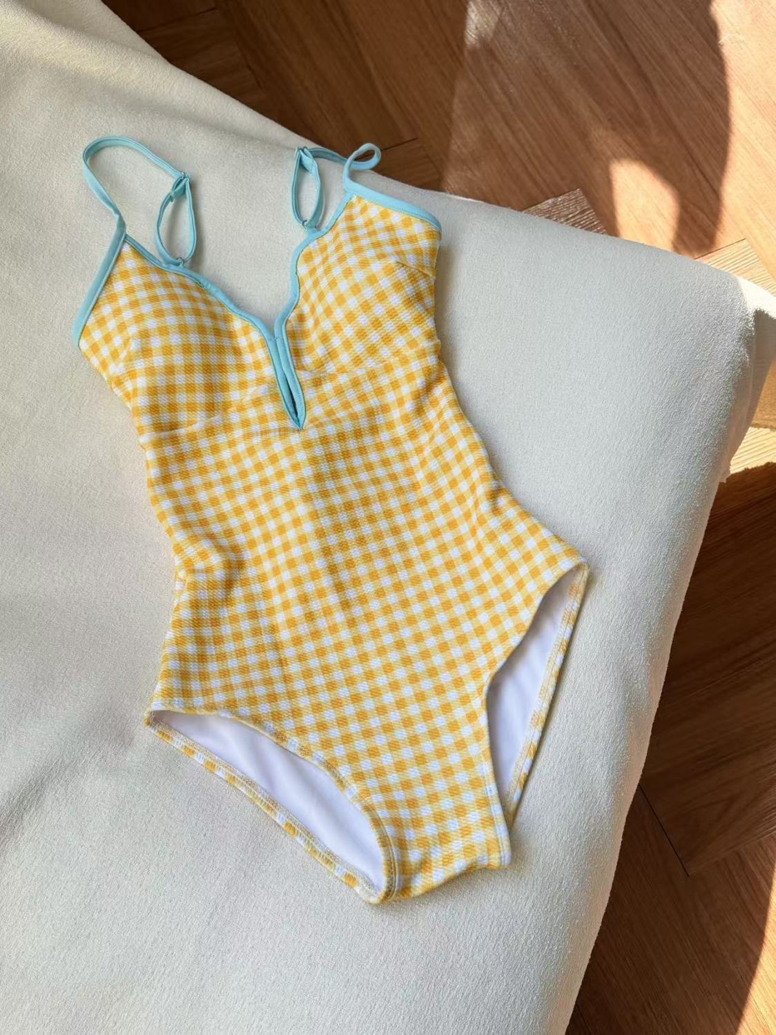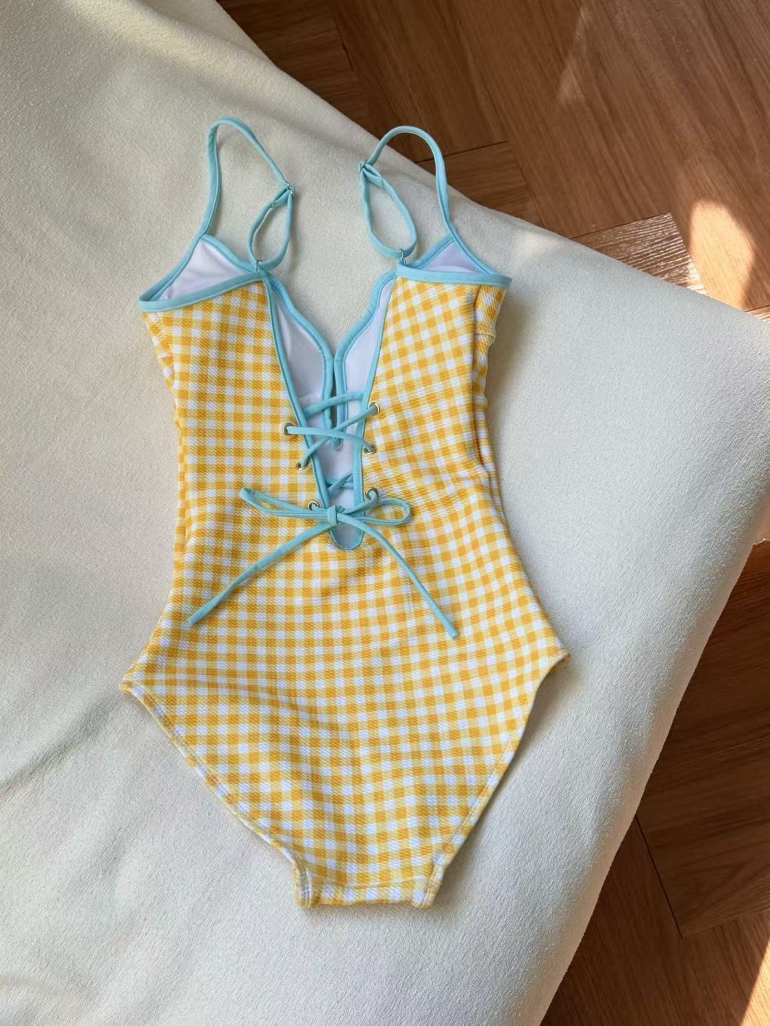 고급스럽고 상큼하고 순수한 소녀의 노란색과 파란색 격자 무늬 원피스 수영복 여성용 두 조각 세트로 살을 커버하고 슬림하게 보이게 하며 온천을 보여줍니다.