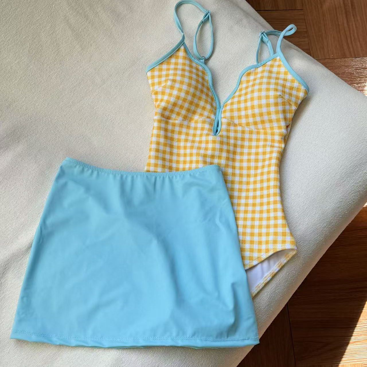 • 노란색 체크무늬 수영복 + 파란색 스커트