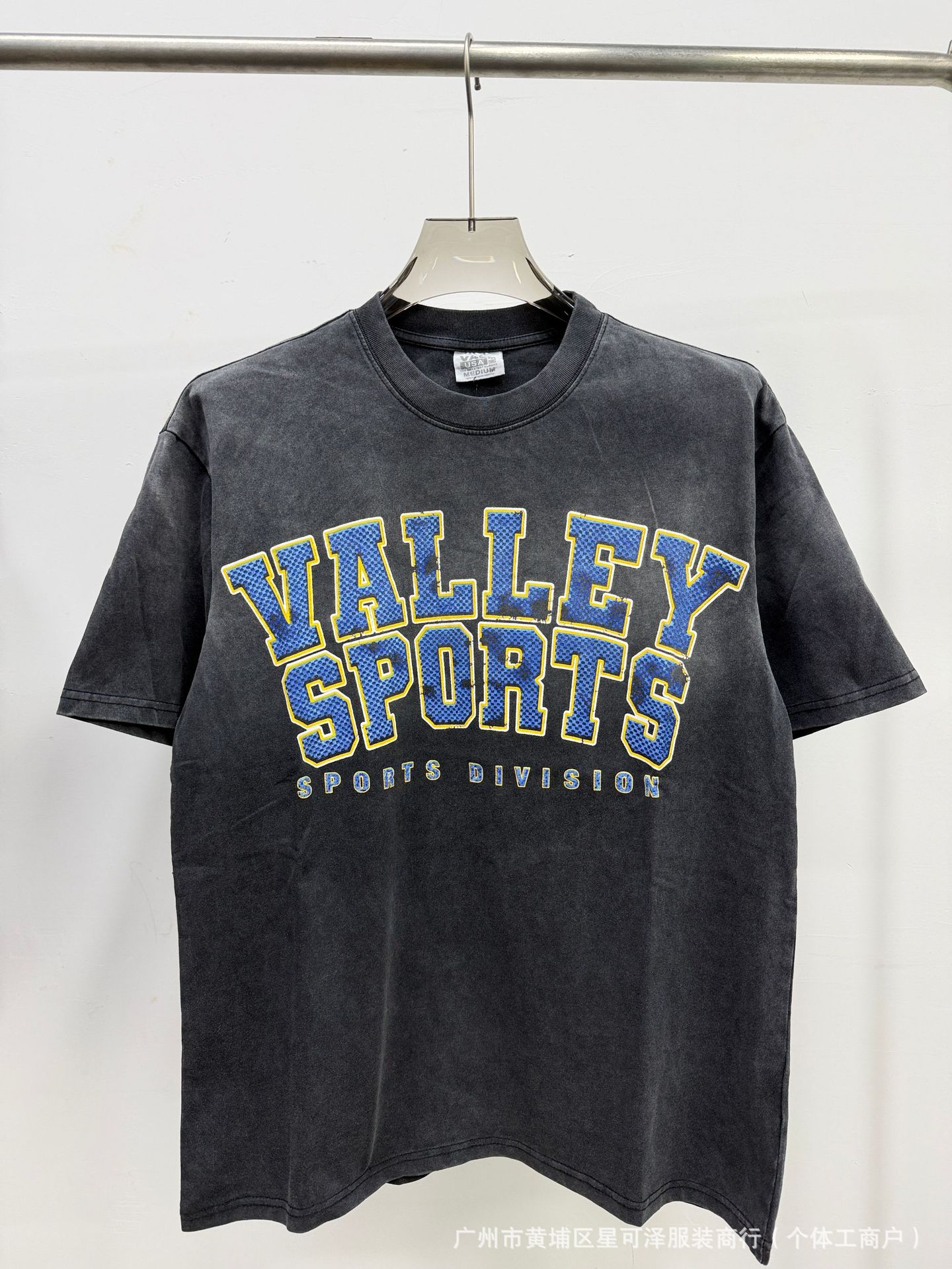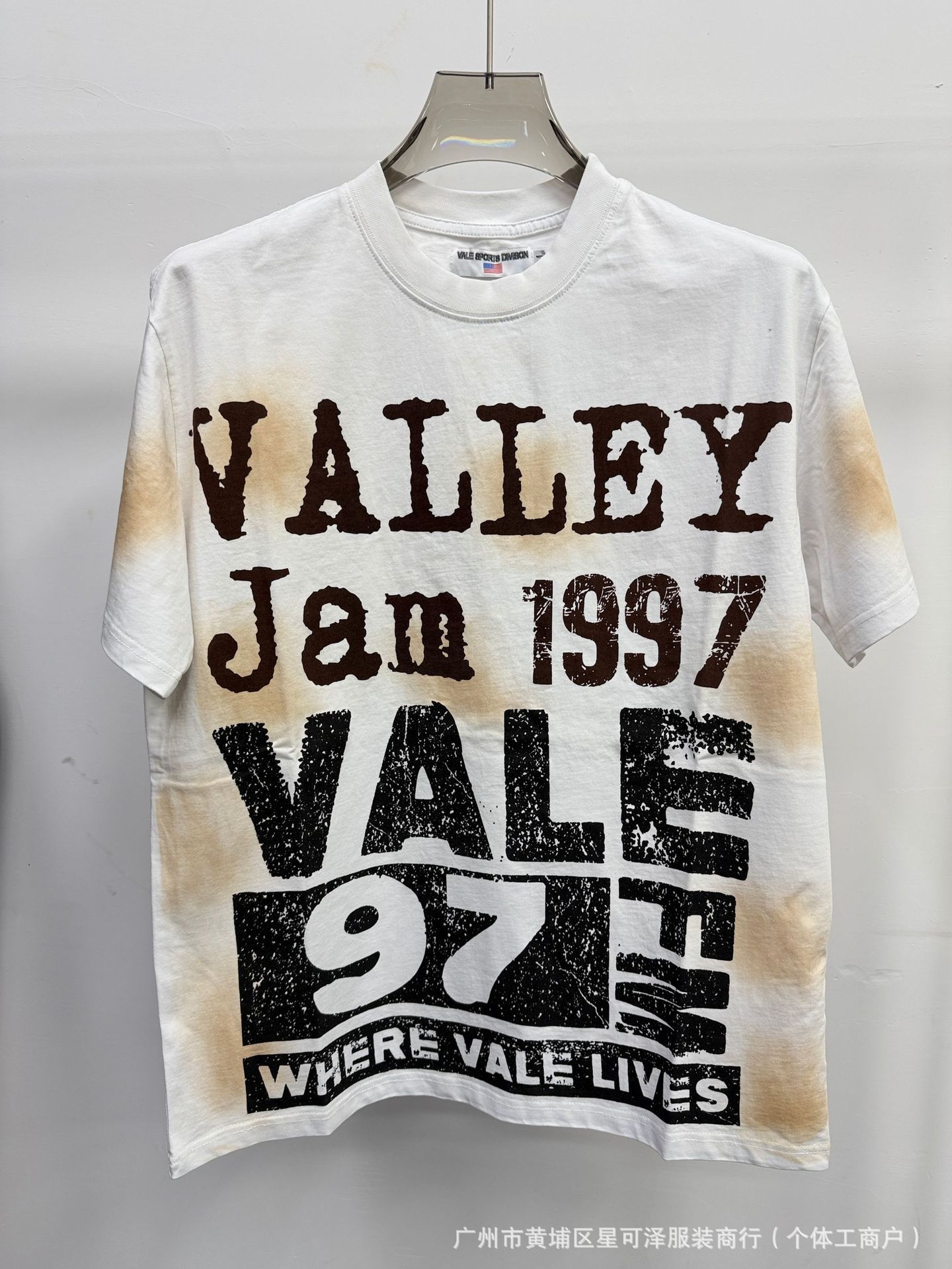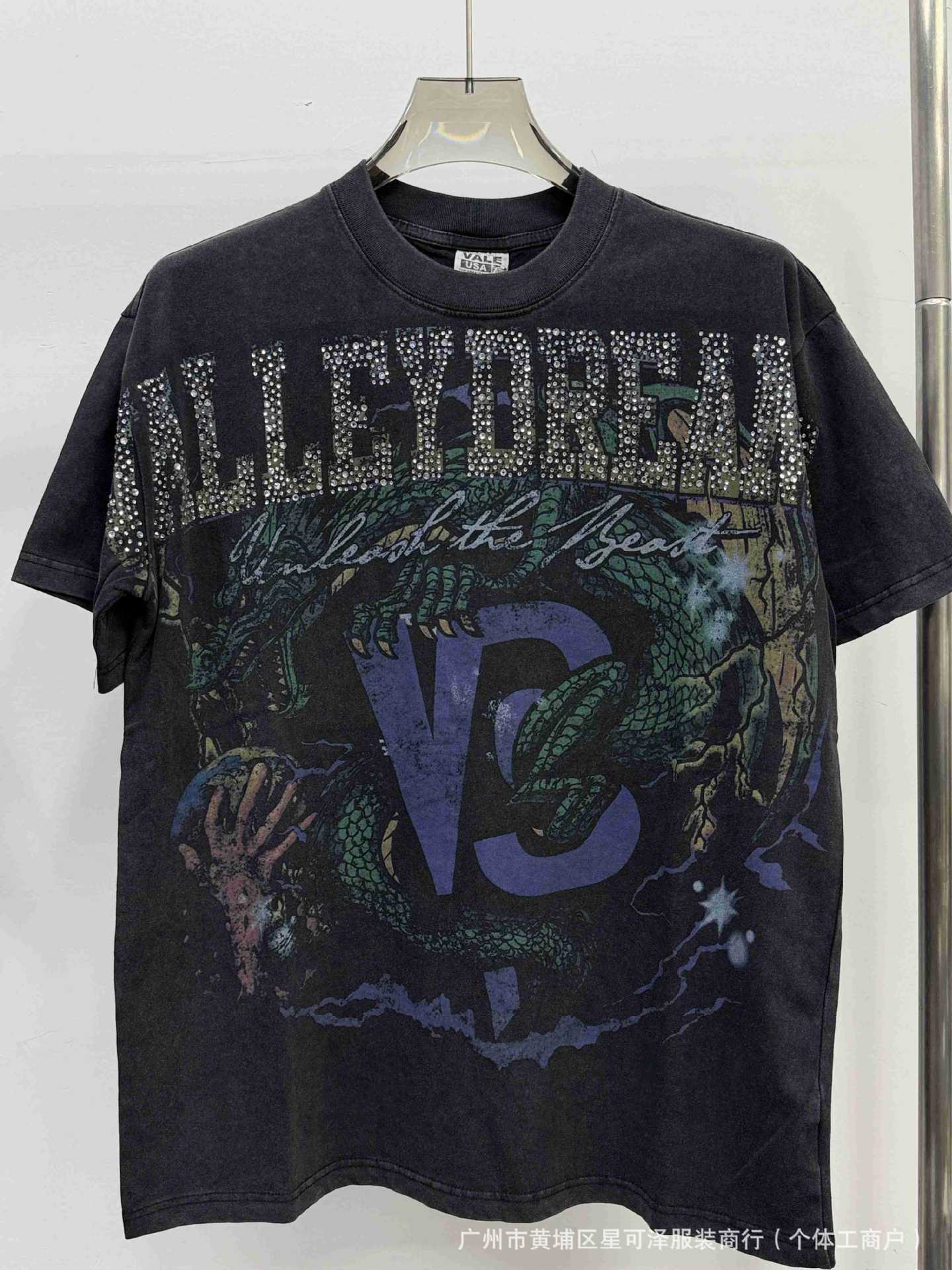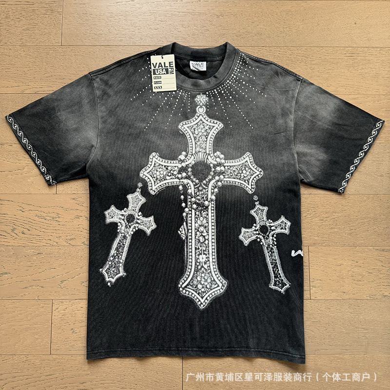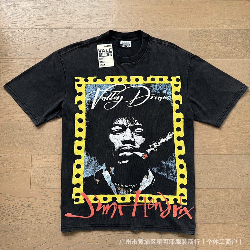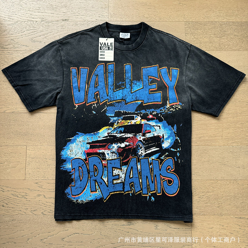 Vale sports Valley Dreams 워시 올드 프린트 유럽 및 미국 힙합 루즈한 남성용 반팔 티셔츠스토어 가기
