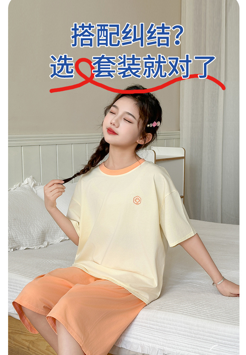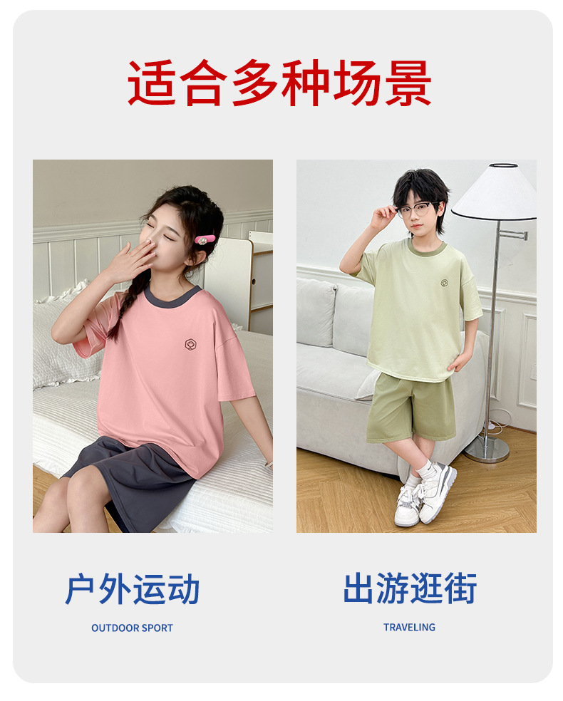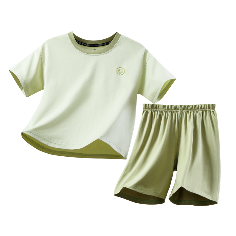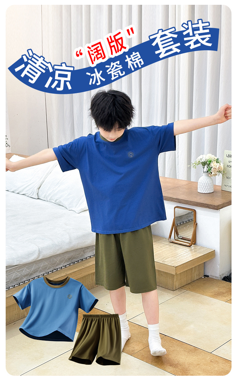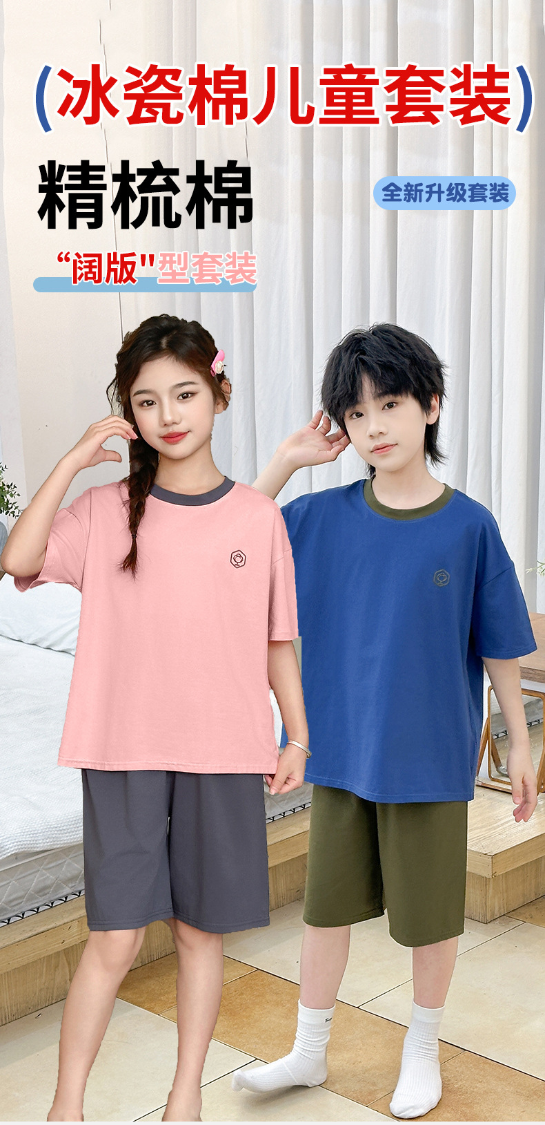 아동용 가정복 세트, 청소년용 오프숄더 루즈한 남아용 반팔 반바지, 아이스 도자기 면 잠옷, 여아용 에어컨 의류스토어 가기