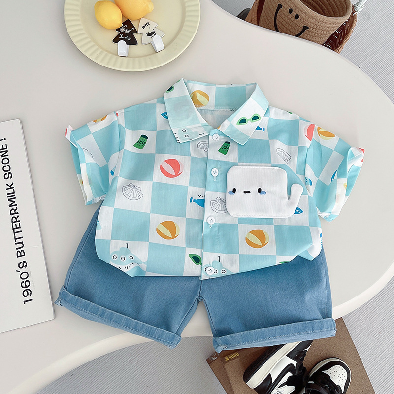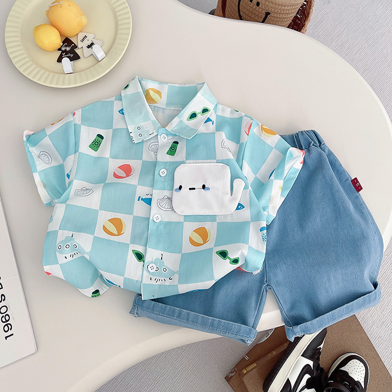 2025 새로운 스타일의 셔츠 POLO 셔츠 어린이 아기 데님 아동복 소년 여름 반팔 세트 투피스 세트