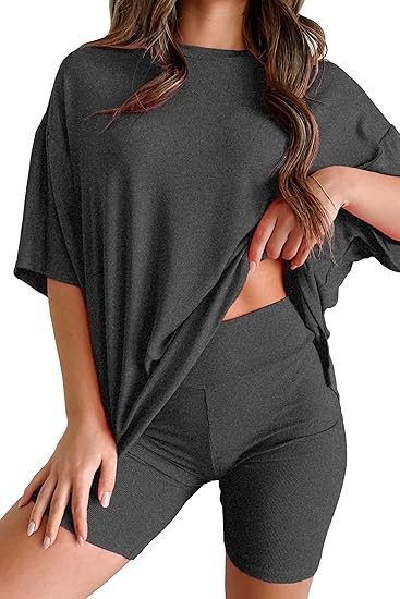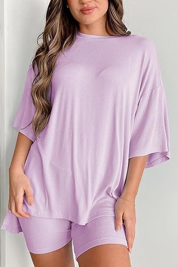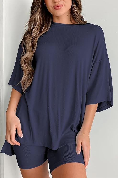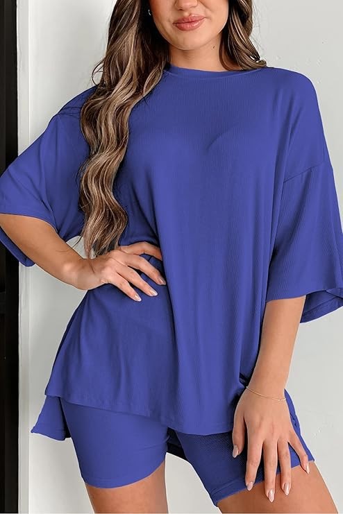 2025 봄과 여름 유럽과 미국 국경 아마존 새로운 느슨한 패션 단색 캐주얼 짧은 소매 반바지 투피스 세트스토어 가기