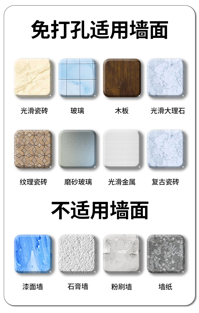 (2)安装请注意,安装前请看视频,墙面需平整坚固的玻璃瓷砖等。不可用在粉刷墙,墙纸,石灰墙等不平整不坚固的墙面上。涂胶上墙后需等待3-5天,免钉胶完全干透再使用!
