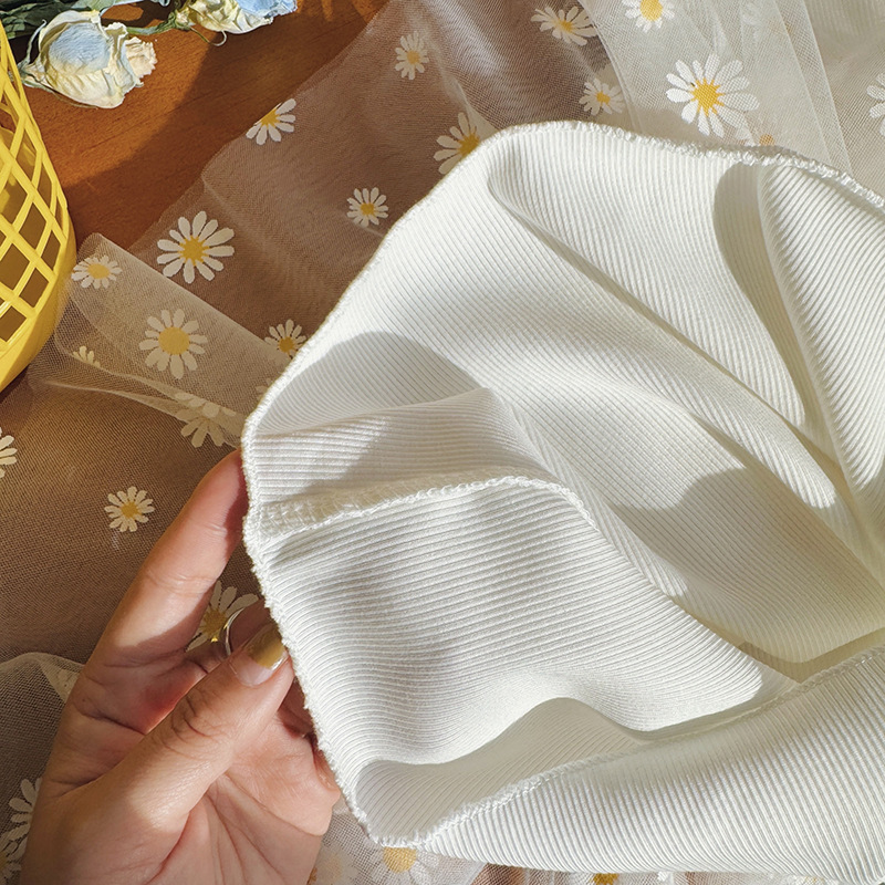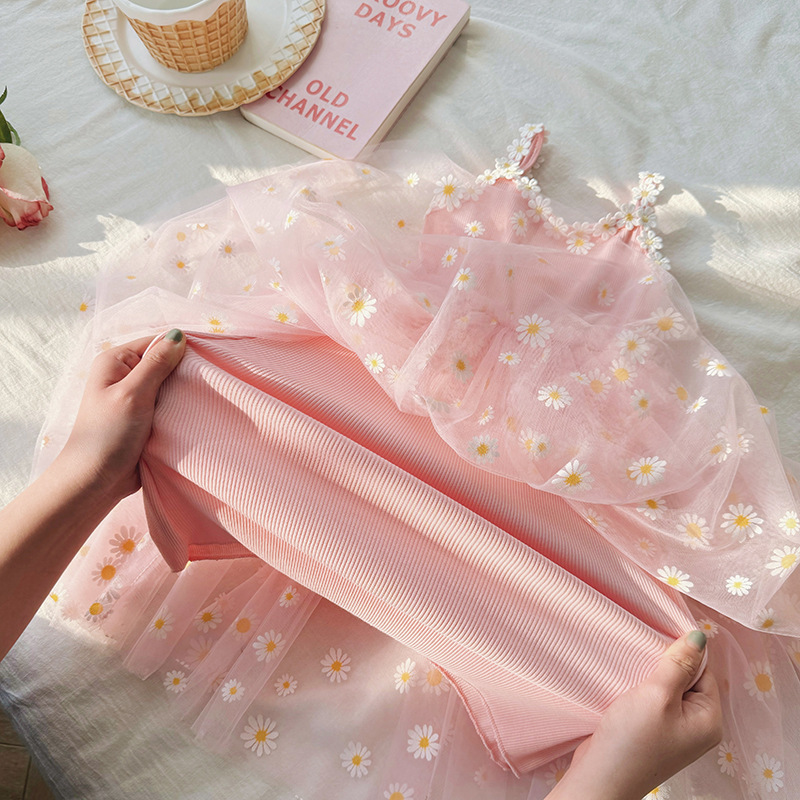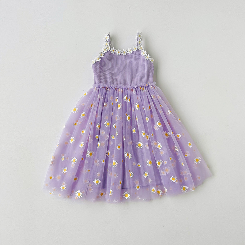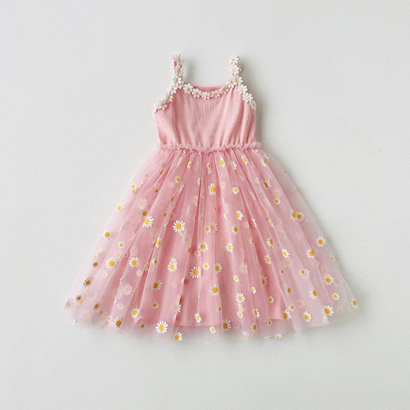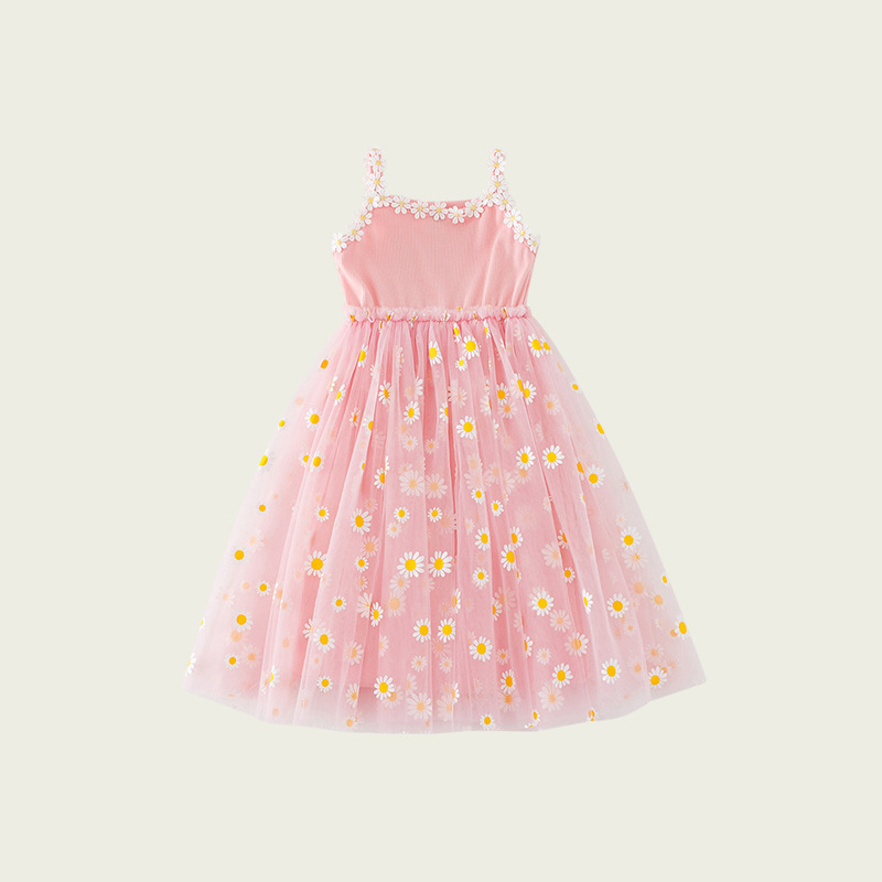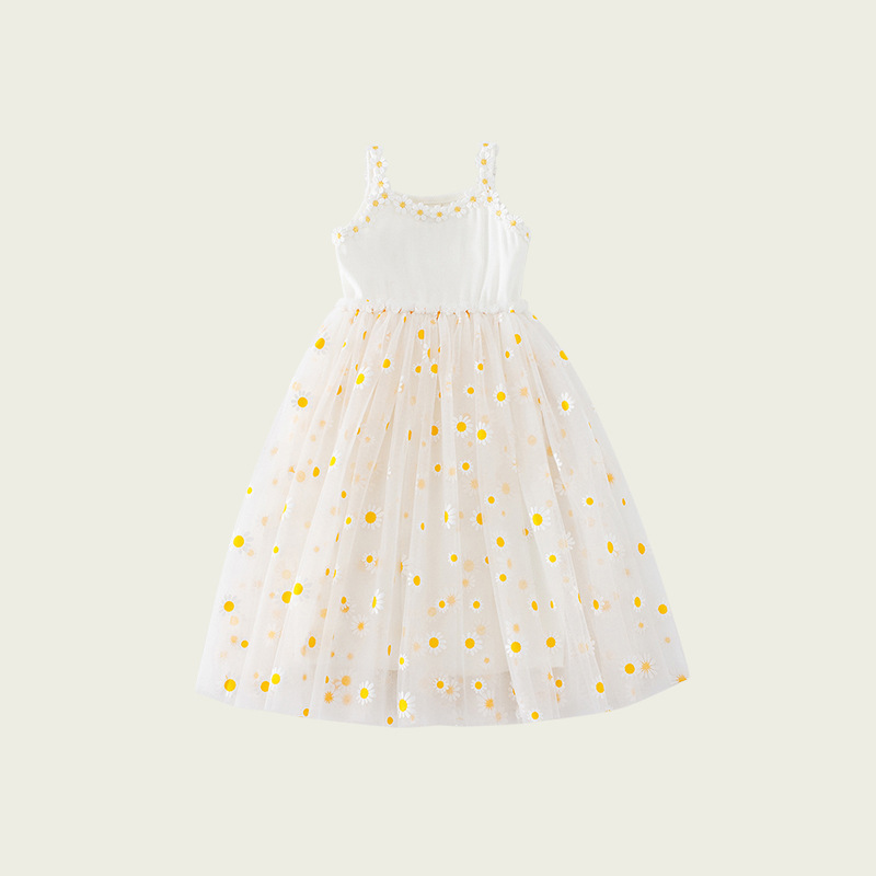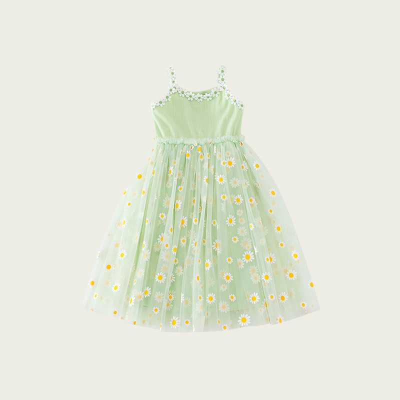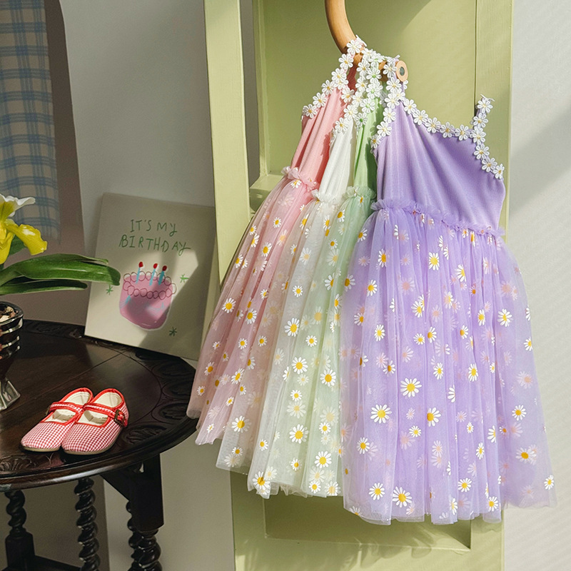 작은 데이지 꽃무늬 메쉬 여아 원피스 2025 여름 신상 스트랩 퍼프 스커트 달콤하고 다재다능한 비치 원피스