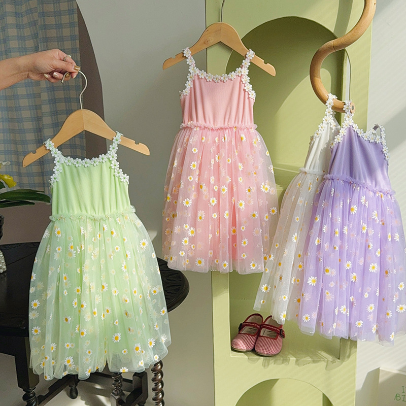작은 데이지 꽃무늬 메쉬 여아 원피스 2025 여름 신상 스트랩 퍼프 스커트 달콤하고 다재다능한 비치 원피스스토어 가기