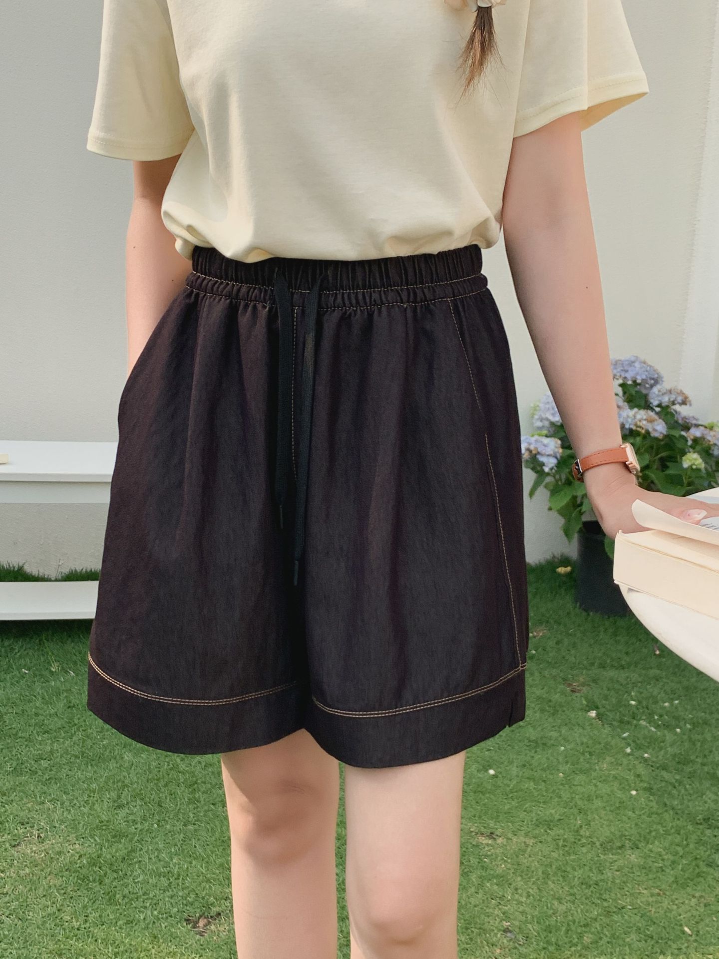 2026 여름 여성용 면 혼방 박시핏 반바지, 레트로 클래식 스타일, 끈으로 조절 가능한 하이웨이스트, 헐렁한 캐주얼 화이트 핫팬츠
