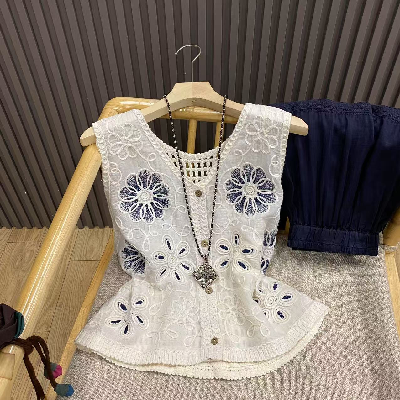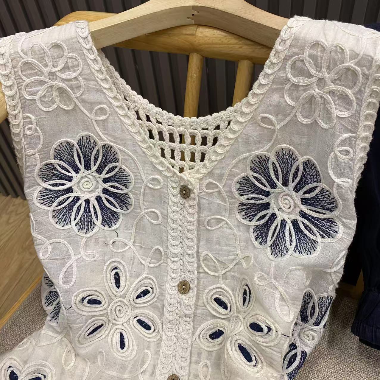 입체 크로셰 중공 자수 브이넥 코튼 조끼 루즈 레이어드 여성용 다용도 디자인 민소매 탑 W5424스토어 가기