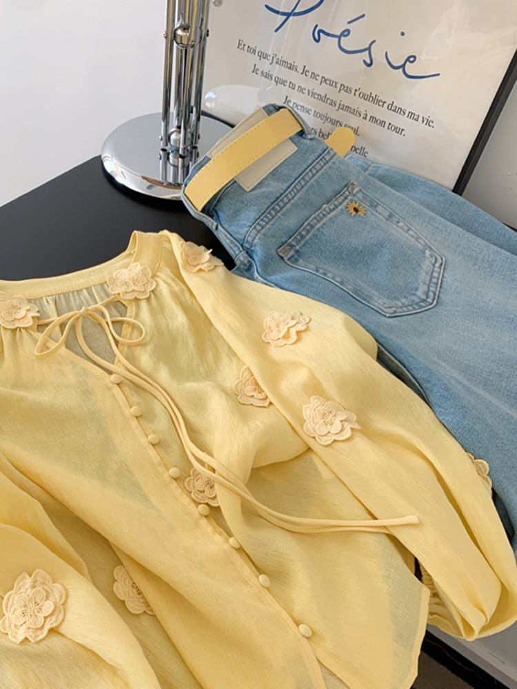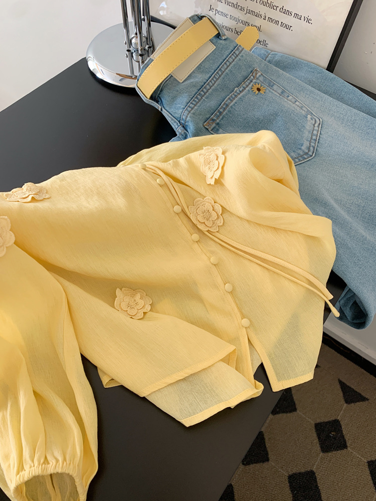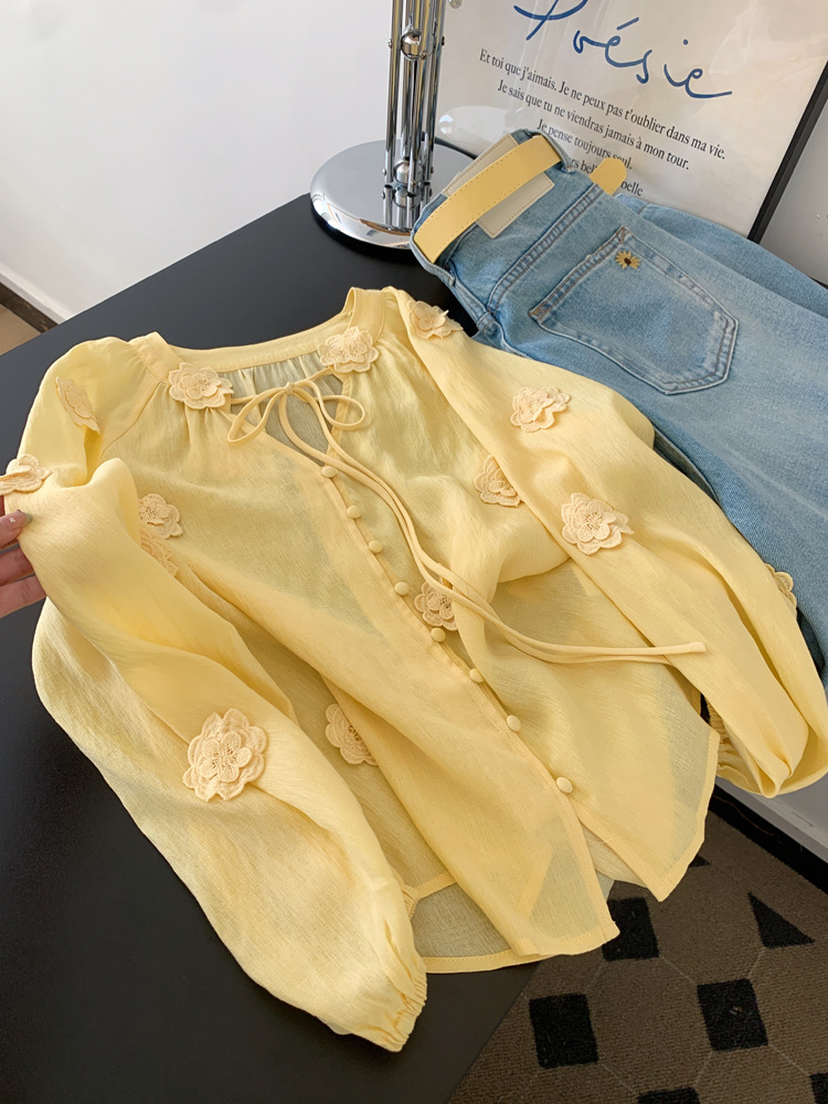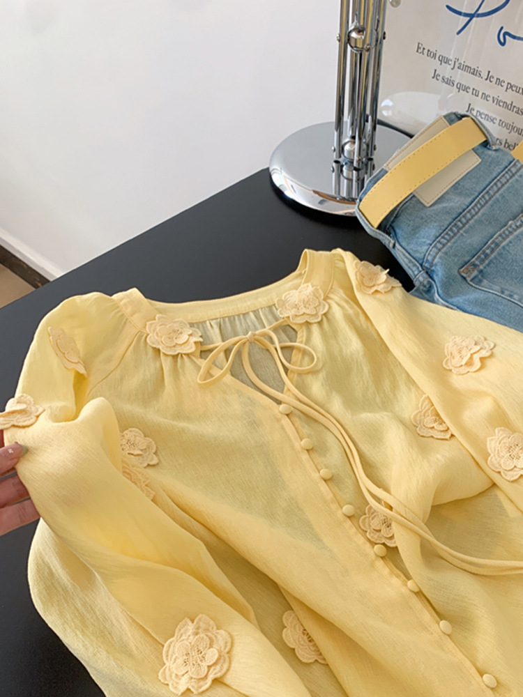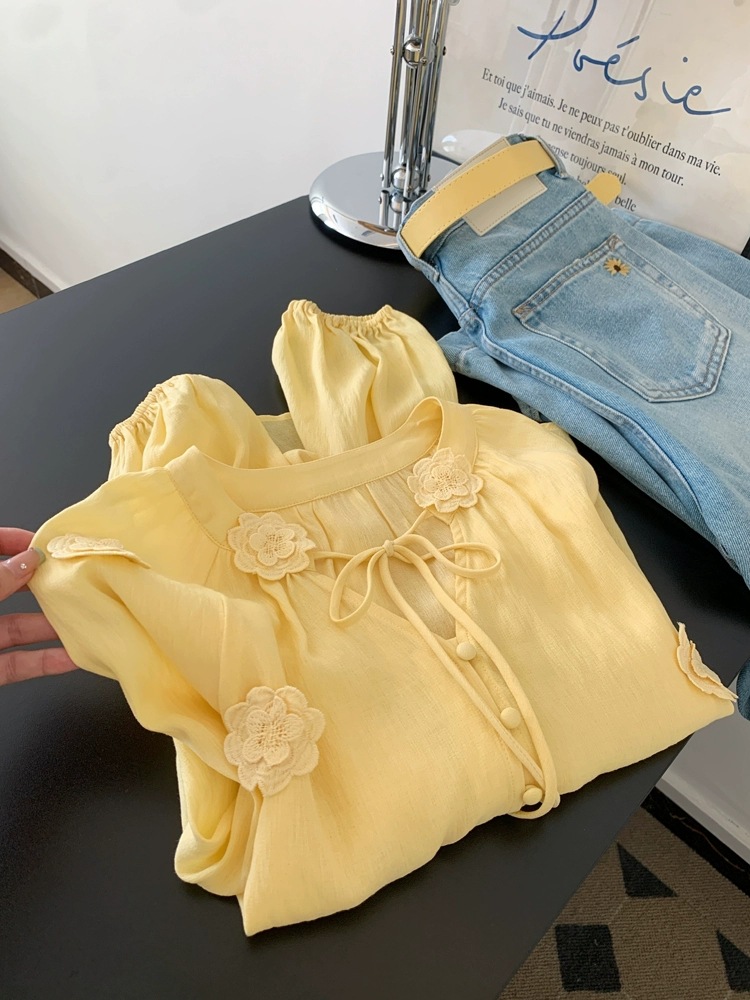 도파민 노란색 활 셔츠 여성 최고 작은 사람들 디자인 센스 틈새 독특한 슈퍼 아름다운 아름다운 작은 셔츠