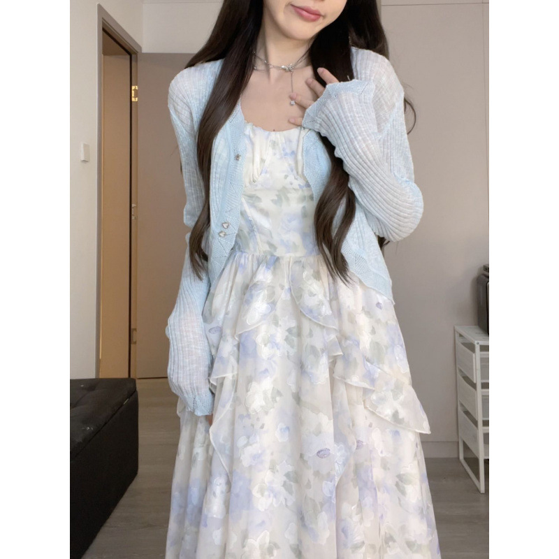 여성을위한 달콤한 스타일 프릴 쉬폰 꽃 스커트 정장 여름 얇은 여름 카디건 달콤한 허리 서스펜더 드레스