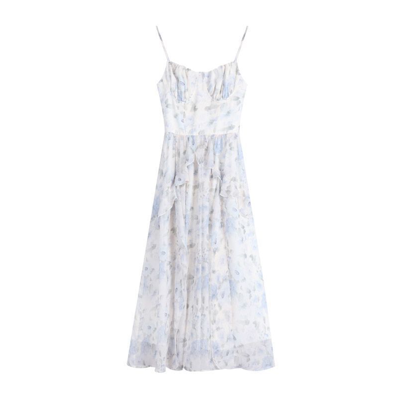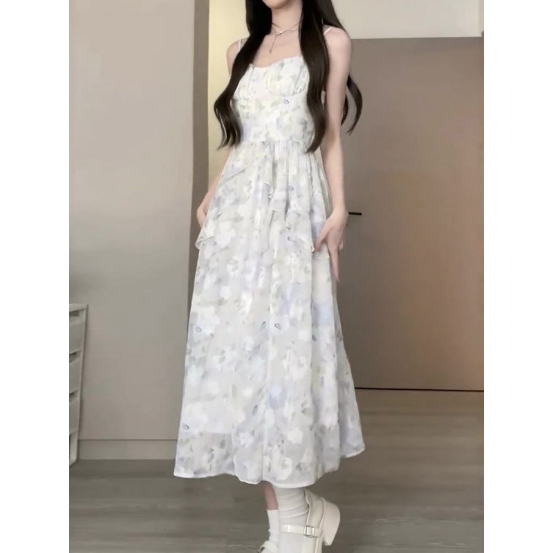여성을위한 달콤한 스타일 프릴 쉬폰 꽃 스커트 정장 여름 얇은 여름 카디건 달콤한 허리 서스펜더 드레스스토어 가기