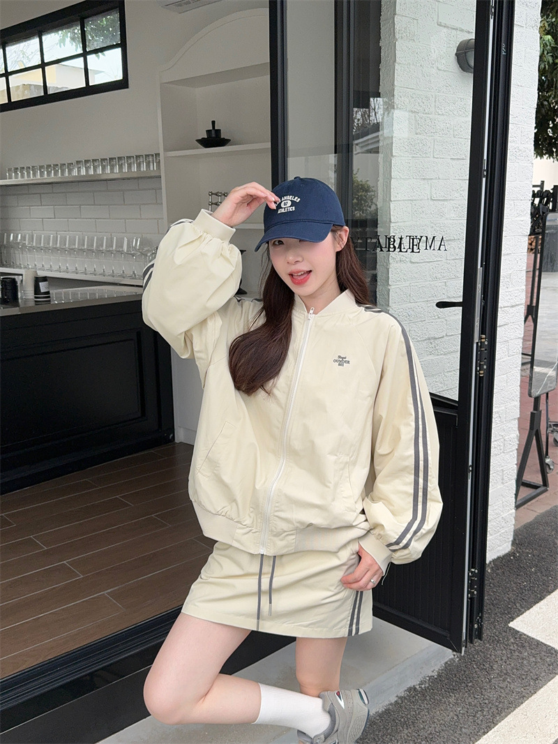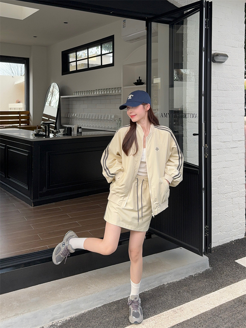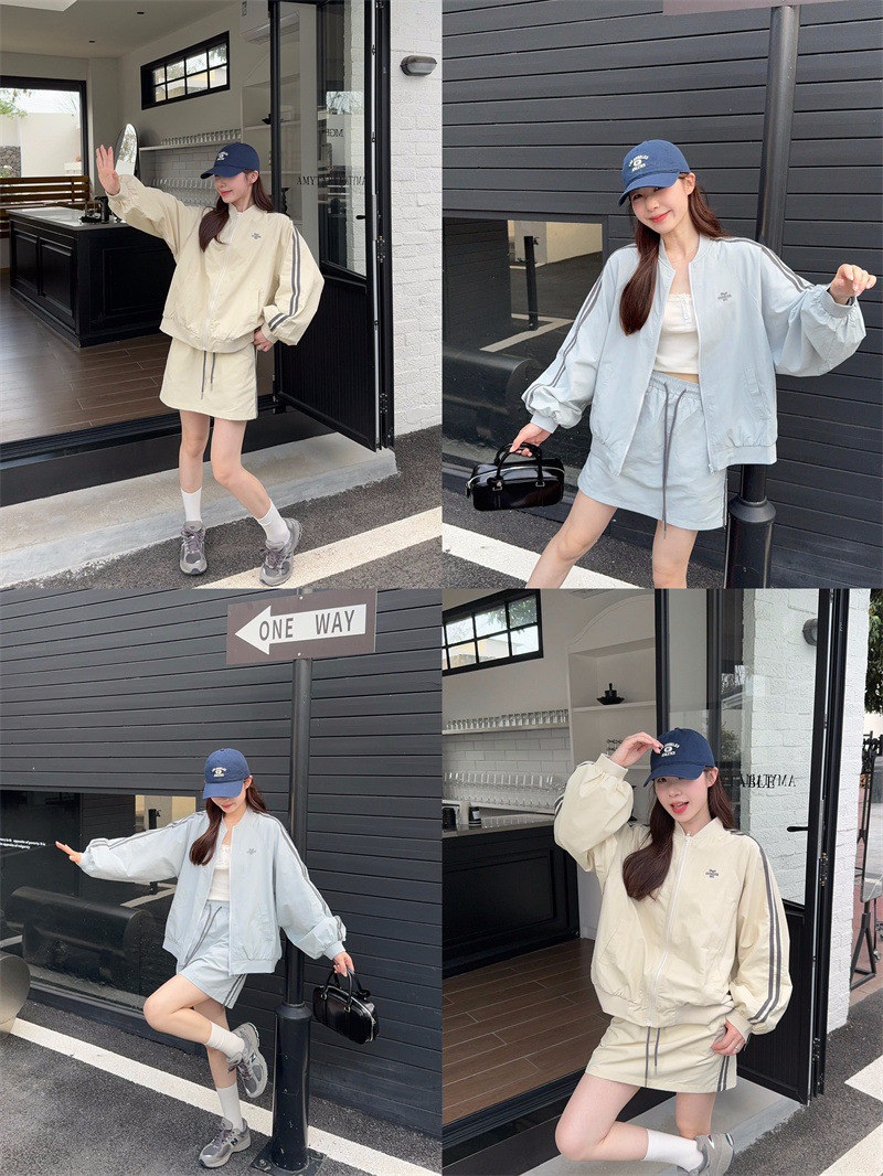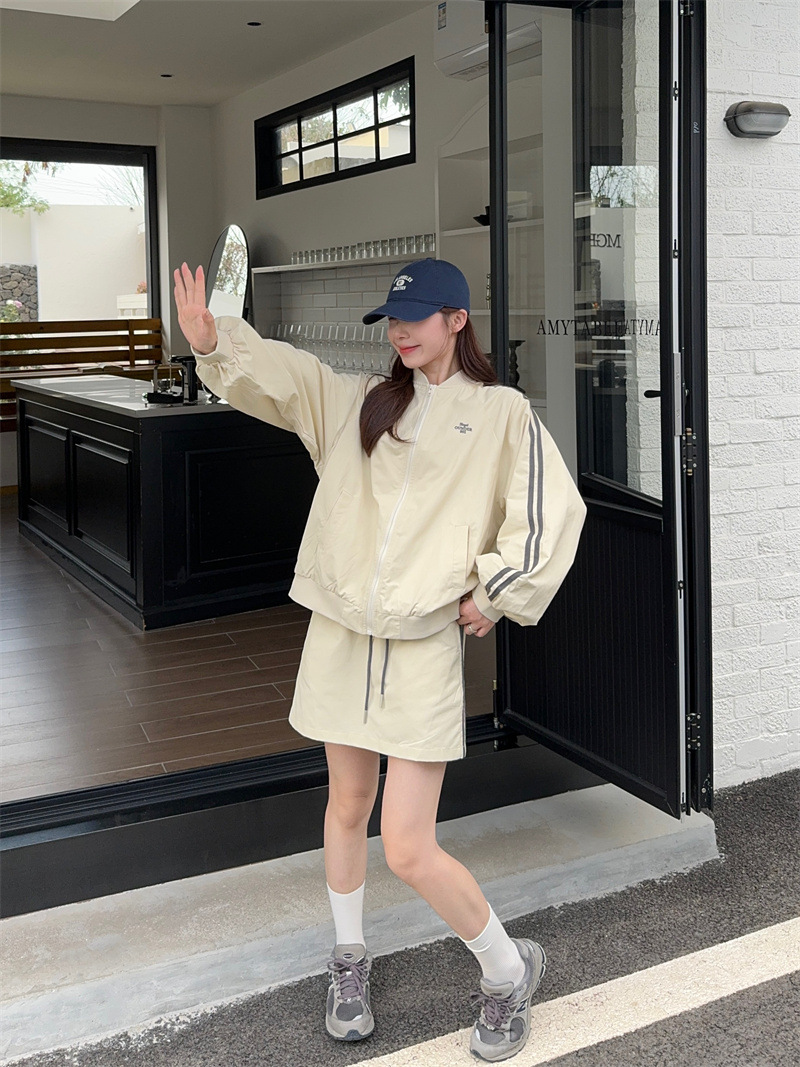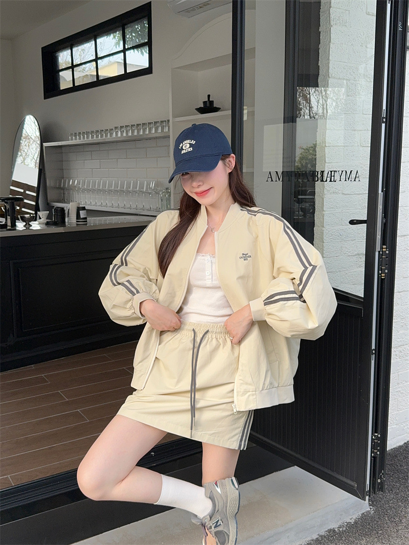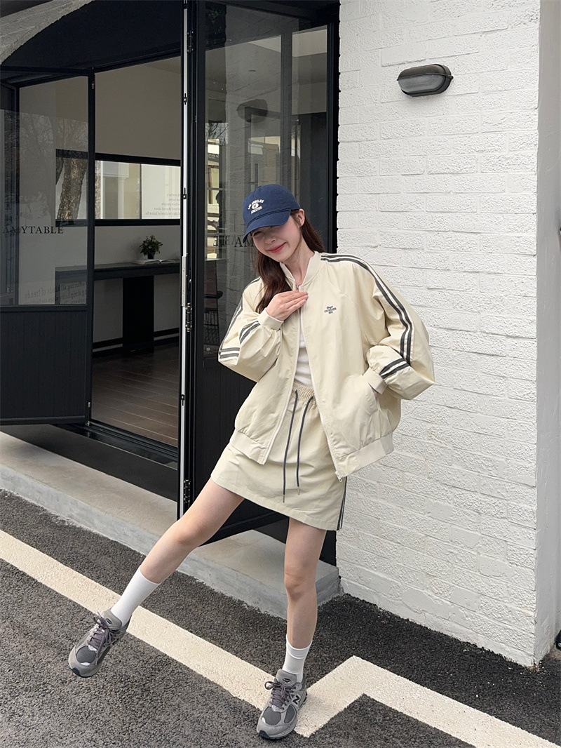 2025 새로운 캐주얼 스포츠 세트 여자 레트로 콘트라스트 야구 세트 재킷 봄 드로스트링 스커트 투피스 세트