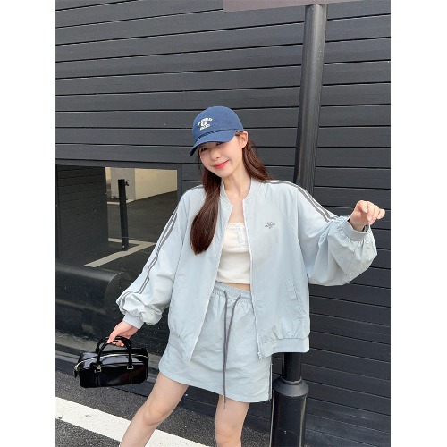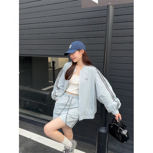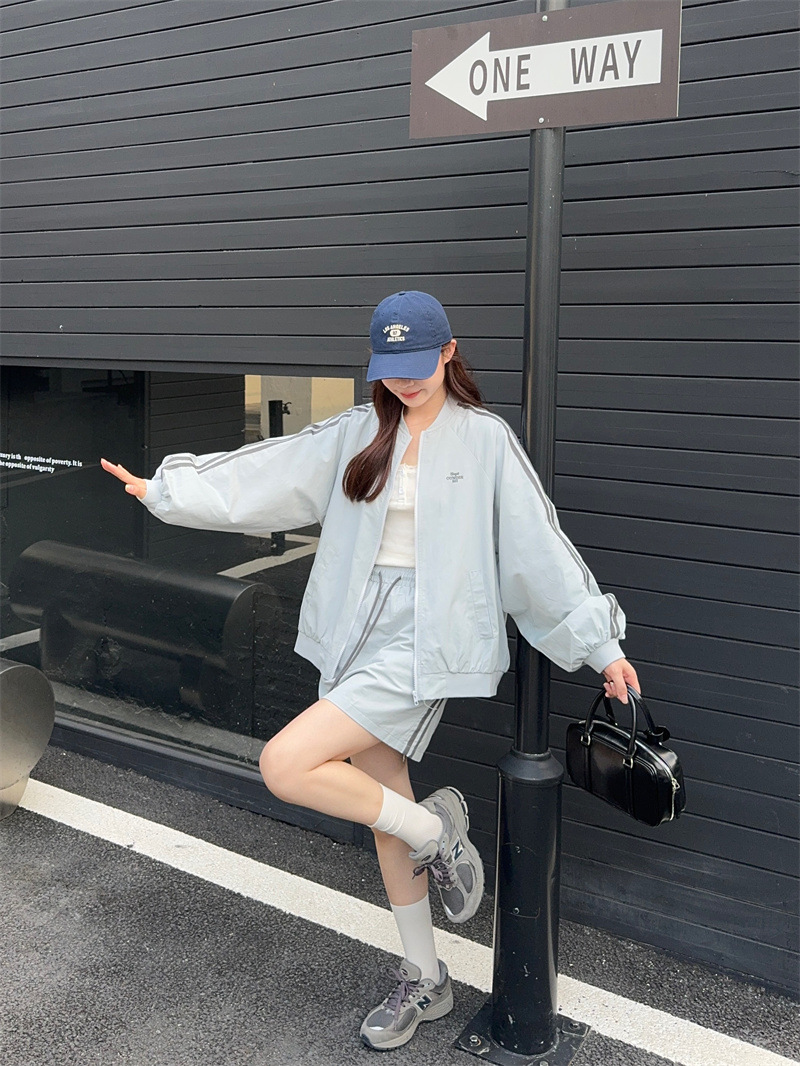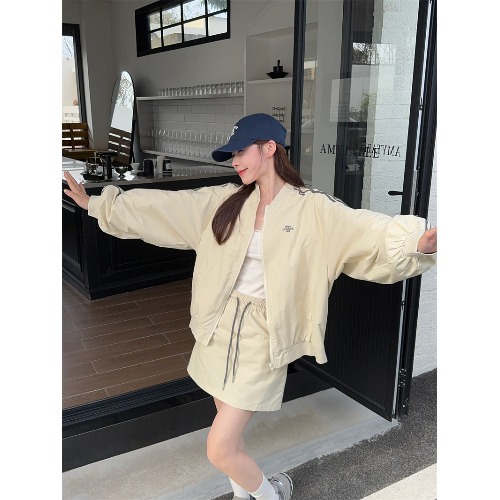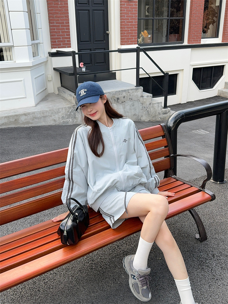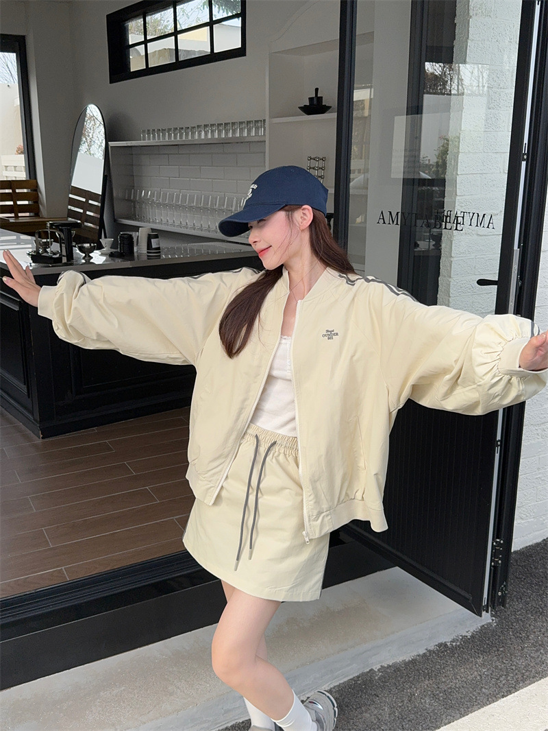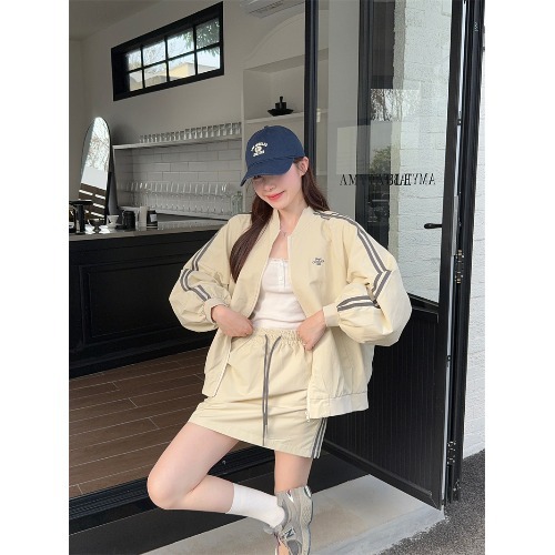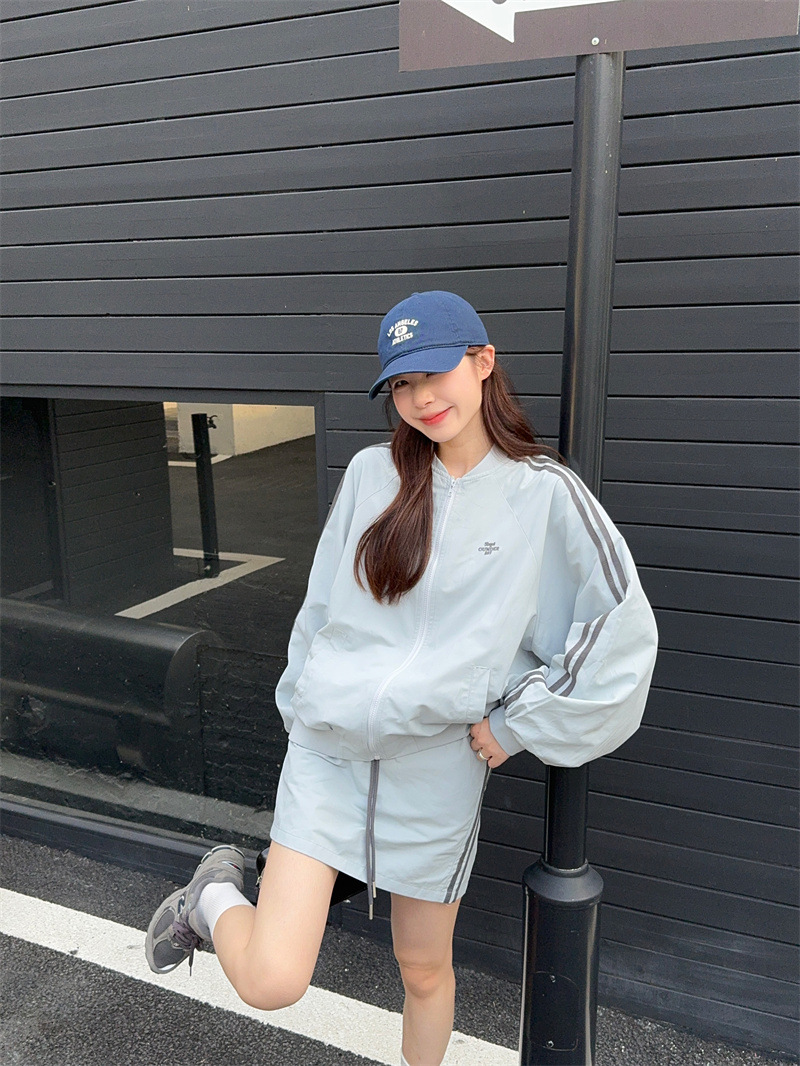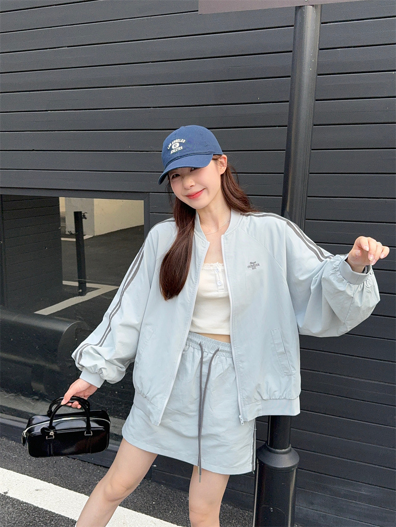2025 새로운 캐주얼 스포츠 세트 여자 레트로 콘트라스트 야구 세트 재킷 봄 드로스트링 스커트 투피스 세트