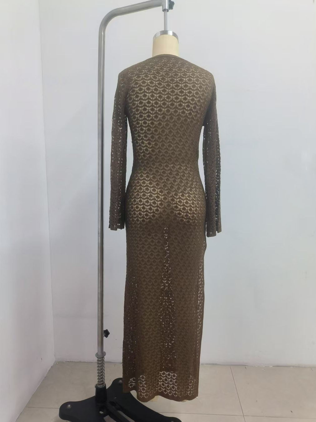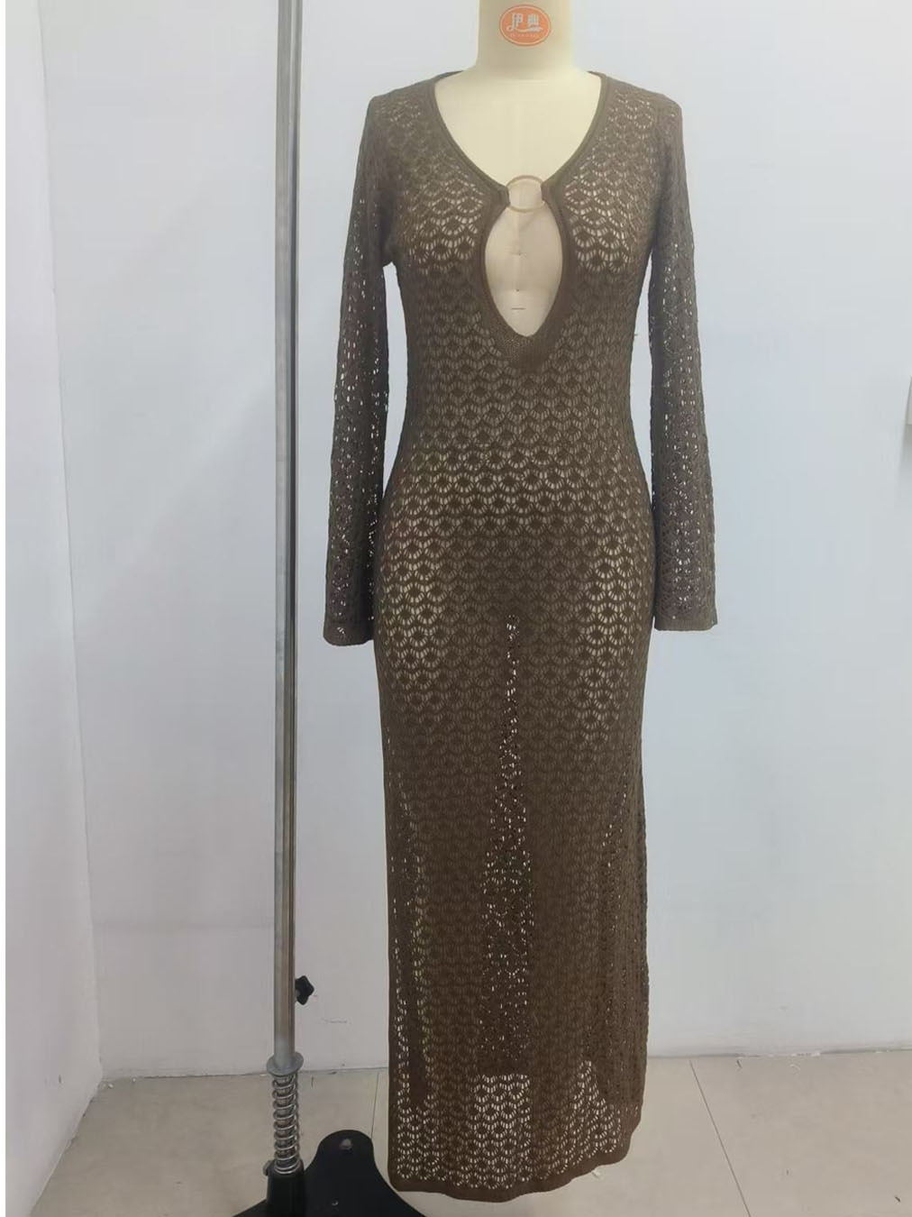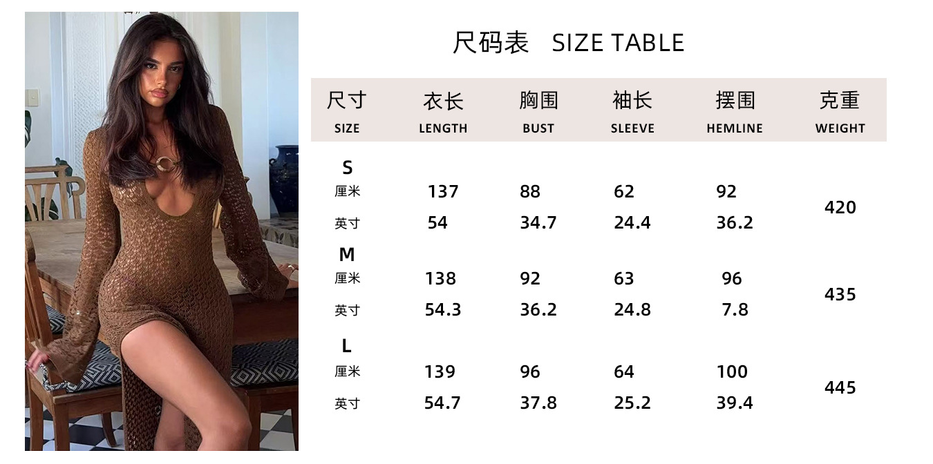 크로스보더 유럽 및 미국 여성복, 속이 비치는 니트 섹시 해변 휴가 스타일 원피스, 비치 드레스, 단색 커버업, 긴팔스토어 가기