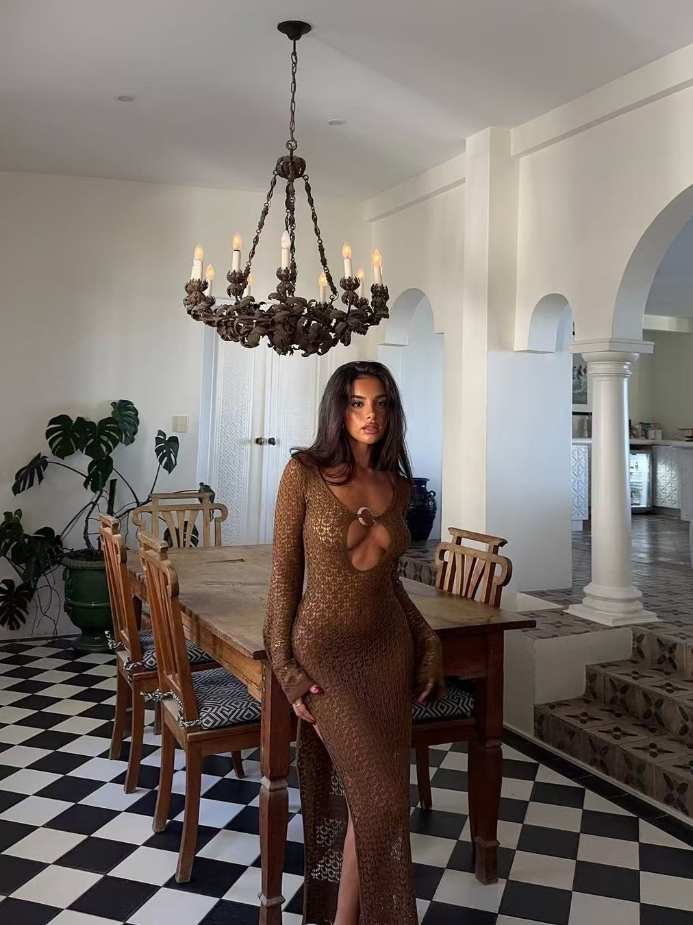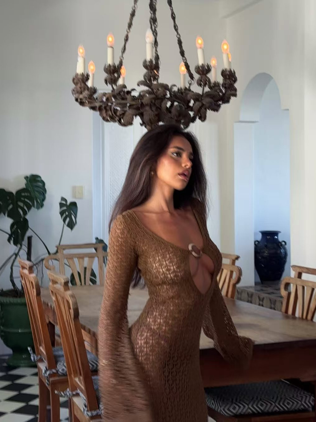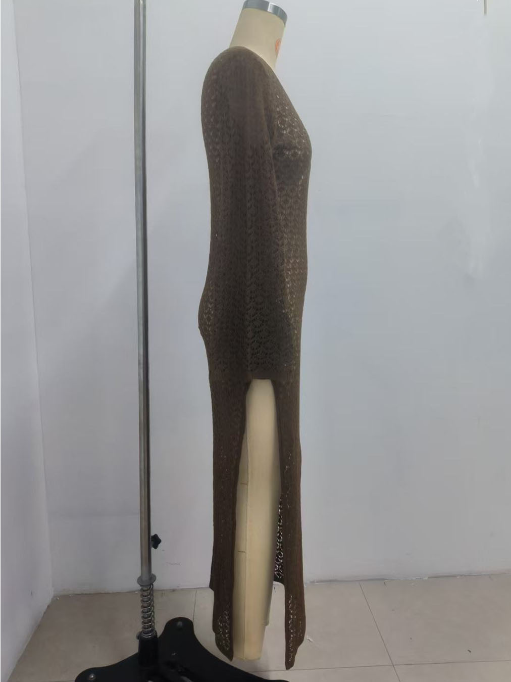 크로스보더 유럽 및 미국 여성복, 속이 비치는 니트 섹시 해변 휴가 스타일 원피스, 비치 드레스, 단색 커버업, 긴팔스토어 가기