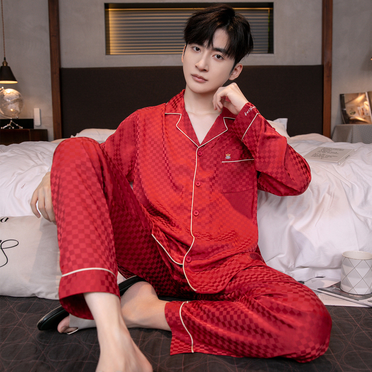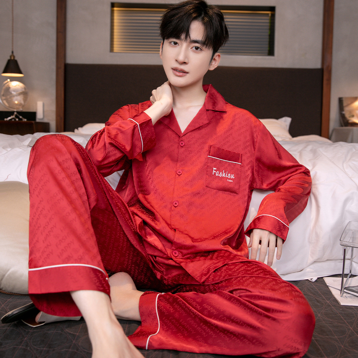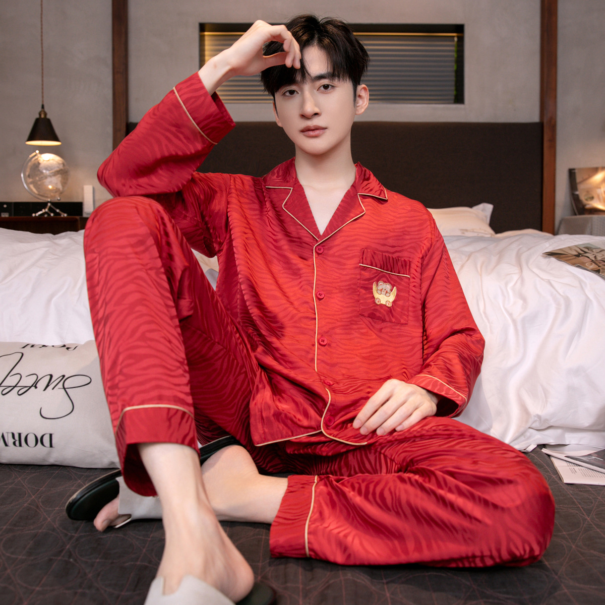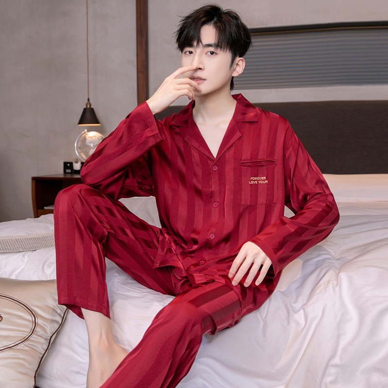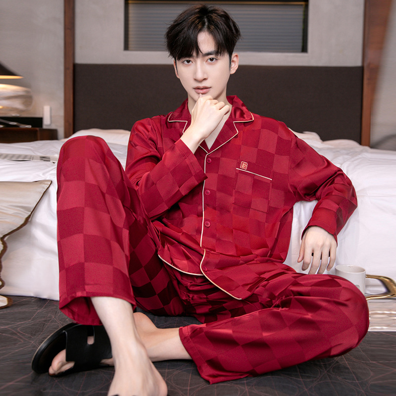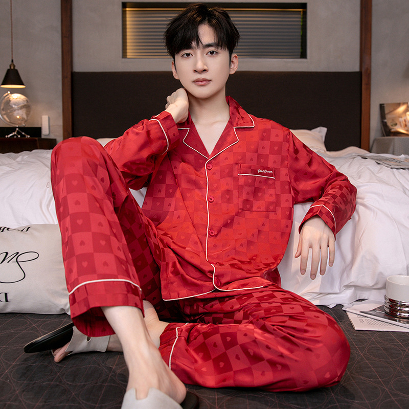 아이스 실크 잠옷 남성용 얇은 긴 소매 시뮬레이션 실크 동물 년 레드 플러스 사이즈 홈웨어 세트스토어 가기