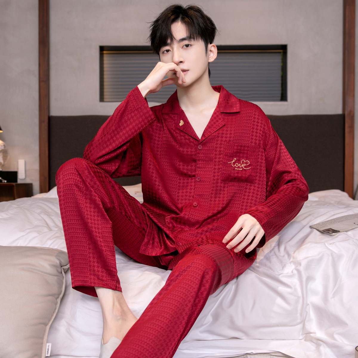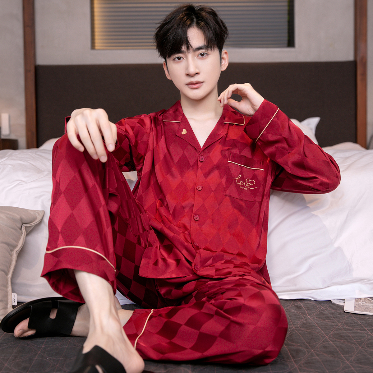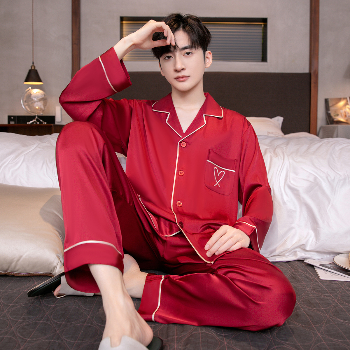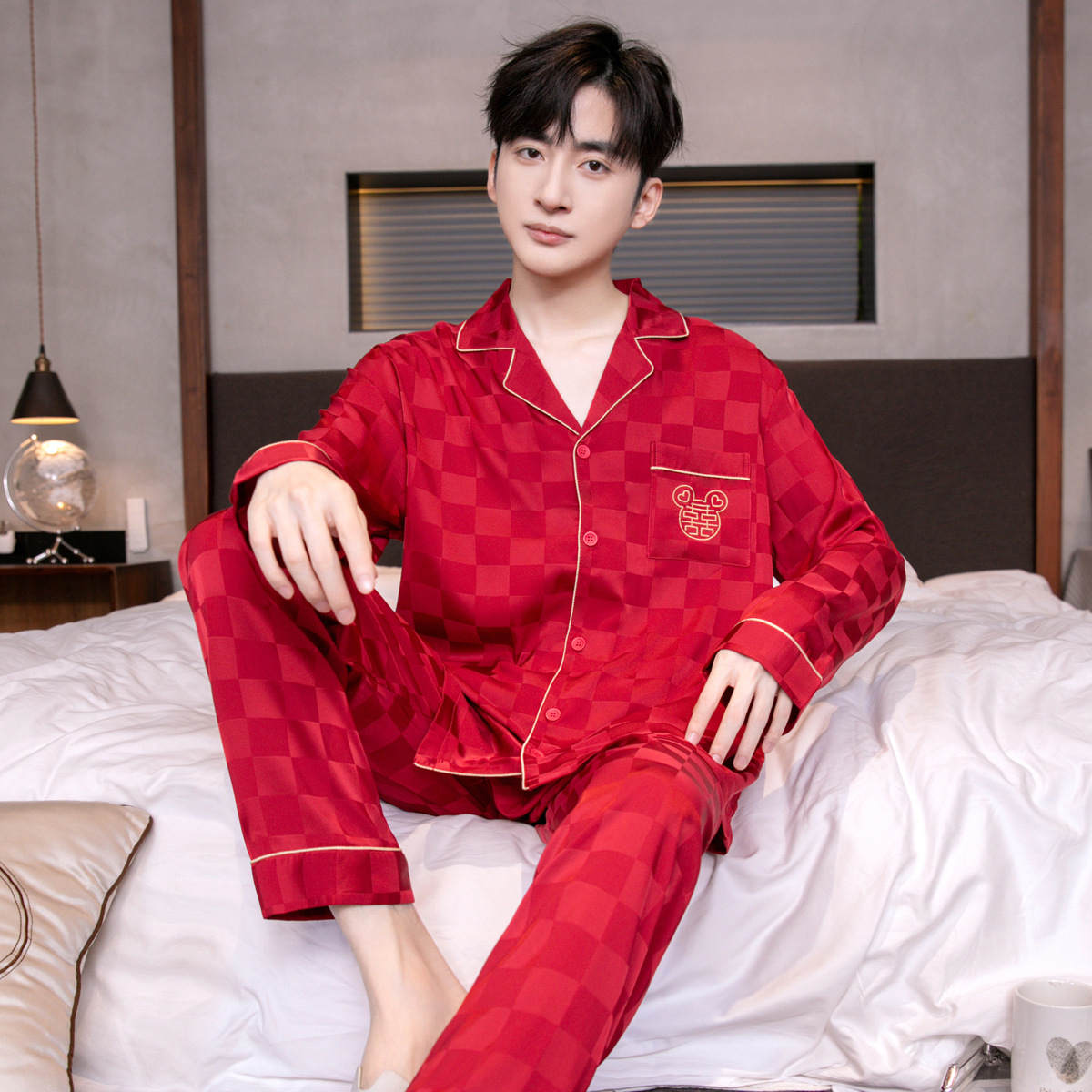 아이스 실크 잠옷 남성용 얇은 긴 소매 시뮬레이션 실크 동물 년 레드 플러스 사이즈 홈웨어 세트스토어 가기