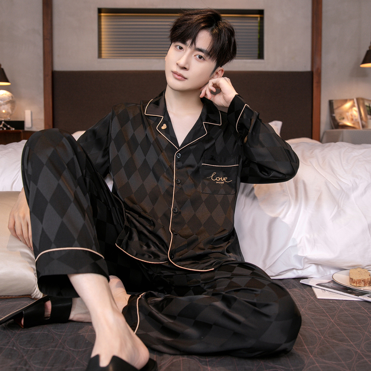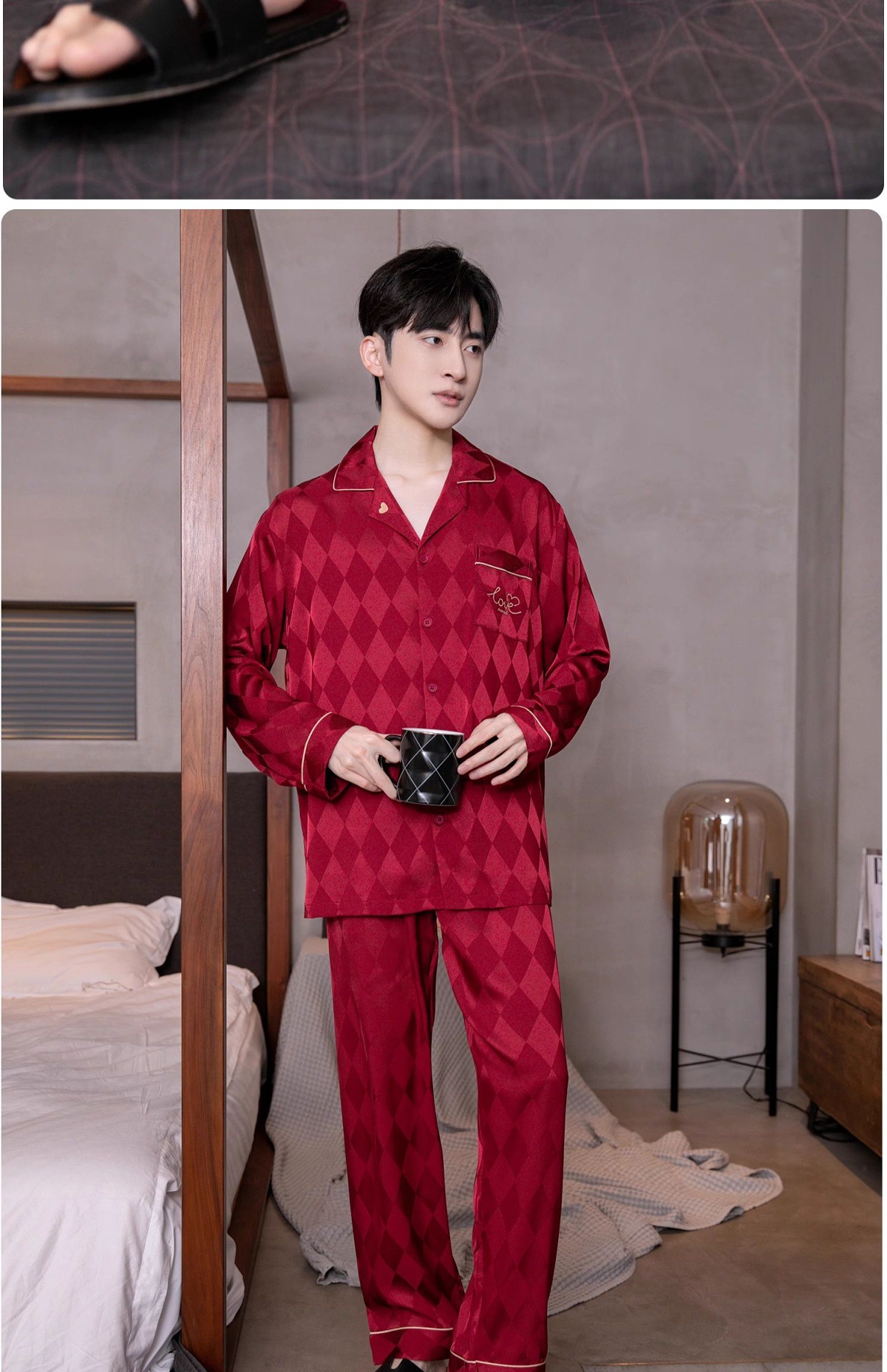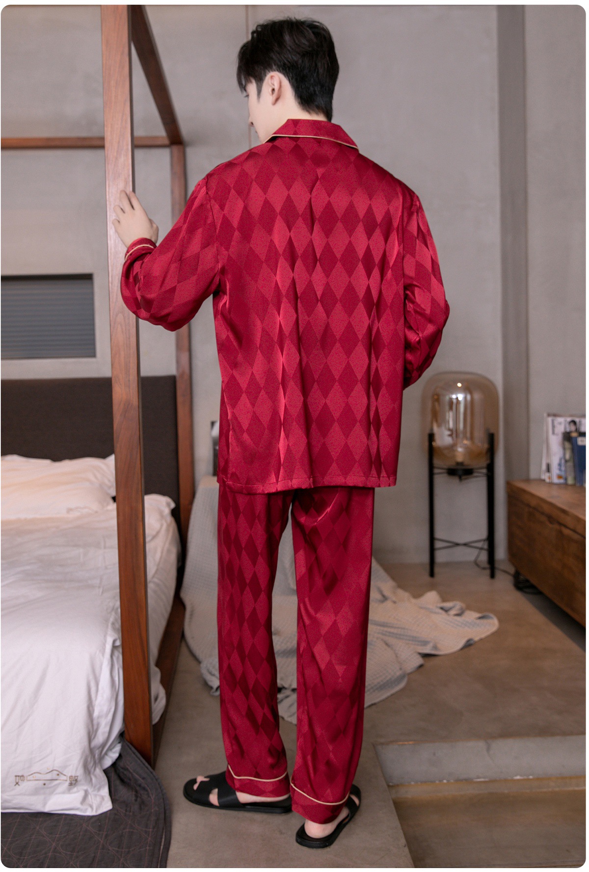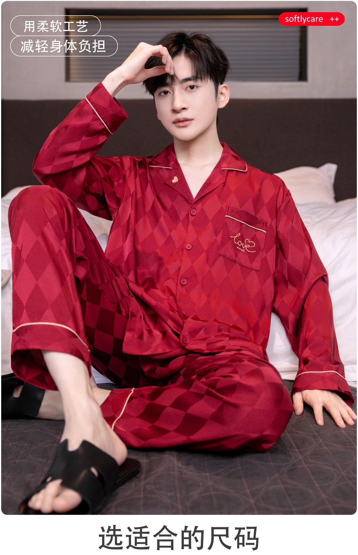 아이스 실크 잠옷 남성용 얇은 긴 소매 시뮬레이션 실크 동물 년 레드 플러스 사이즈 홈웨어 세트스토어 가기