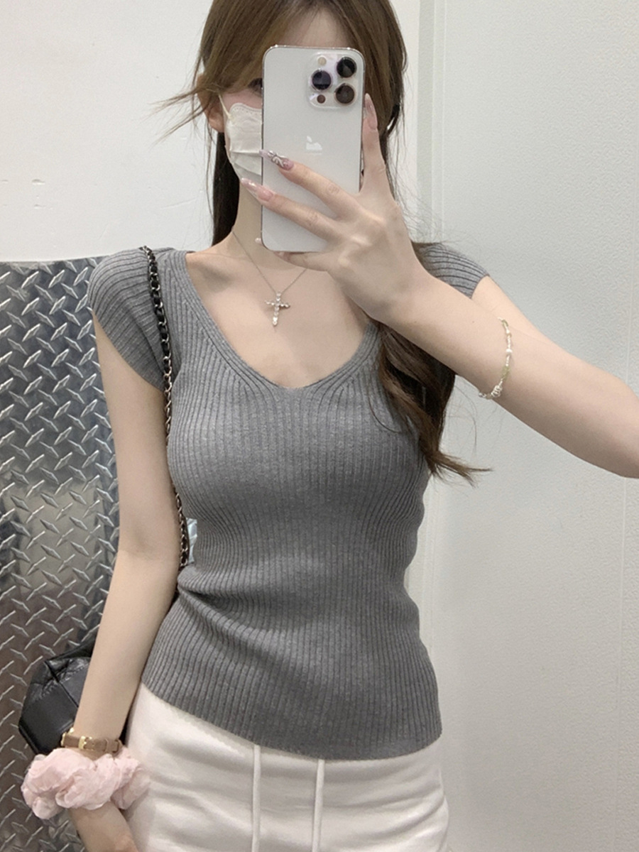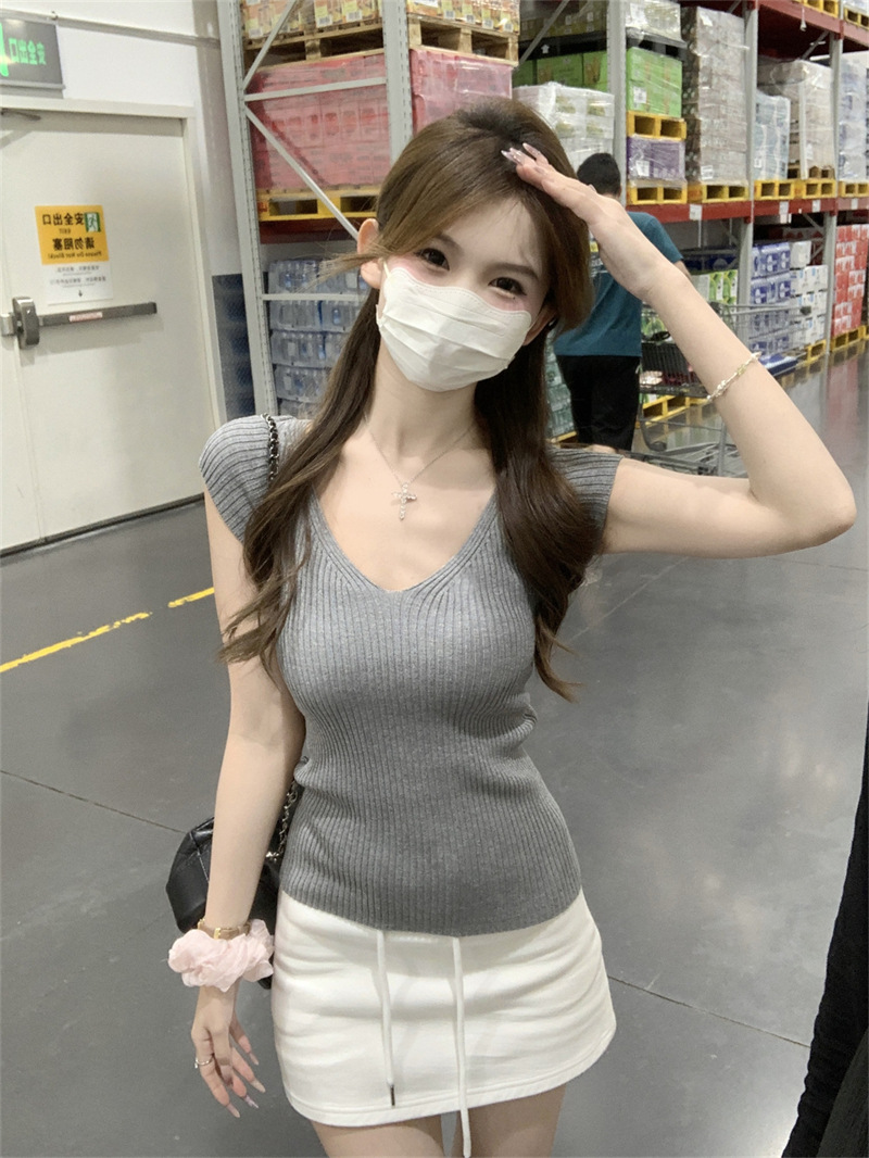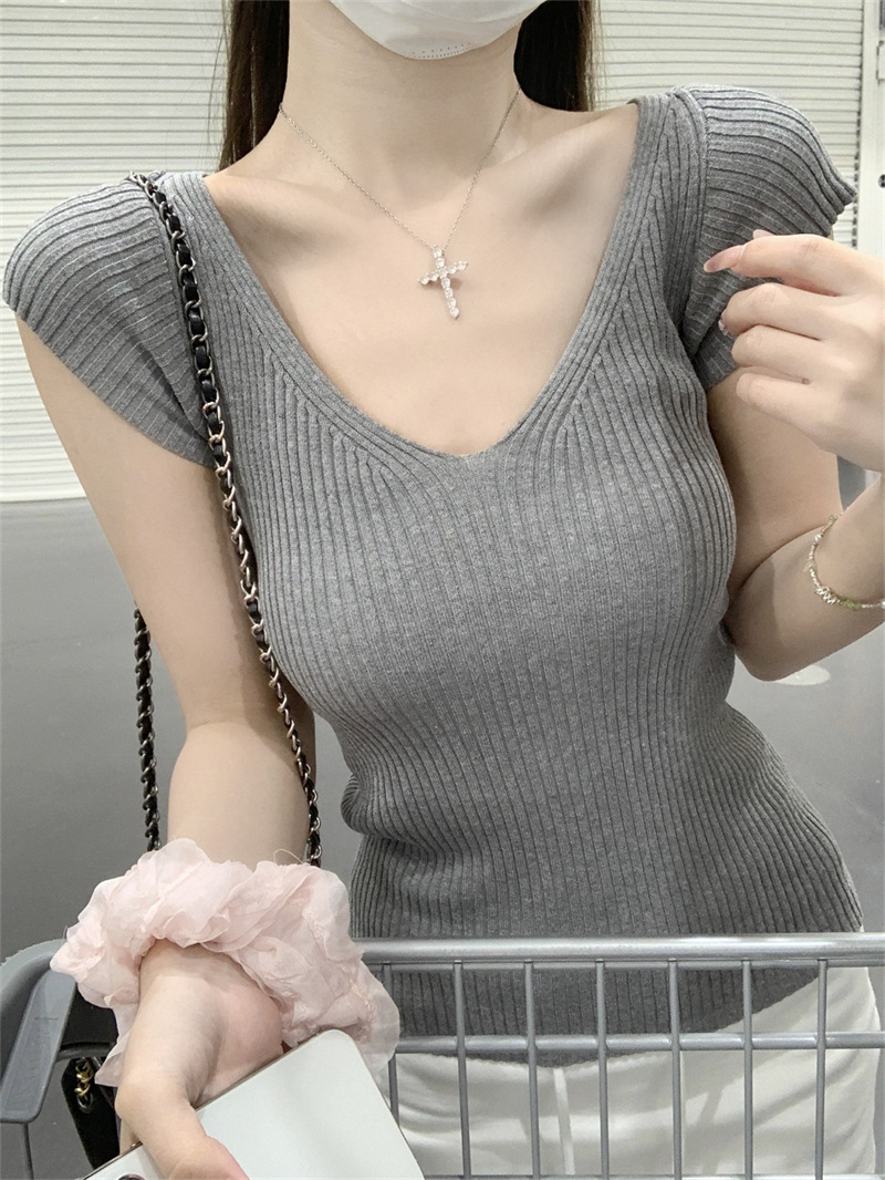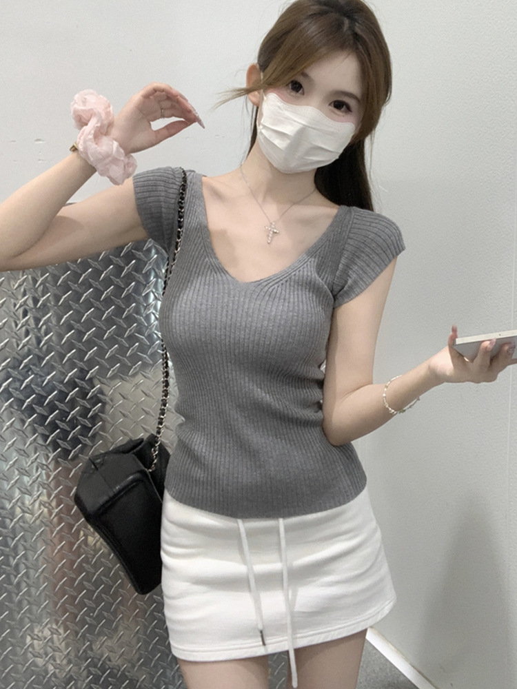 # 두 V-넥 # 가슴 공개 큰 허리 작은 스파이스 소녀 플라잉 슬리브 아이스 실크 짧은 소매 여성용 여름 피트 니트 티셔츠 순수 욕망 탑스토어 가기