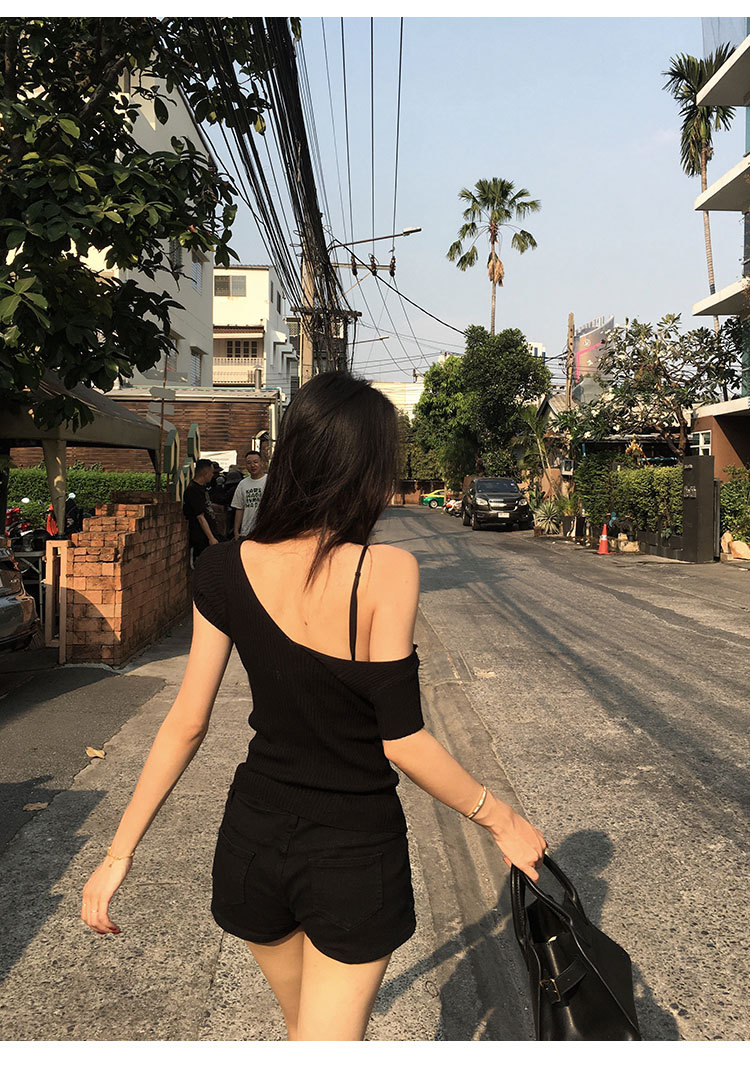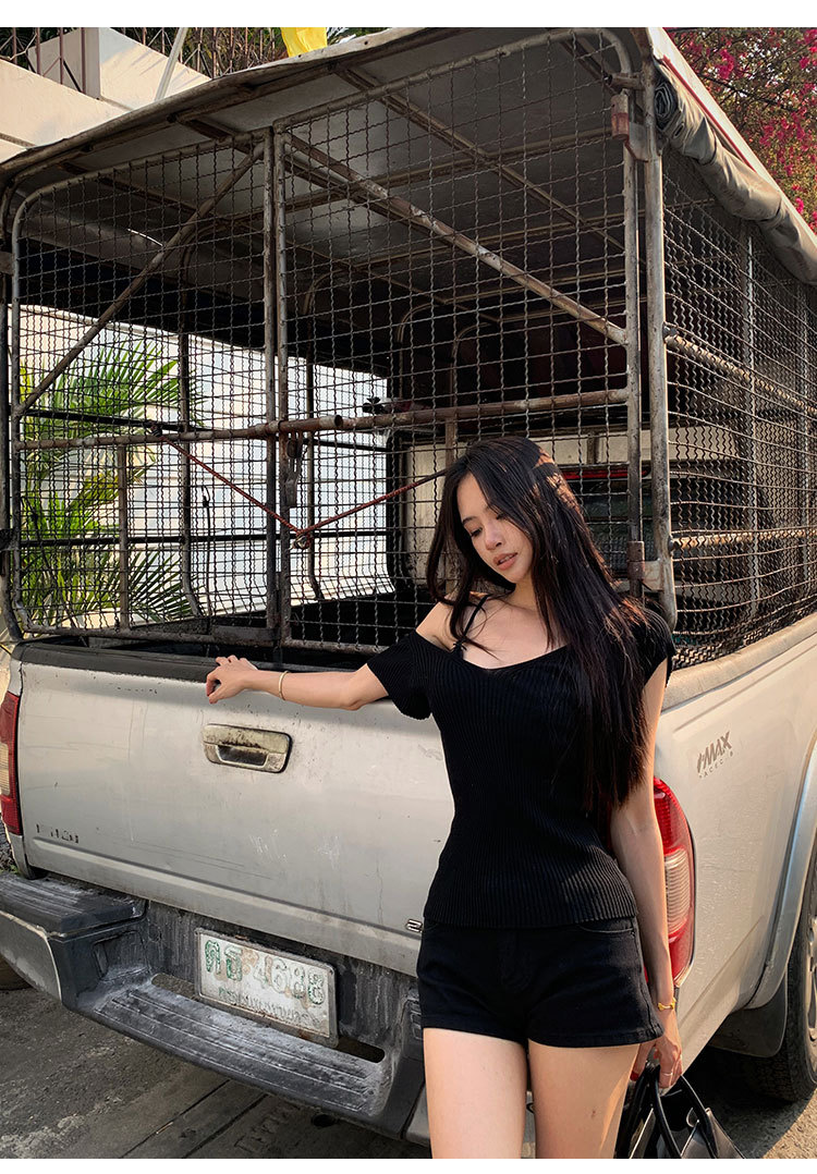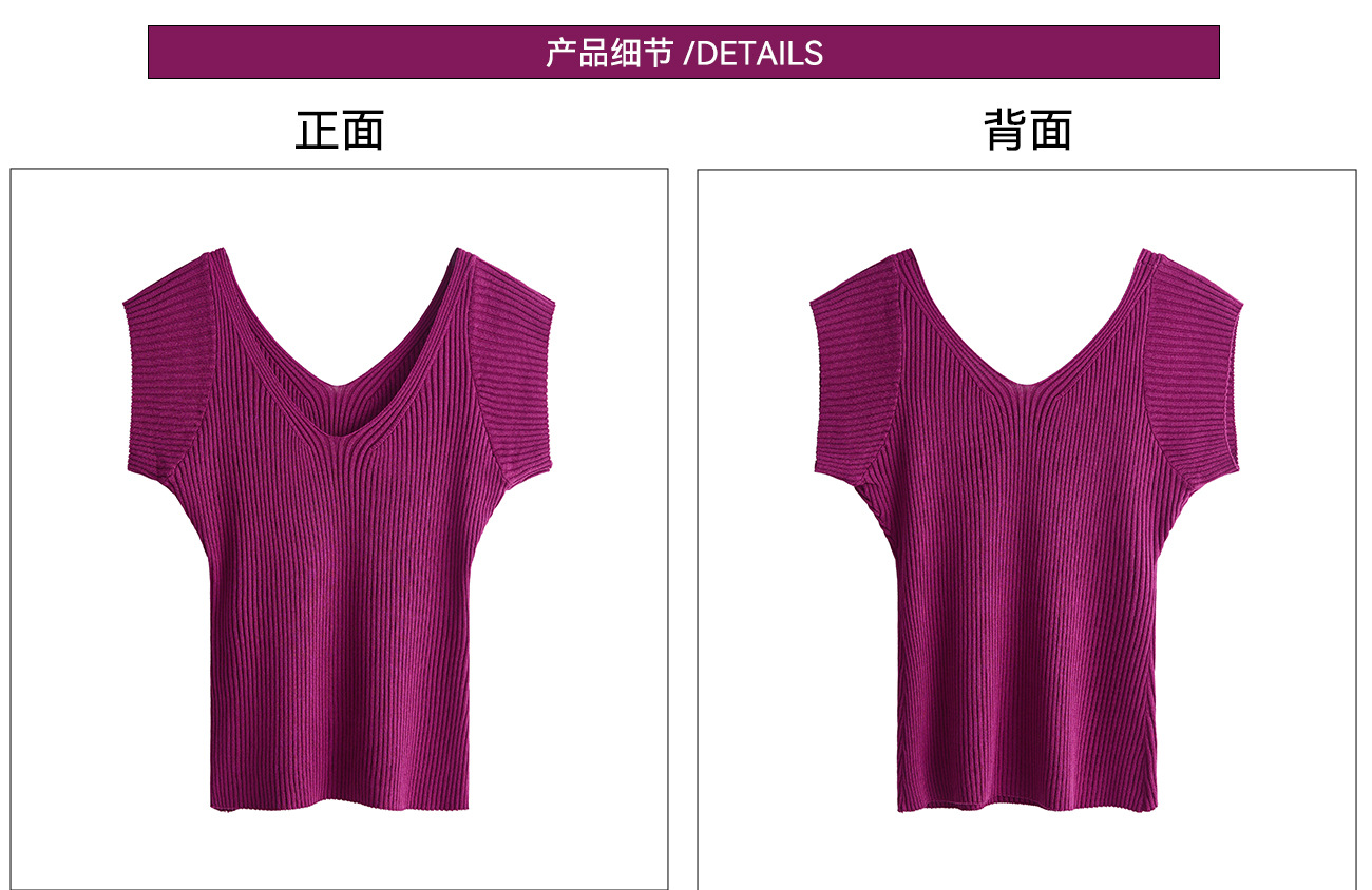 # 두 V-넥 # 가슴 공개 큰 허리 작은 스파이스 소녀 플라잉 슬리브 아이스 실크 짧은 소매 여성용 여름 피트 니트 티셔츠 순수 욕망 탑스토어 가기