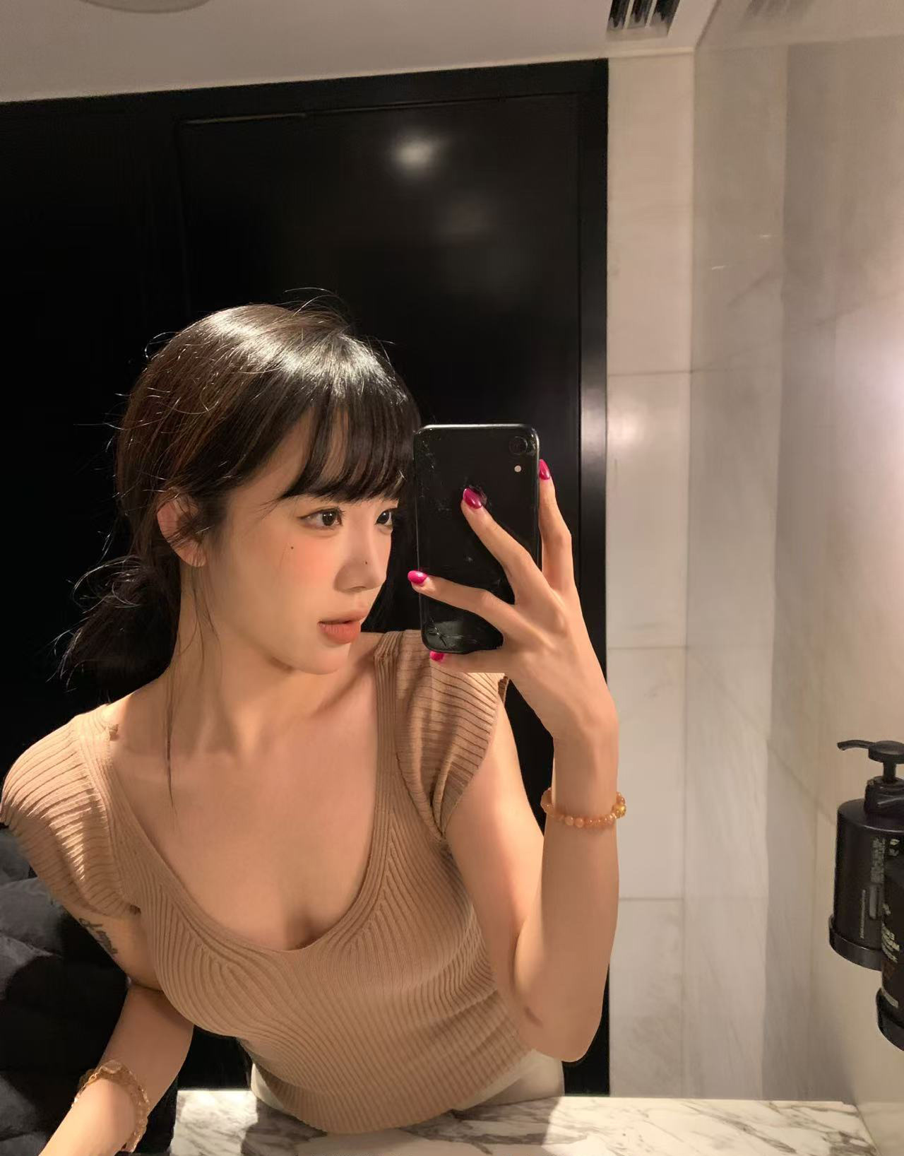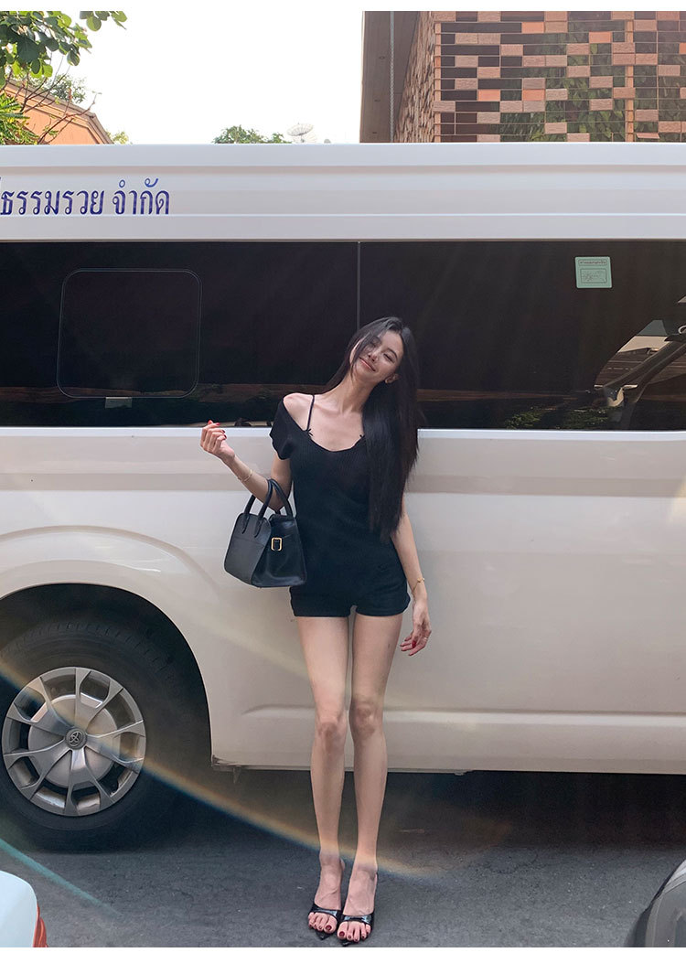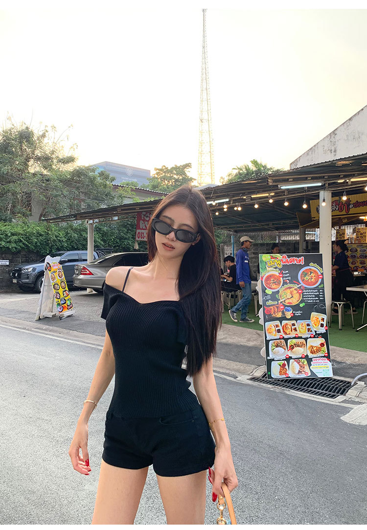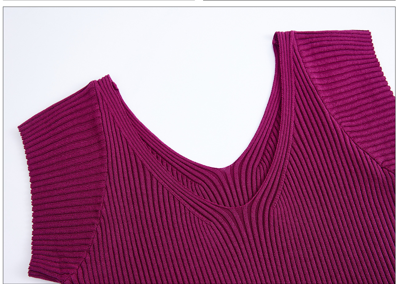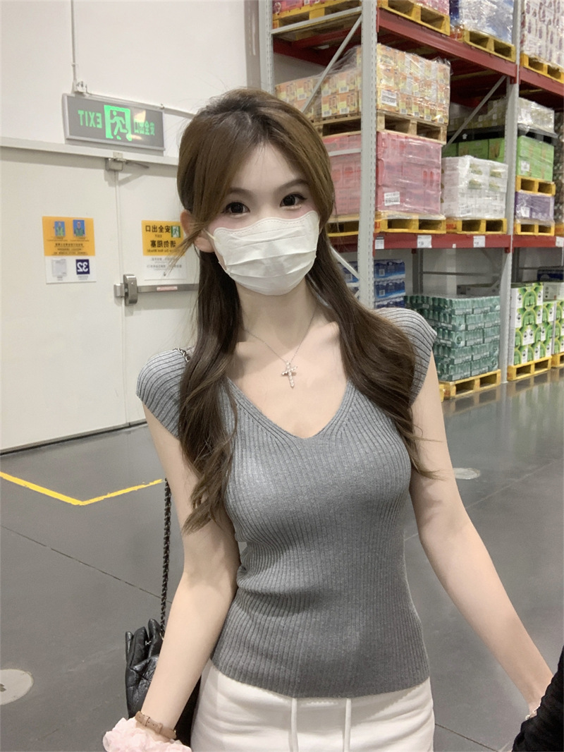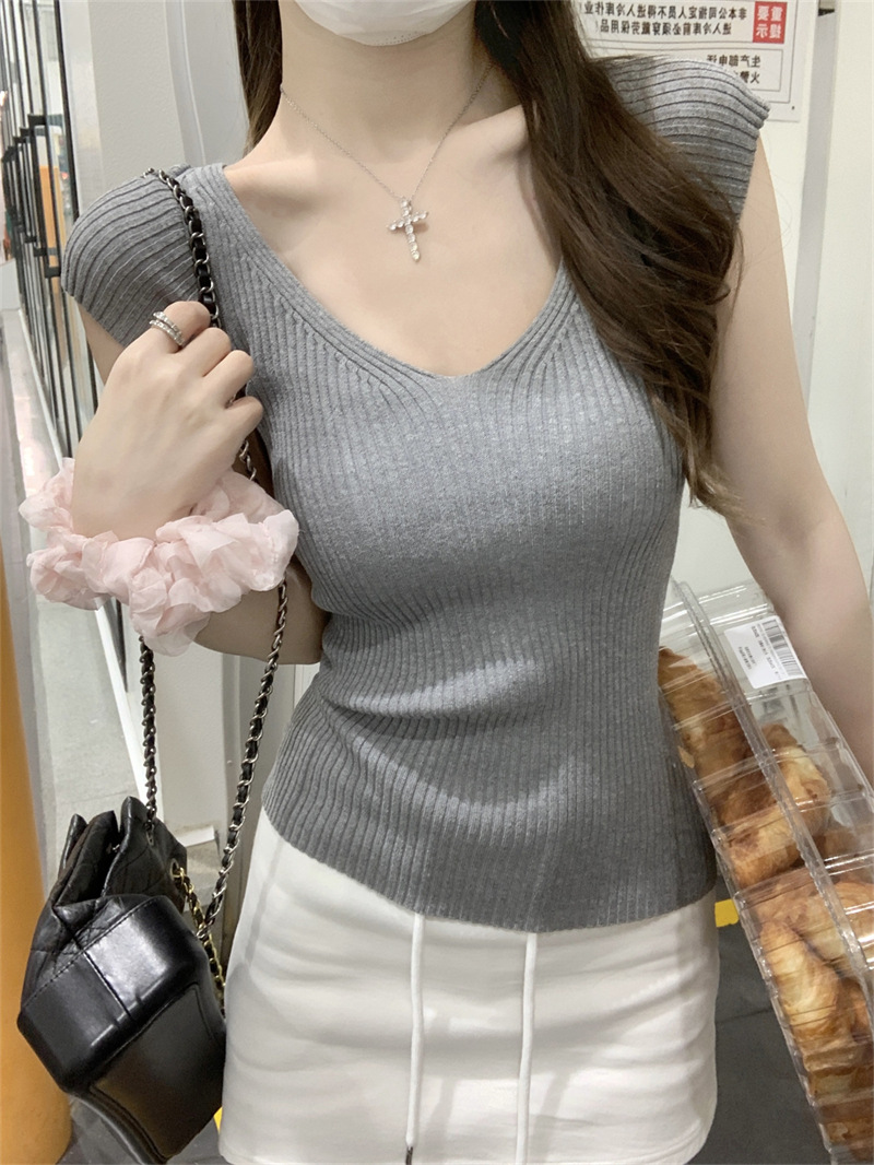 # 두 V-넥 # 가슴 공개 큰 허리 작은 스파이스 소녀 플라잉 슬리브 아이스 실크 짧은 소매 여성용 여름 피트 니트 티셔츠 순수 욕망 탑