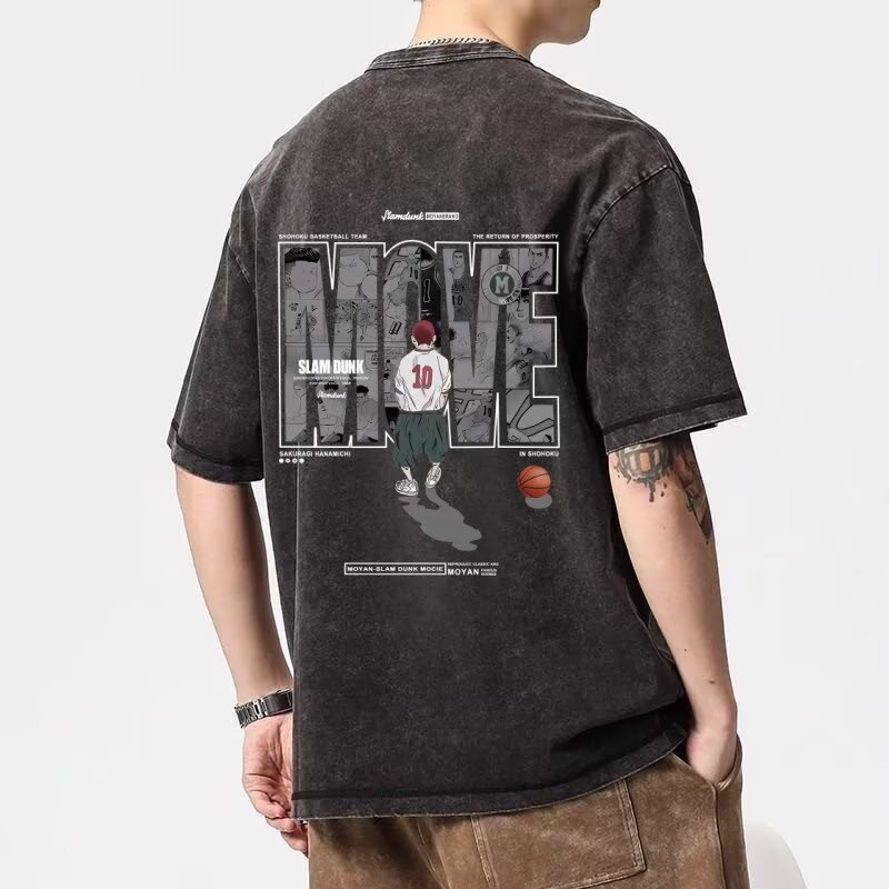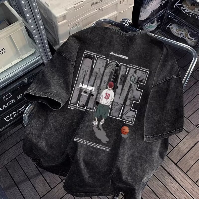 대외 무역 여름 우유 실크 오래된 농구 만화 프린트 셔츠 홍콩 스타일 패션 청소년 트렌드 통기성 남성 반팔
